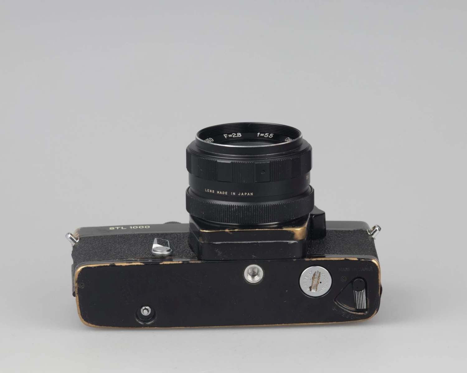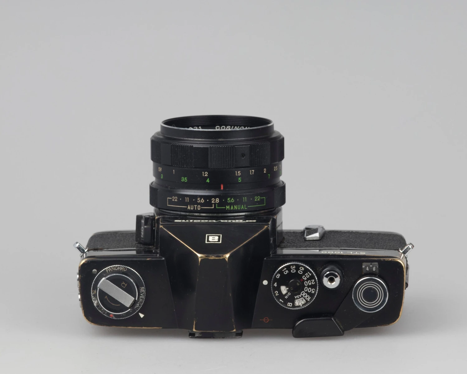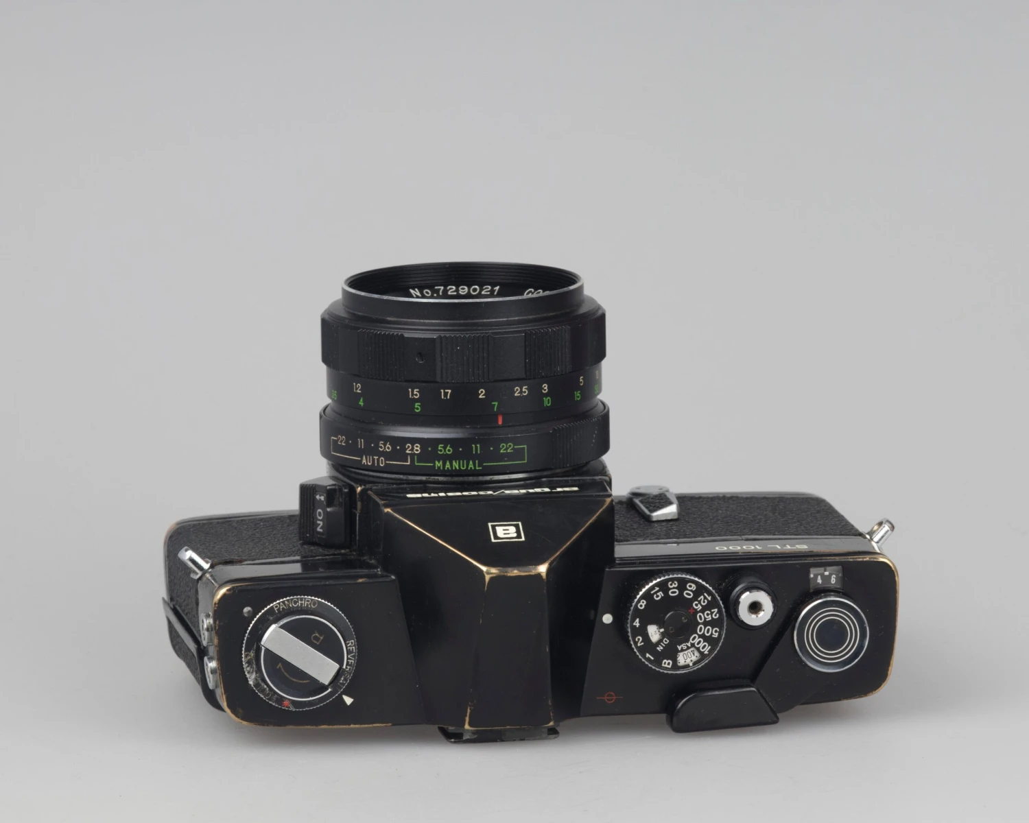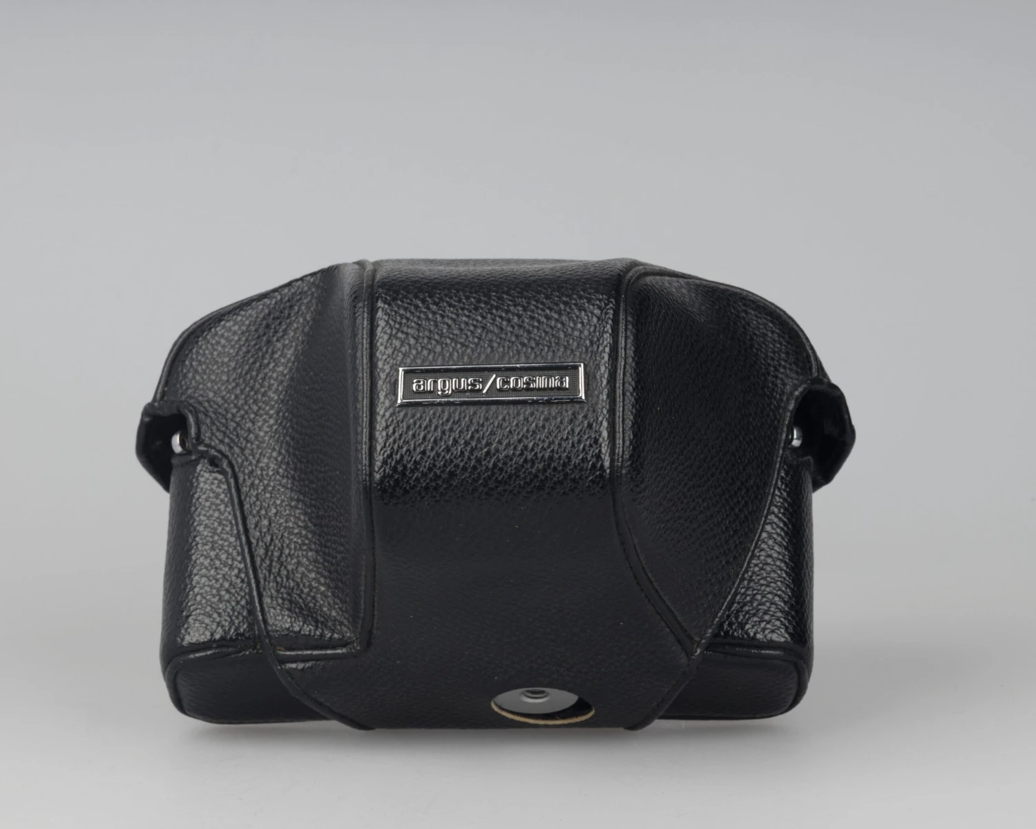This is a nice, tank-like SLR that uses the very common M42 lens mount (used in Pentax Spotmatic SLRs and many other types). It’s in great working condition. All shutter speeds are working with good accuracy. It includes a sharp Auto Cosinon 55mm F2.8 lens that is in very good condition. A leather half-case is also included.