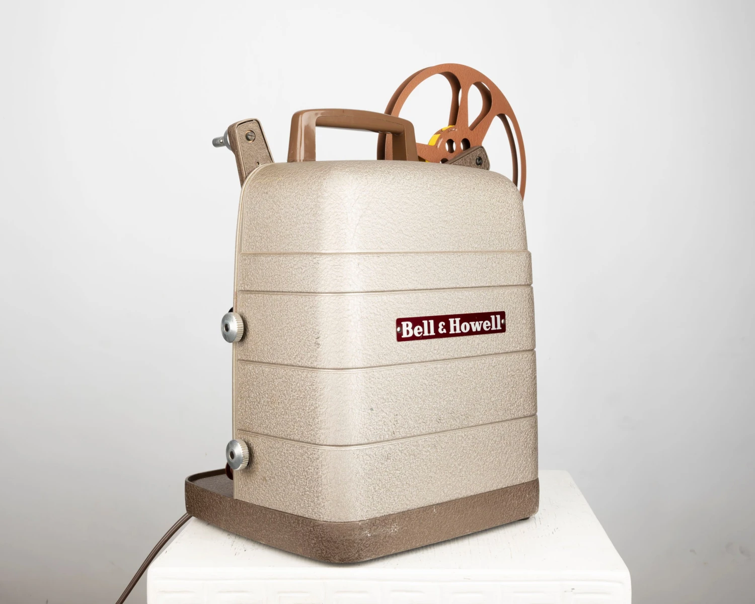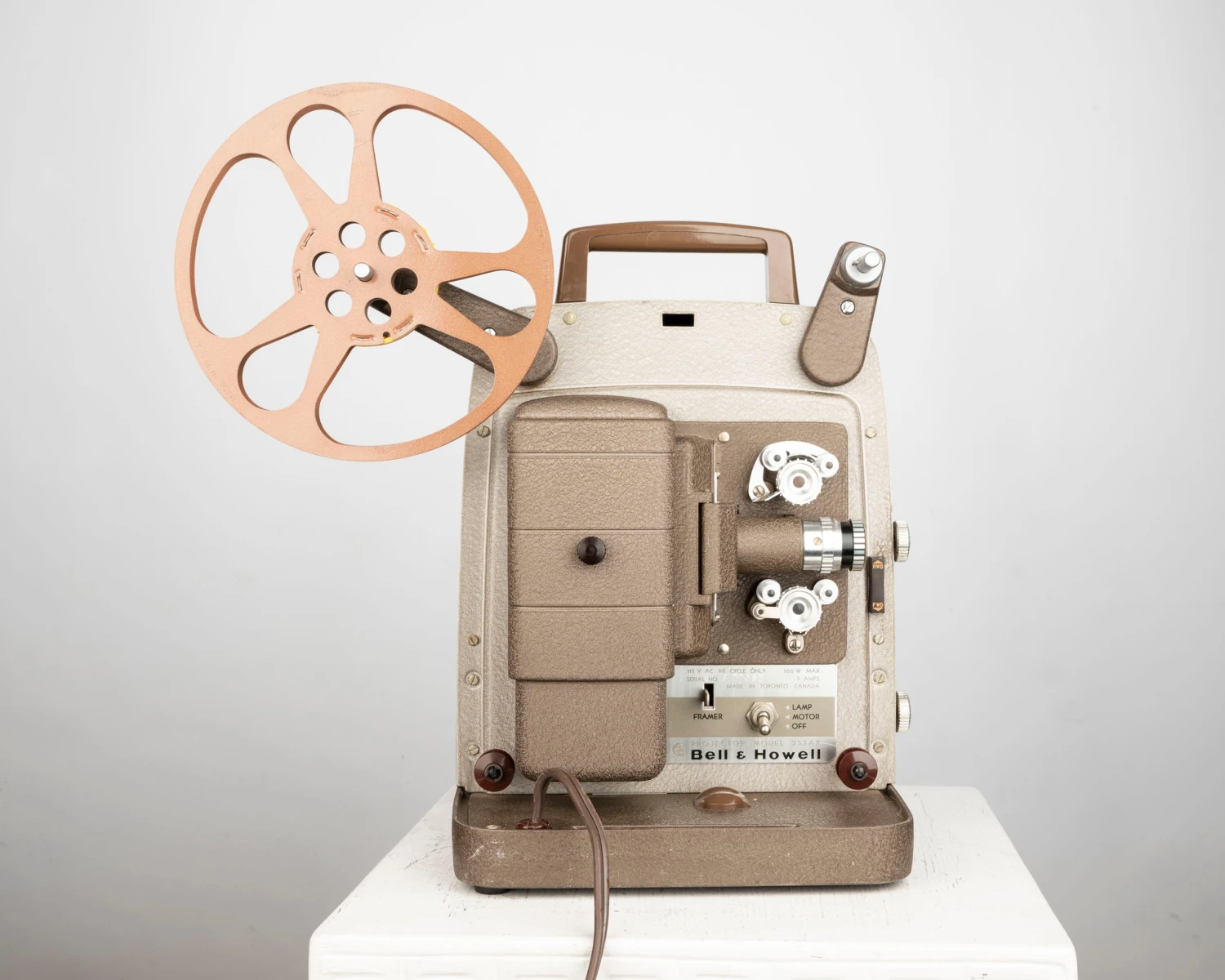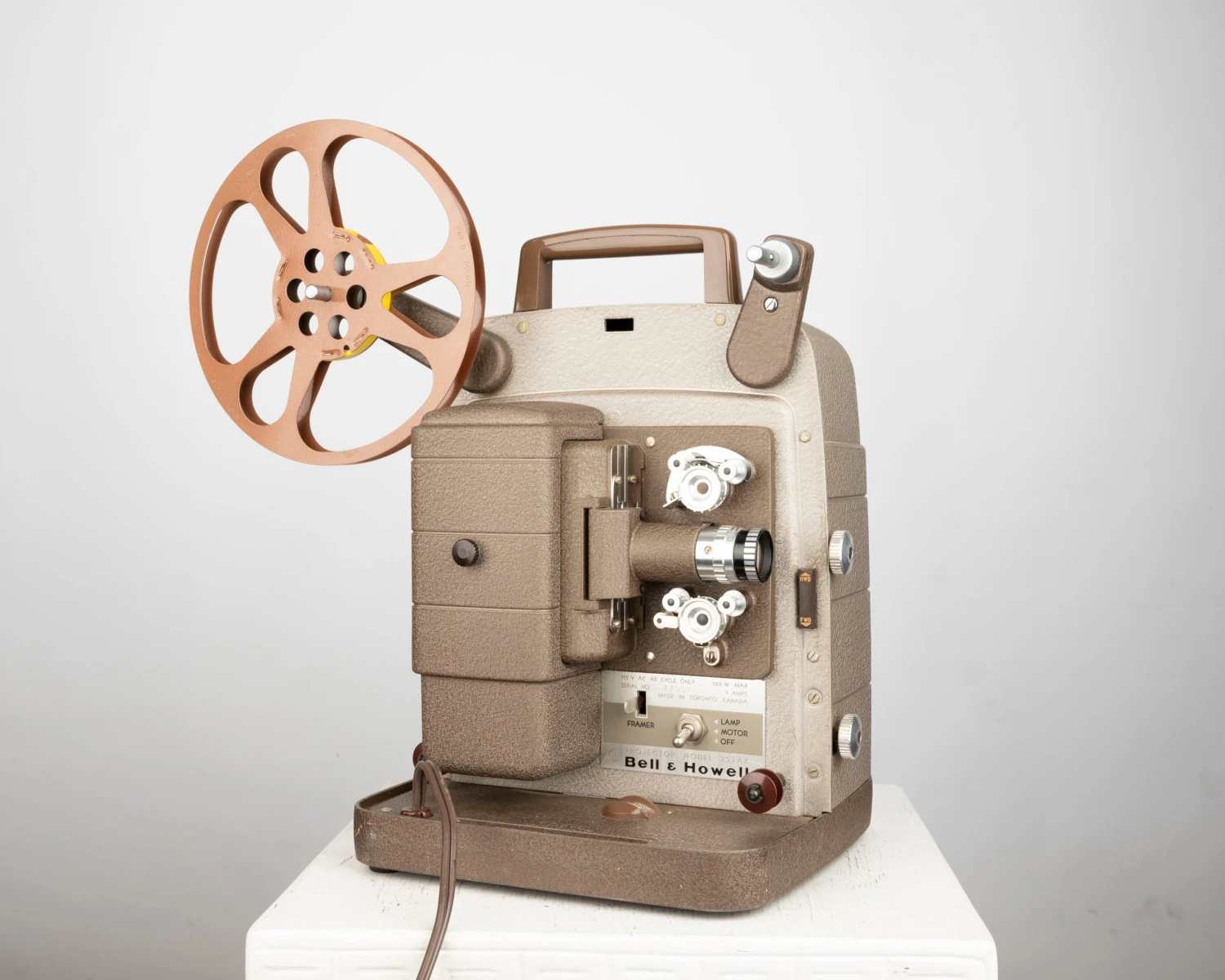 We couldn’t find any information online but this made in Canada projector appears to be identical to the American-made Bell and Howell 253 R.