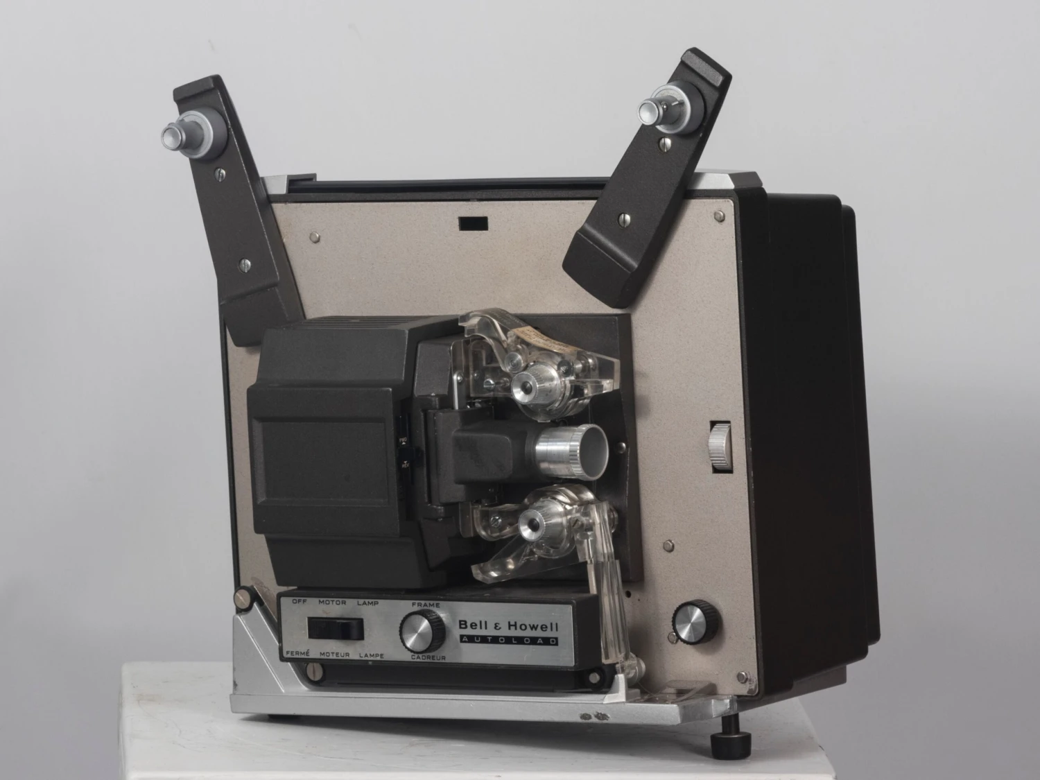 This projector was tested with a super 8 movie reel and is running well with the exception of it being quite noisy in reverse/rewind; this noise doesn’t seem to affect the performance. It is also missing the logo decal on the lamp housing (very common with Bell and Howell projectors).