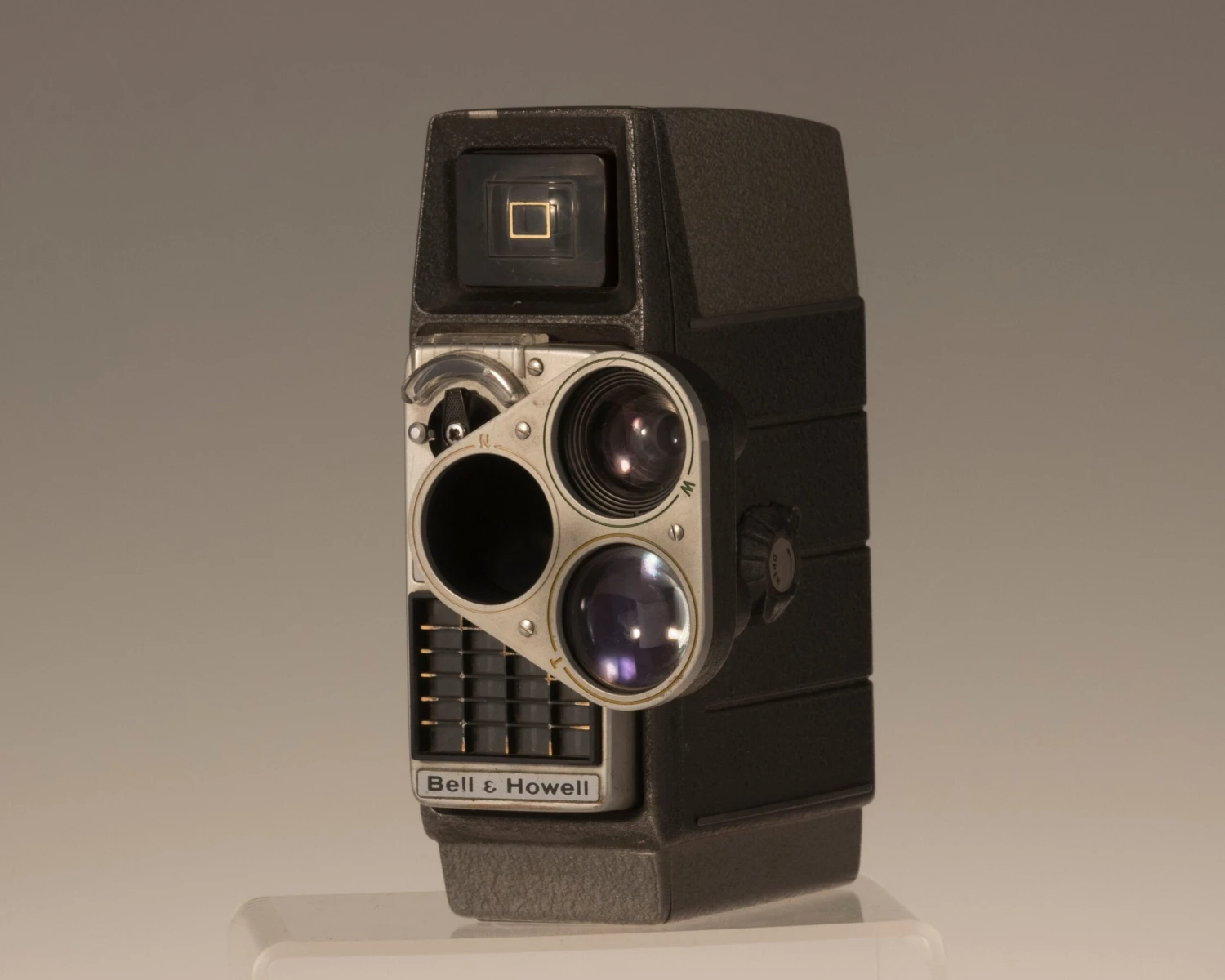 The Bell and Howell Electronic Eye model 393 is a vintage 8mm movie camera featuring a three lens turret with 10mm f1.8, 6.5mm f.1.8, and 25mm f1.8 options.