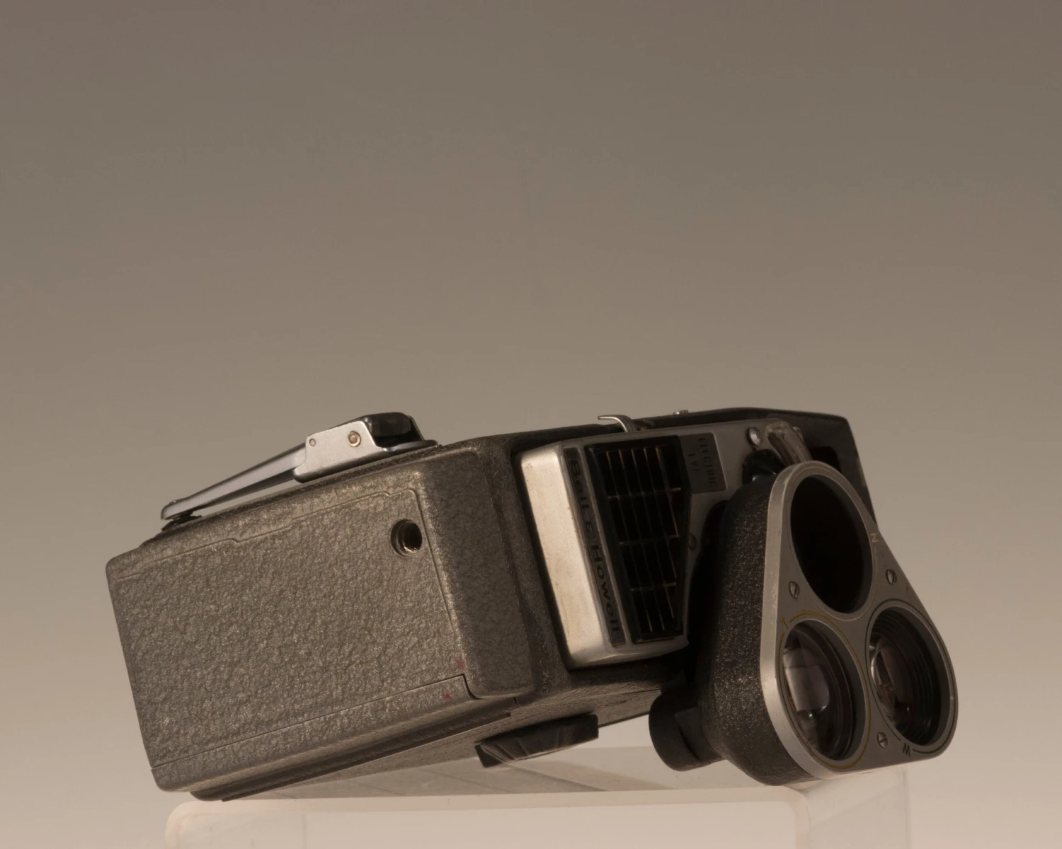 The camera offers both automatic (ISO 10-40) and manual exposure (the equivalent shutter speed is 1/35 sec. if you’re using an external light meter). The camera is a fully mechanical with a selenium light meter for its ‘Electronic Eye’ so no batteries are necessary. We recommend Fomapan R100 as an affordable, still-being-made double 8mm film for use this this camera.