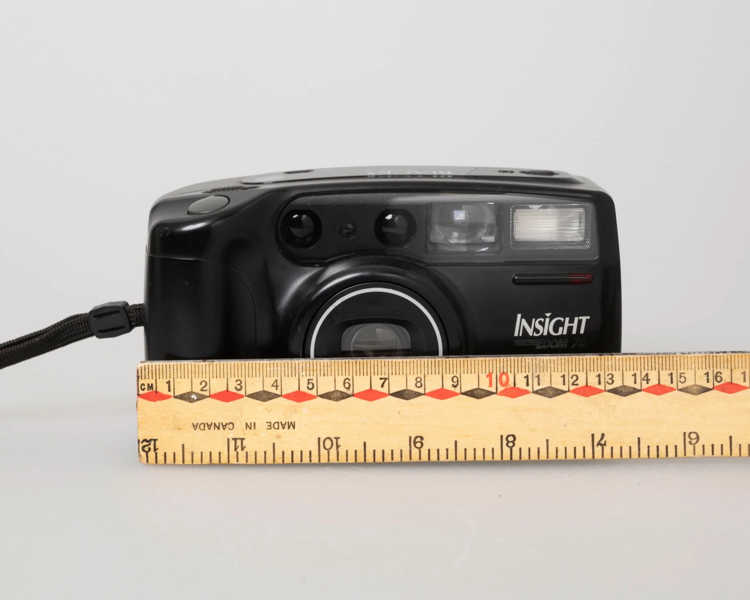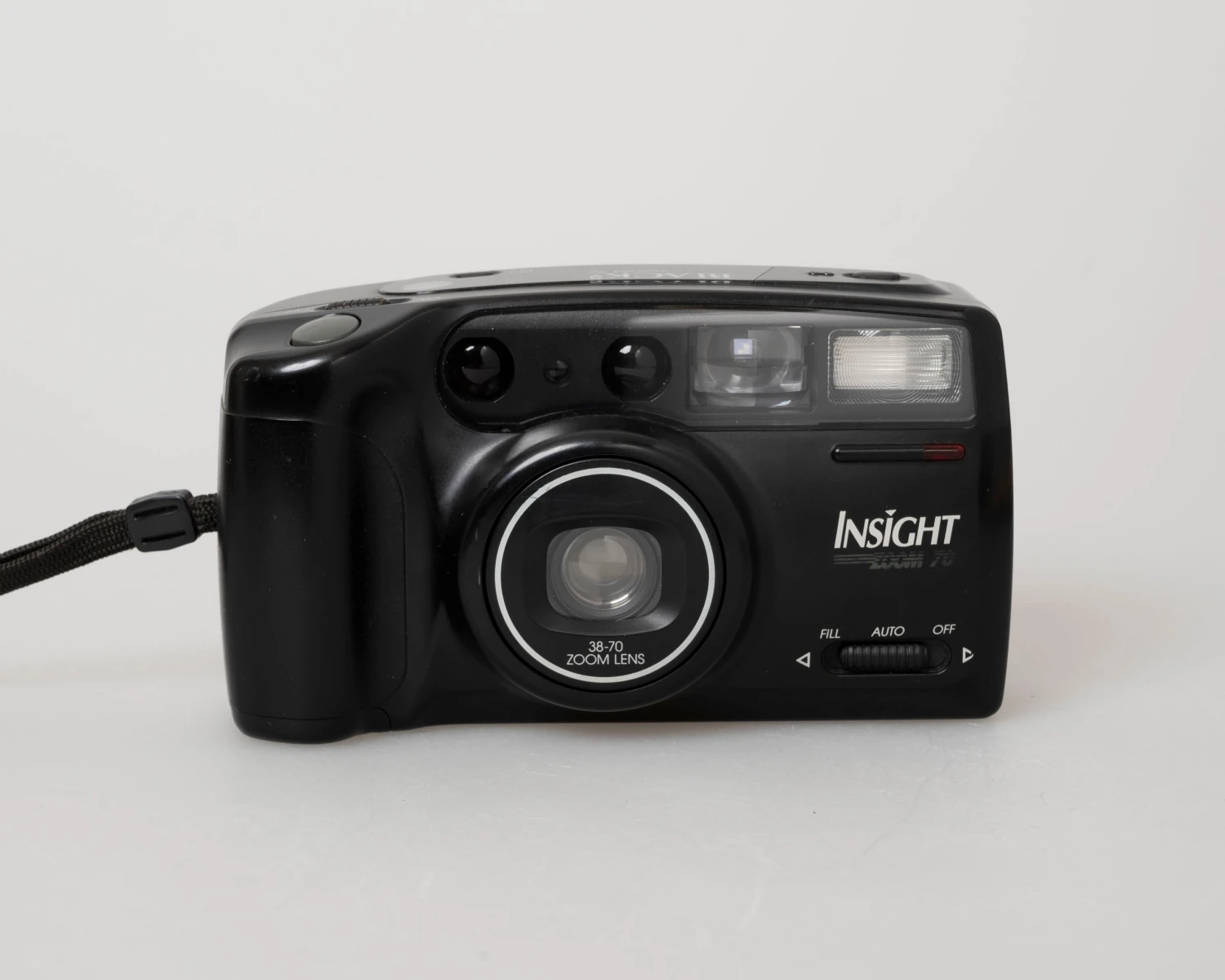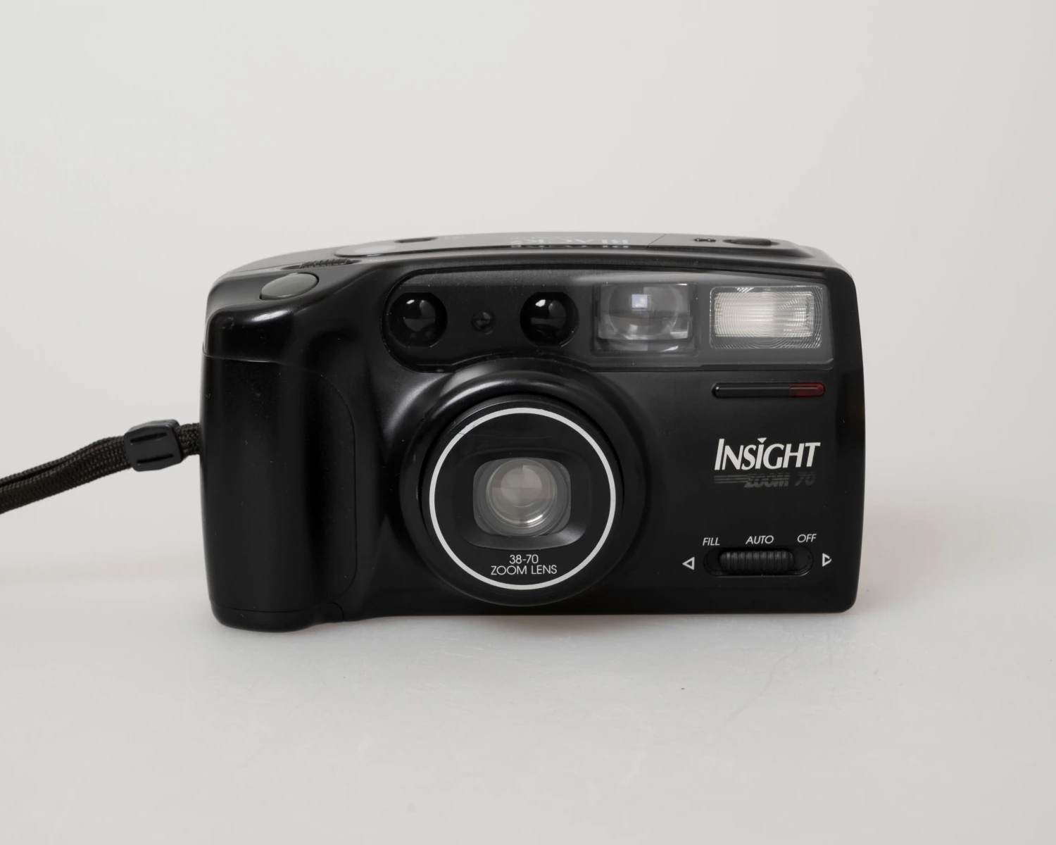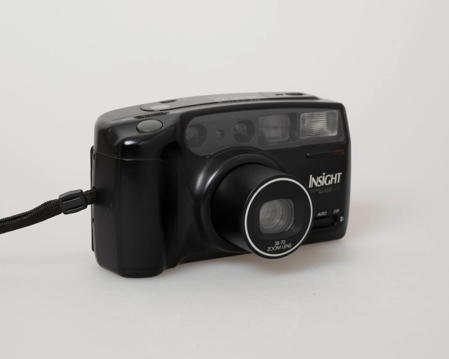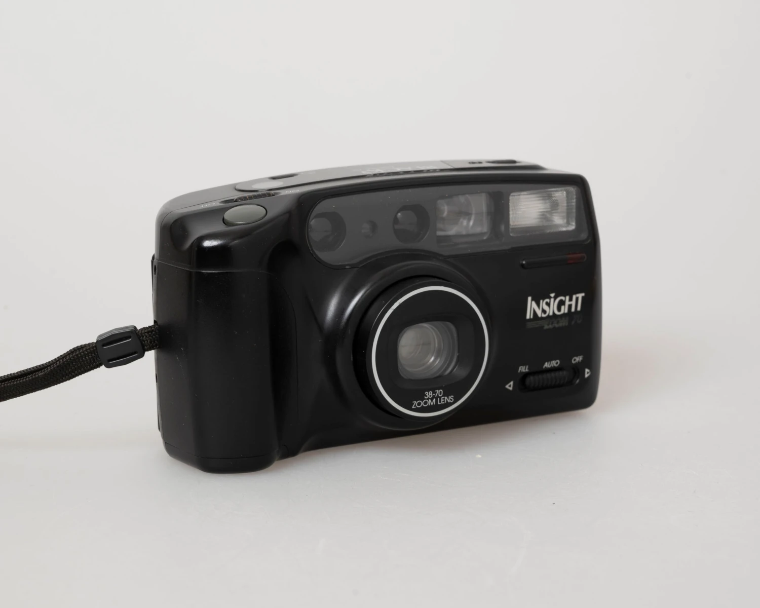 The Insight Zoom 70 is a rebranded version of the Vivitar Series 1 450PZ Zoom that was sold in the late 1990s by the Canadian photo store Black’s. This is a simple but intelligently designed autofocus point-and-shoot. It features a 38-70mm zoom range, three flash modes (auto, cancel, and daylight fill-in), a dedicated ‘infinity mode’ for photographing scenery, and a self-timer.