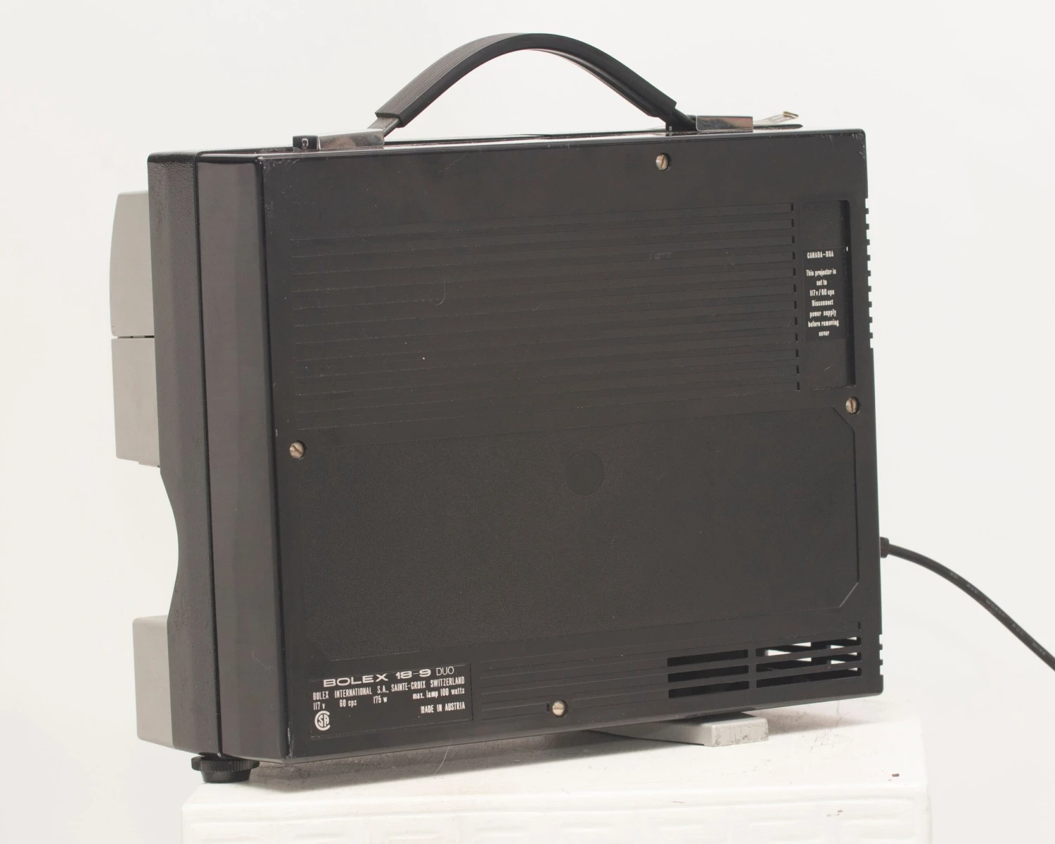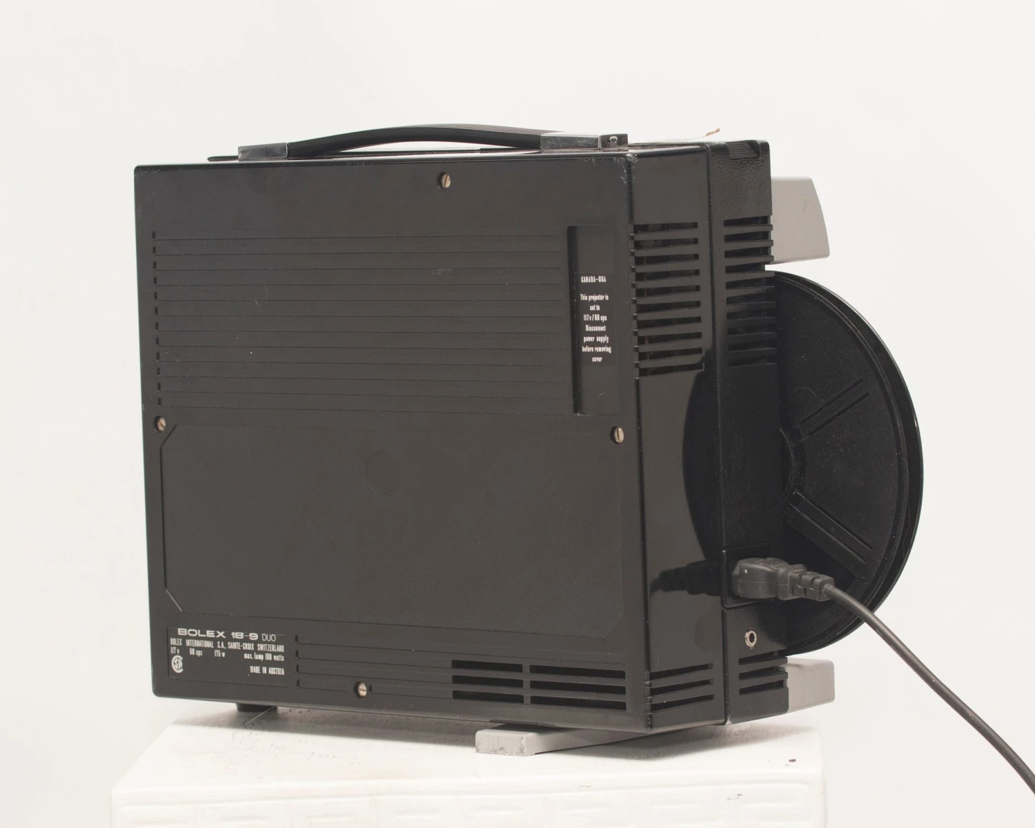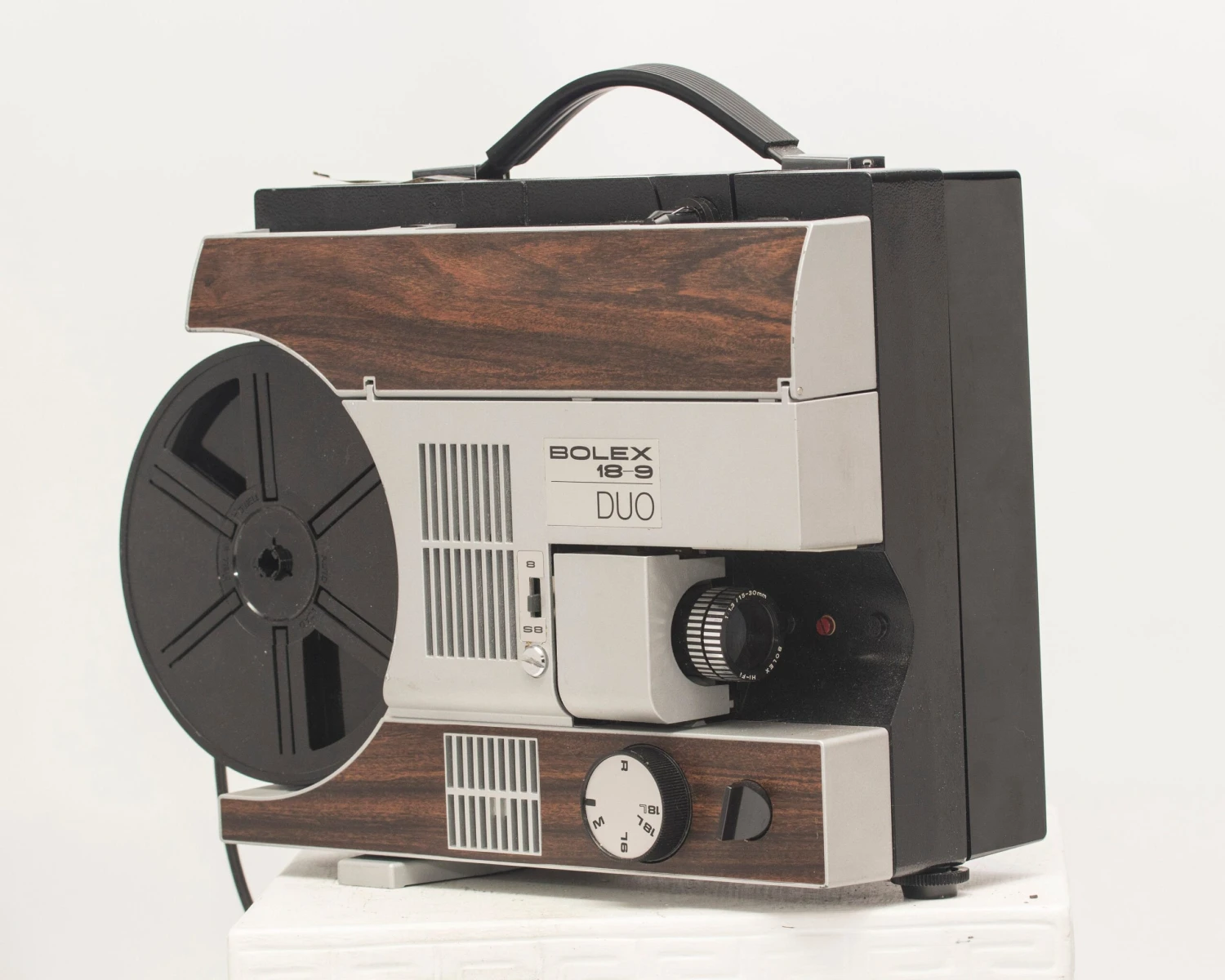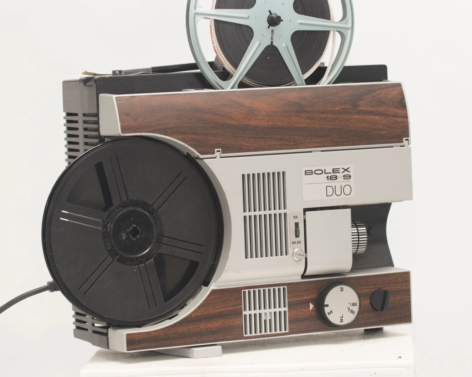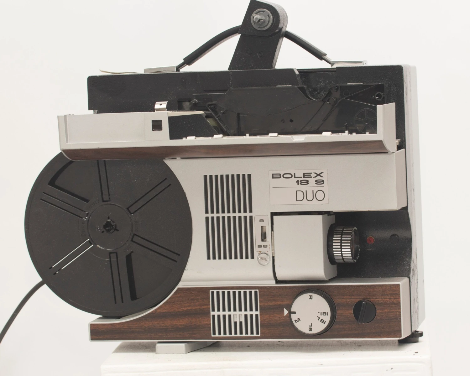 The Bolex 18-9 Duo is a very well-designed and easy to use Super 8 and 8mm projector (which also supports all four sizes of the somewhat uncommon Kodak Supermatic Super 8 cartridges). It has a very clever system for switching between the small 8mm and larger Super 8 spindles: an magnetized adapter spindle fits securely into place while there’s a post inside the projector to store the other spindle.