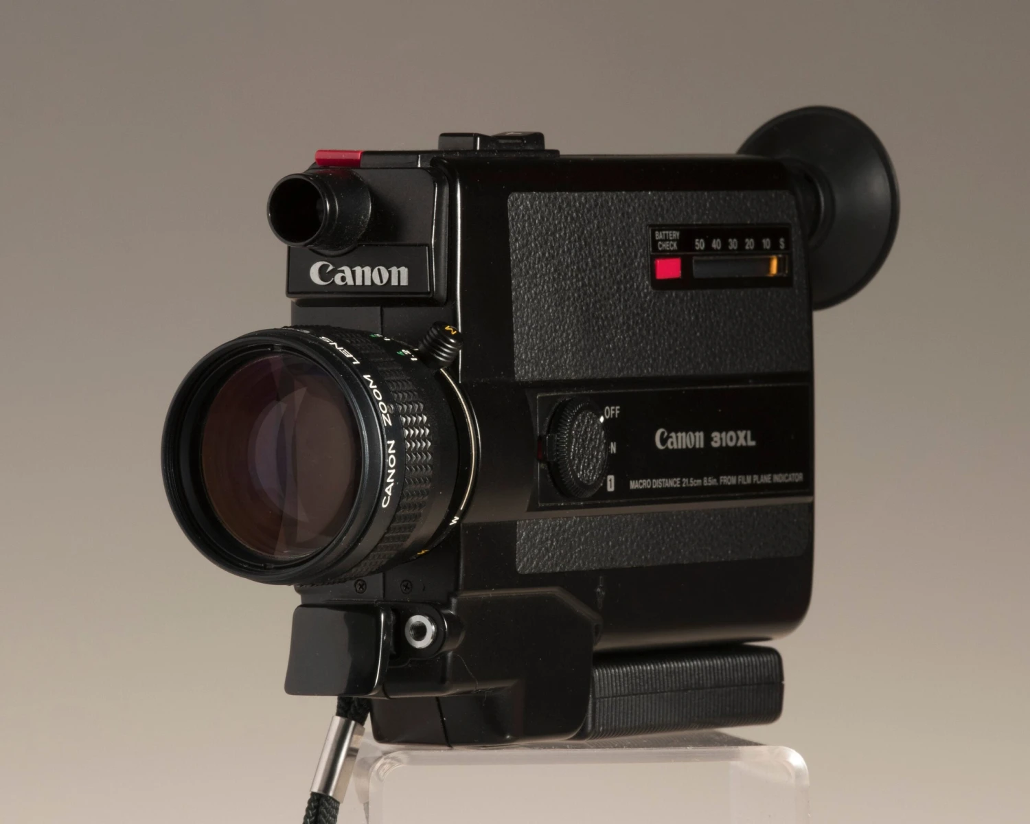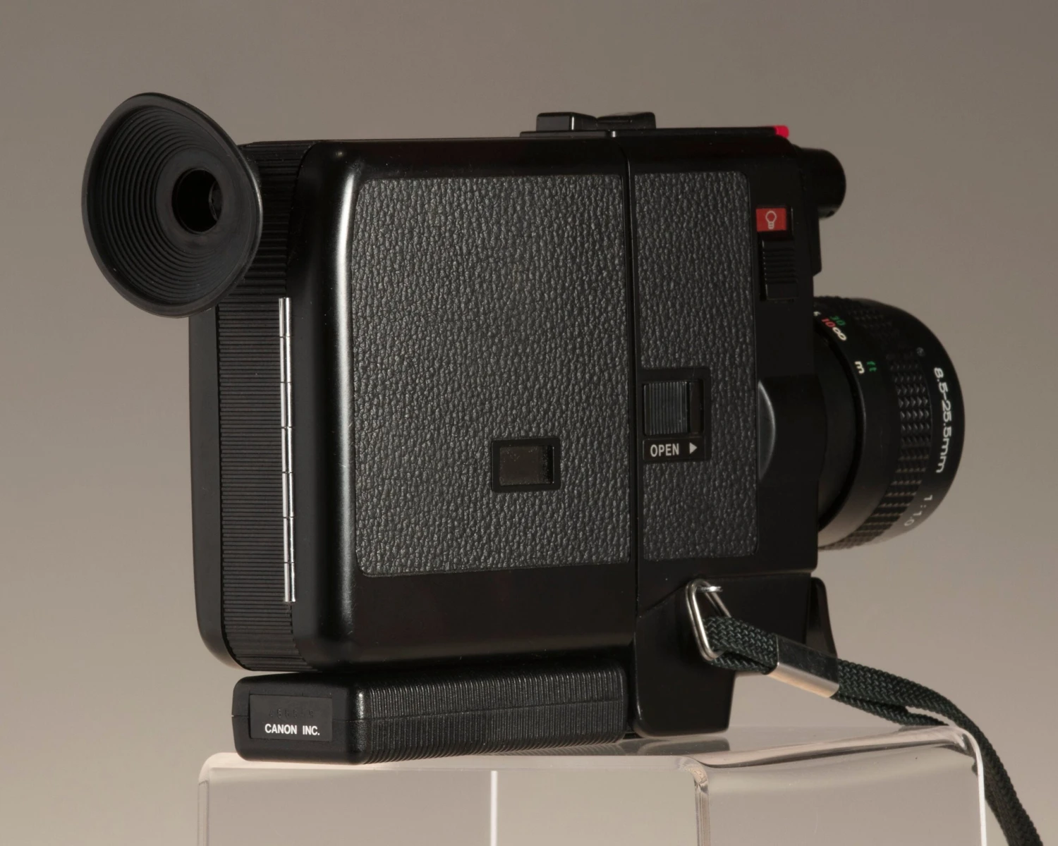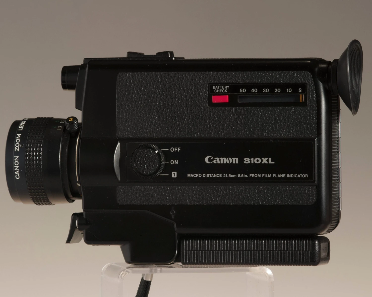 The Canon 310XL is one of the all-time classic Super 8 cameras. This small and lightweight camera’s incredibly fast F1.0 (!) lens is makes it an excellent choice for low-light/available light film-making. It’s also very convenient that the camera (including its automatic exposure) is powered by two ordinary AA batteries (not included). It’s also a really nice camera for stop motion animation as it includes a dedicated single frame mode.