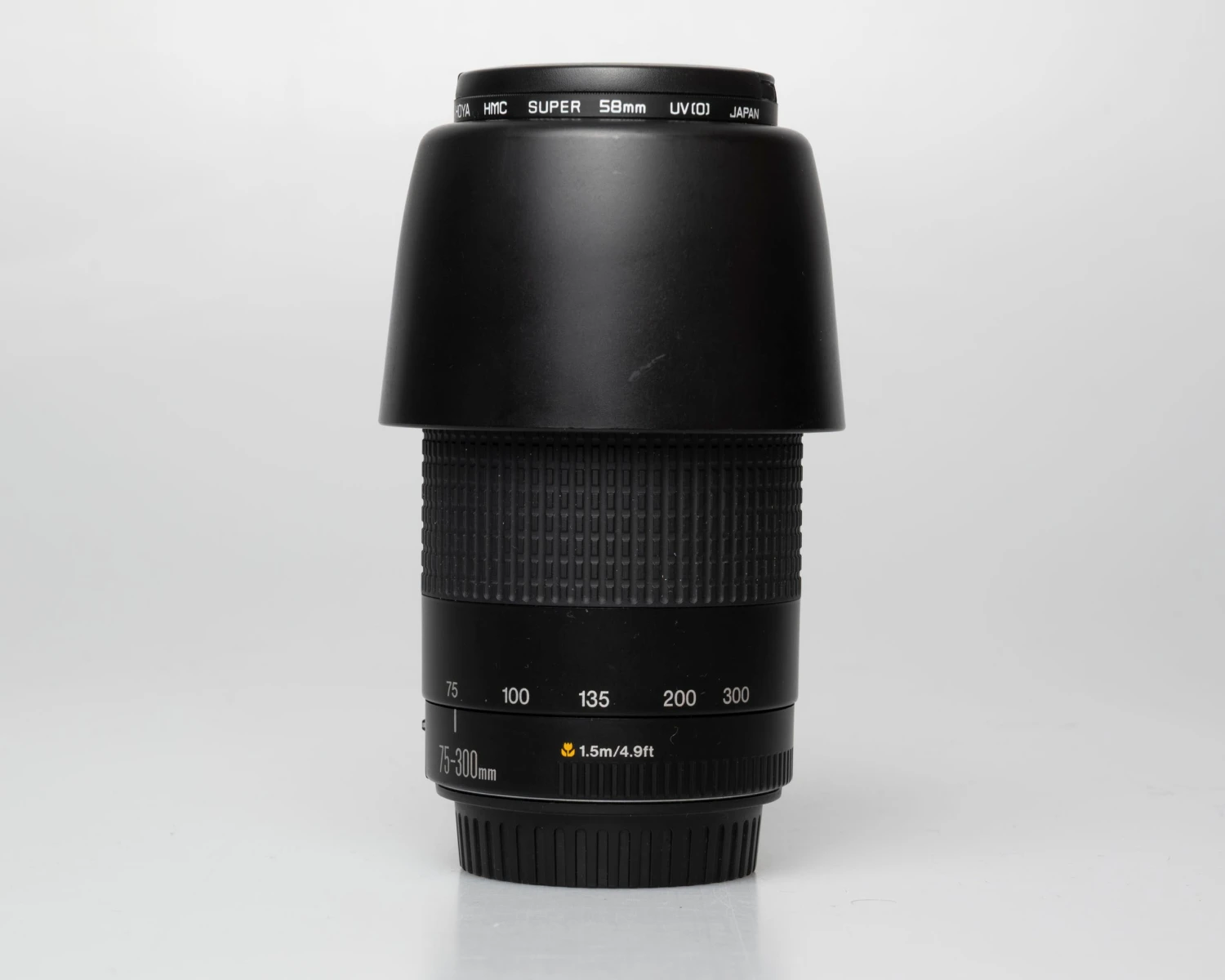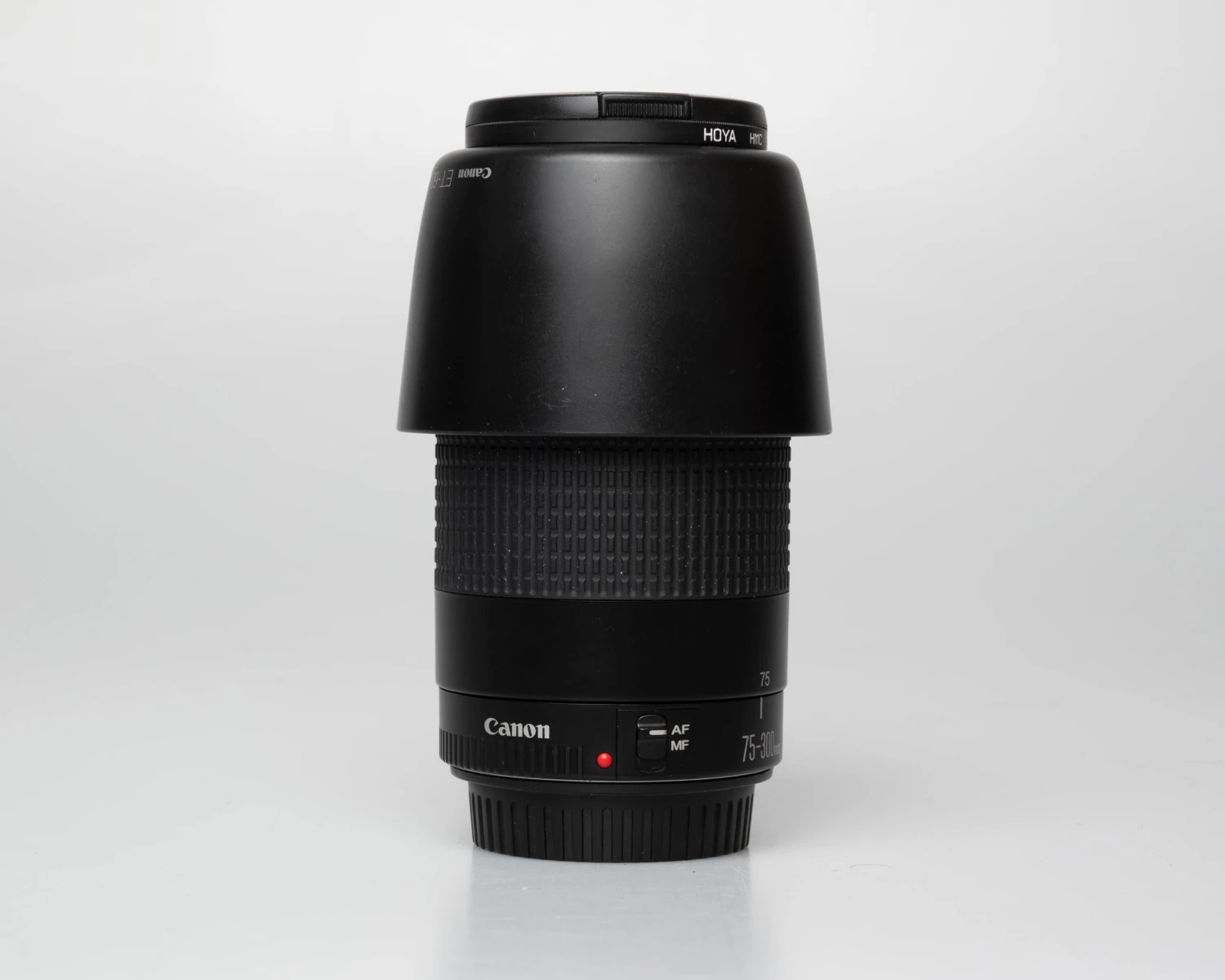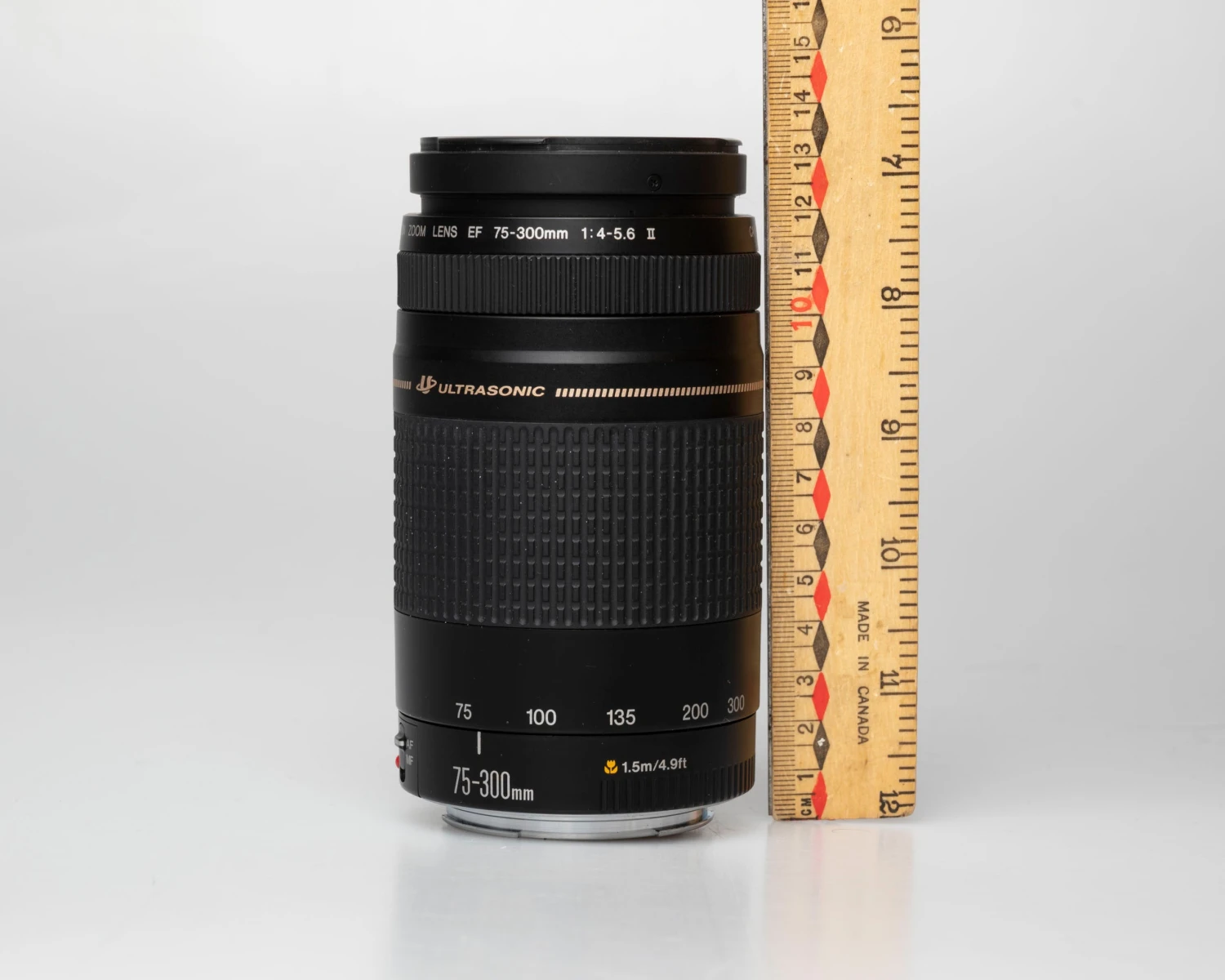 The Canon EF 75-300mm F4-5.6 II is a very flexible zoom telephoto lens for Canon EF mount film and digital cameras. The lens includes both the front and back caps and is in excellent optical and aesthetic condition.