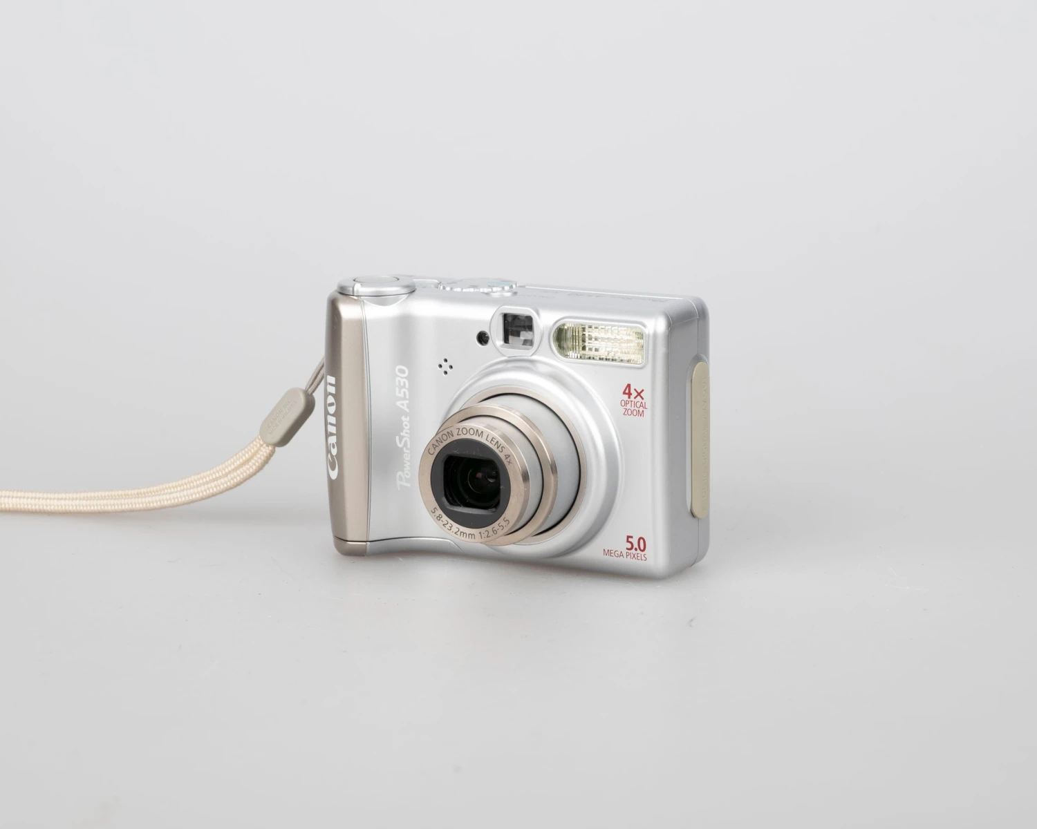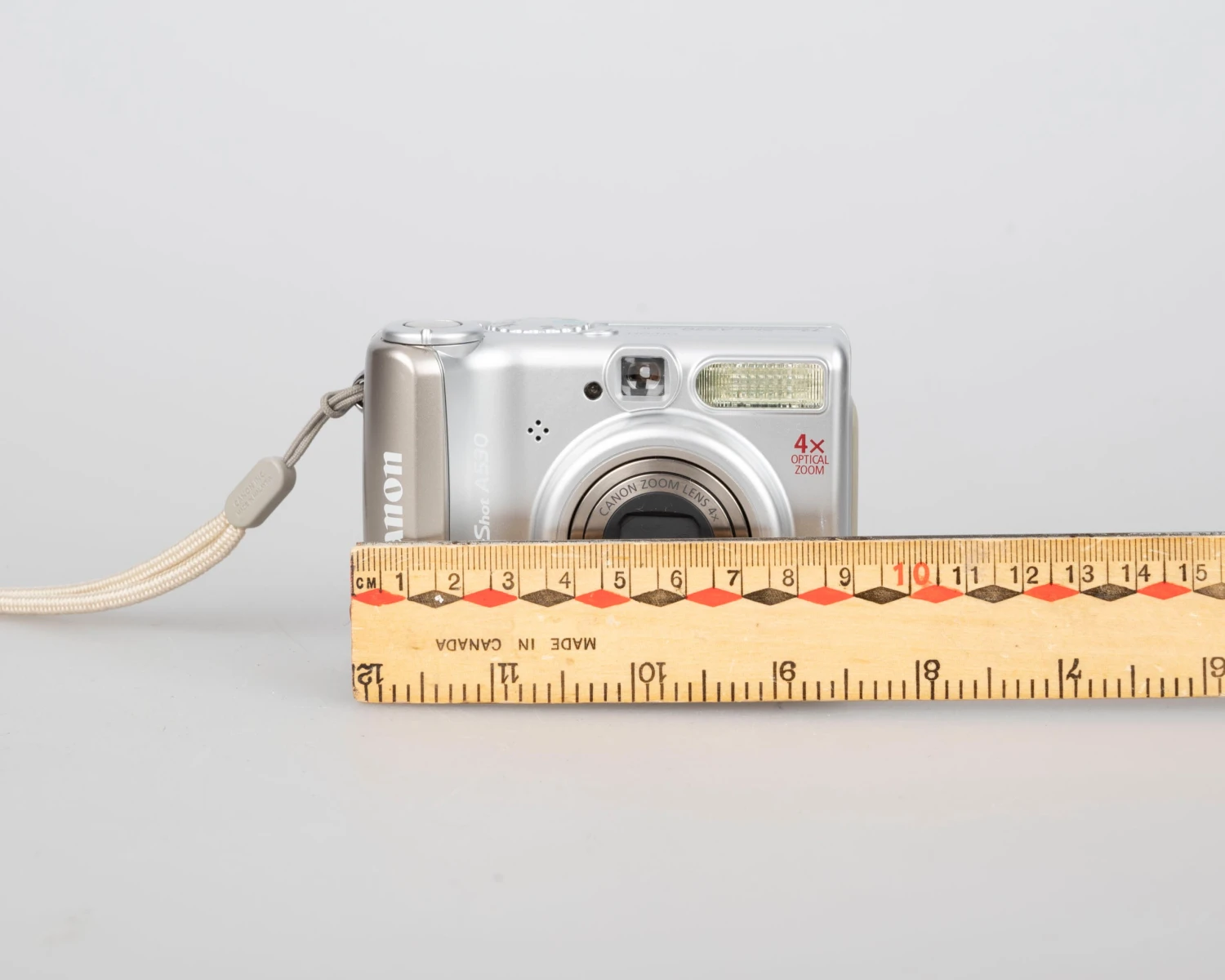 The Canon Powershot A530 is a circa 2006 digital camera featuring a 5-megapixel CCD sensor.
