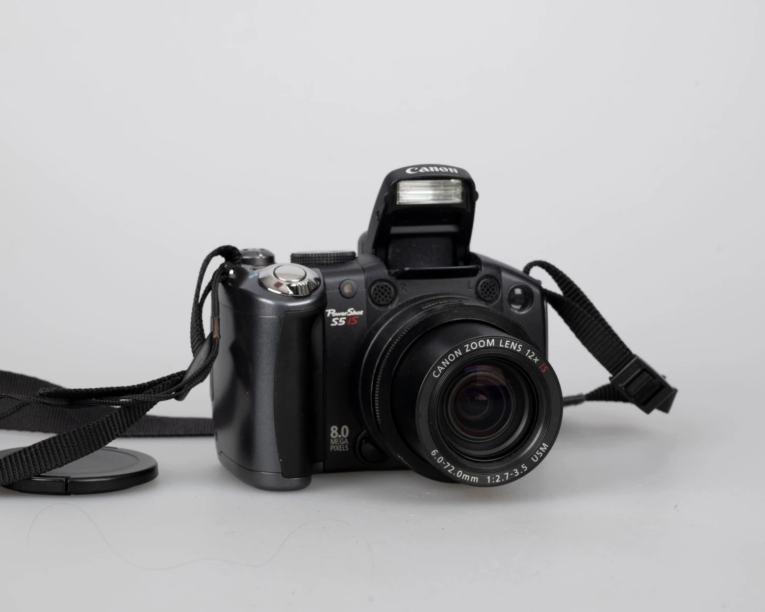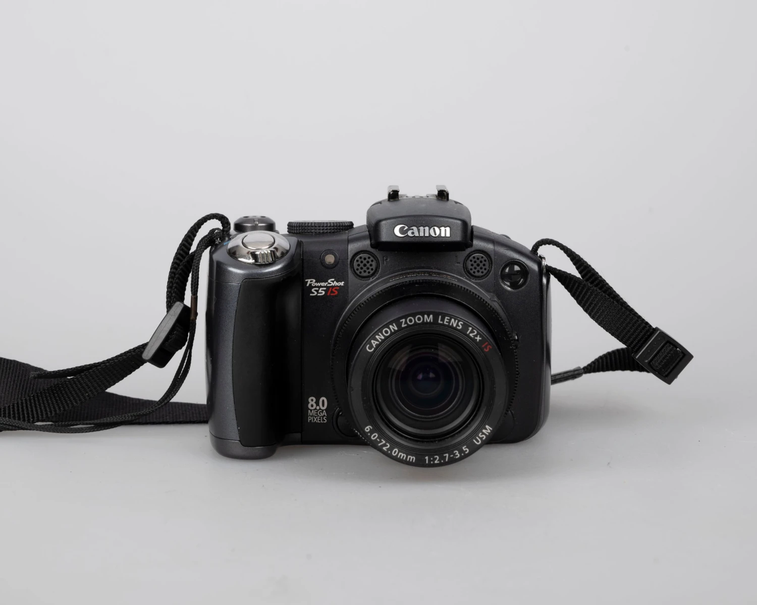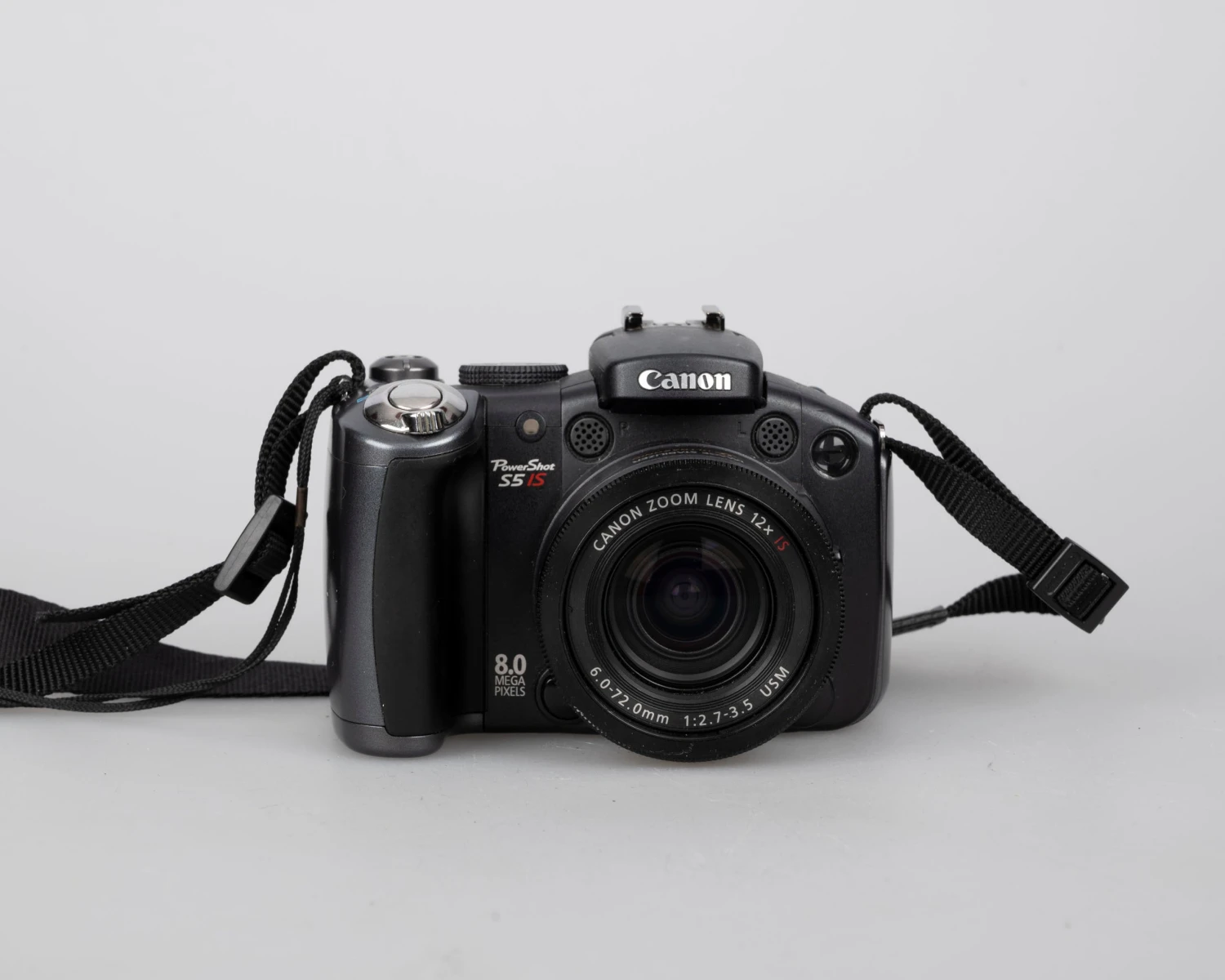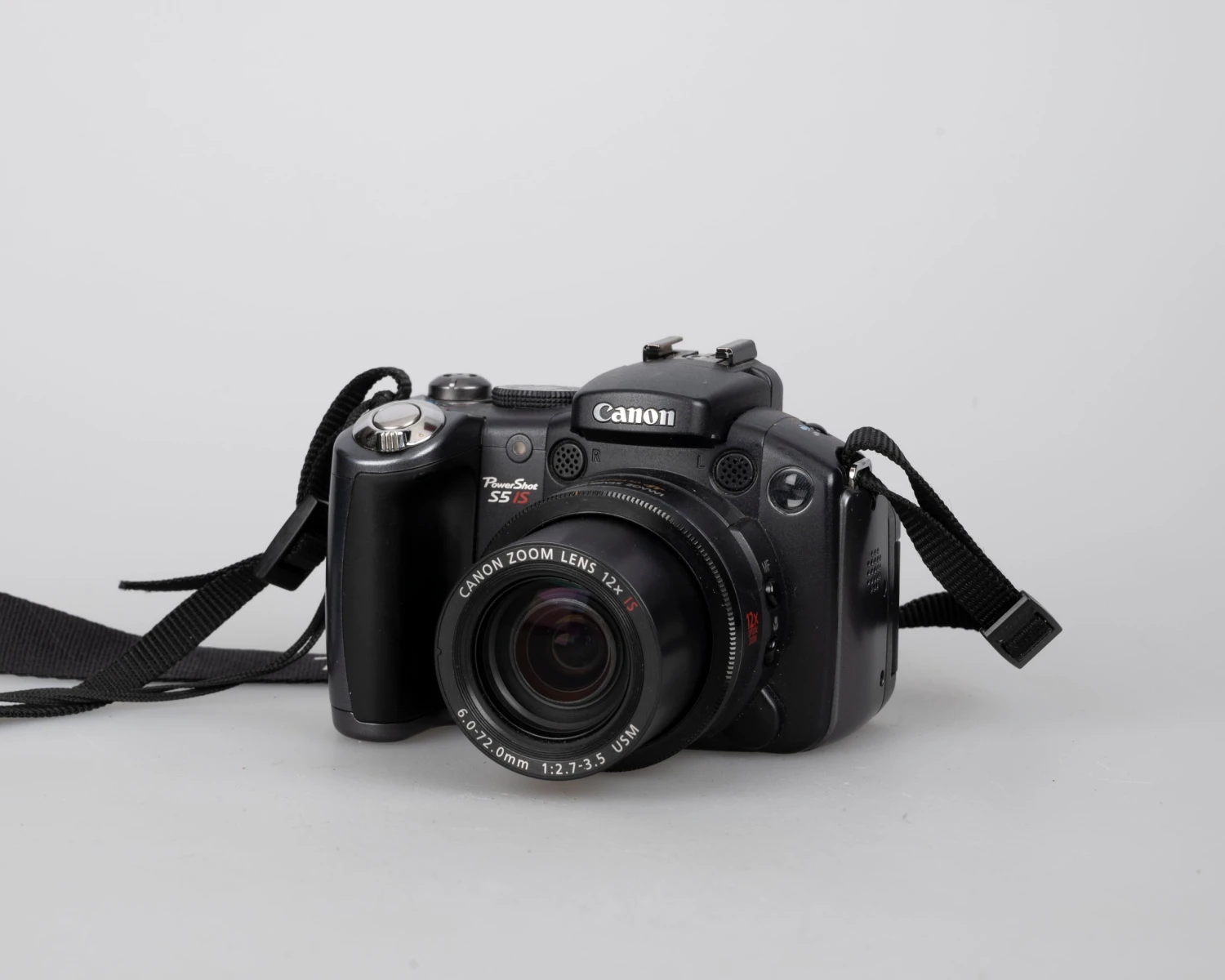 The Canon Powershot S5 IS is a circa-2007 enthusiast digital camera featuring an 8-megapixel CCD sensor and impressive 12x zooming range (6-72mm 1:2.7-3.5 lens) and image stabilization. It has a fairly powerful popup flash but also features a hot-shoe to permit the use of speedlights or studio strobes.