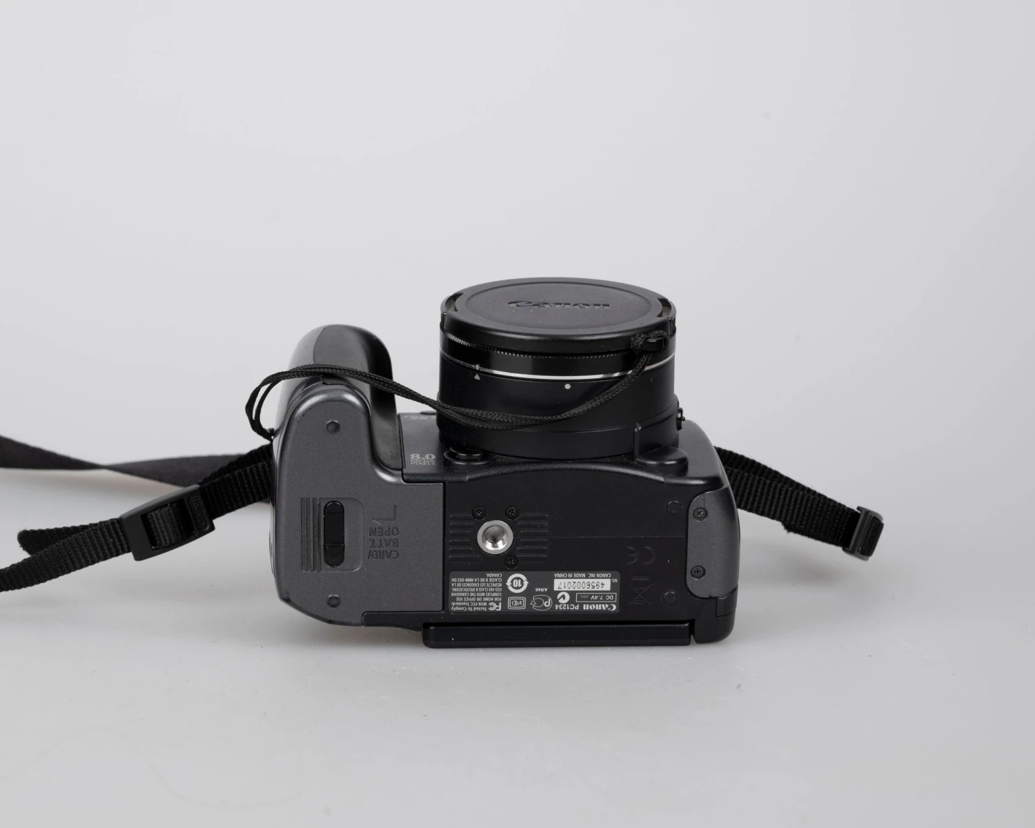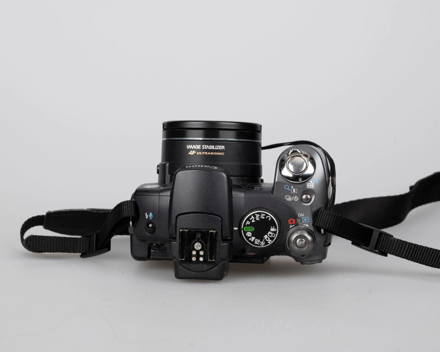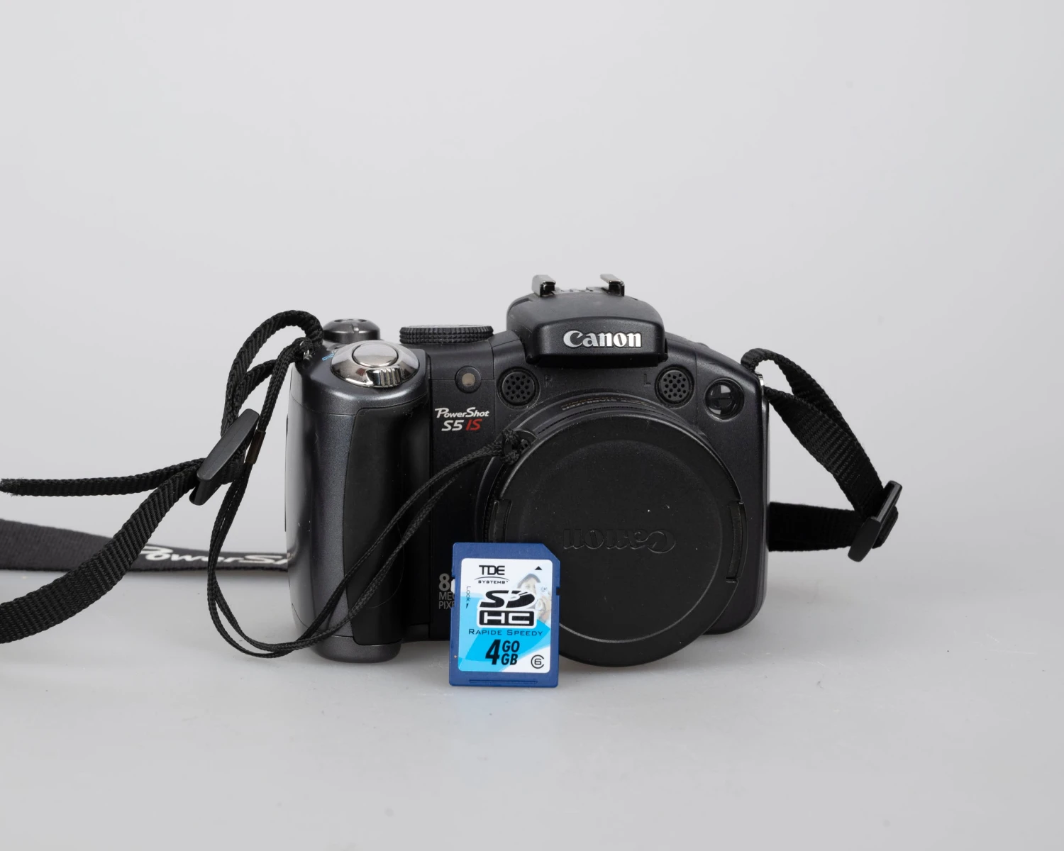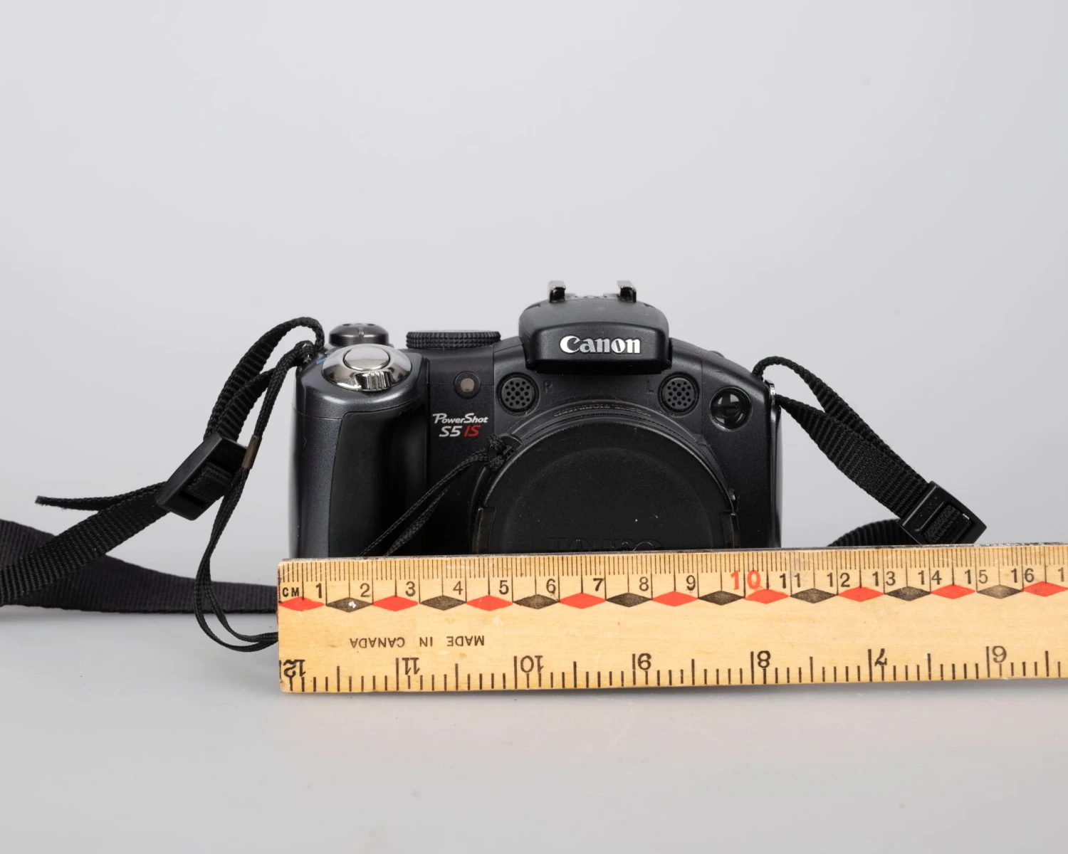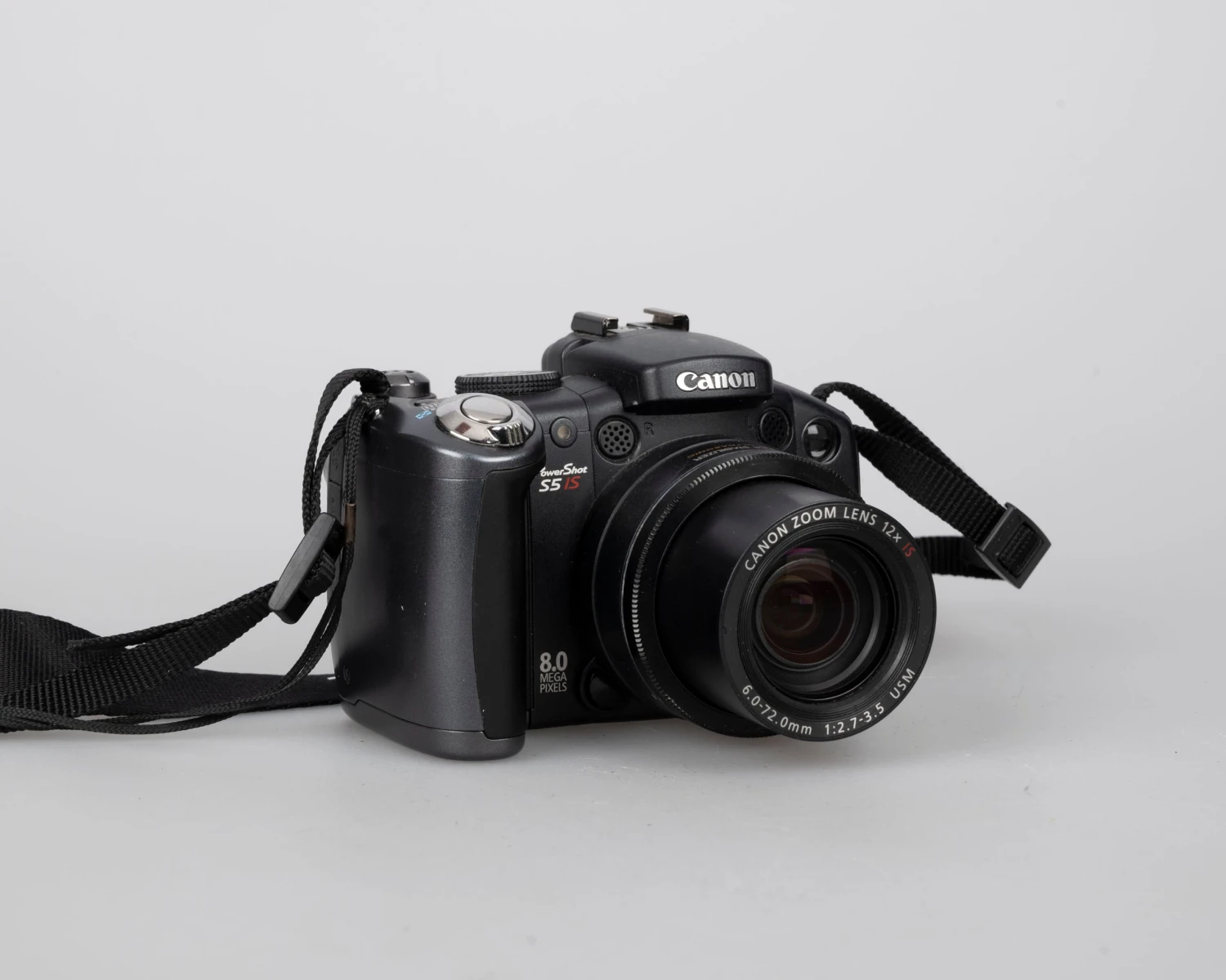 The Canon Powershot S5 IS is a circa-2007 enthusiast digital camera featuring an 8-megapixel CCD sensor and impressive 12x zooming range (6-72mm 1:2.7-3.5 lens) and image stabilization. It has a fairly powerful popup flash but also features a hot-shoe to permit the use of speedlights or studio strobes.