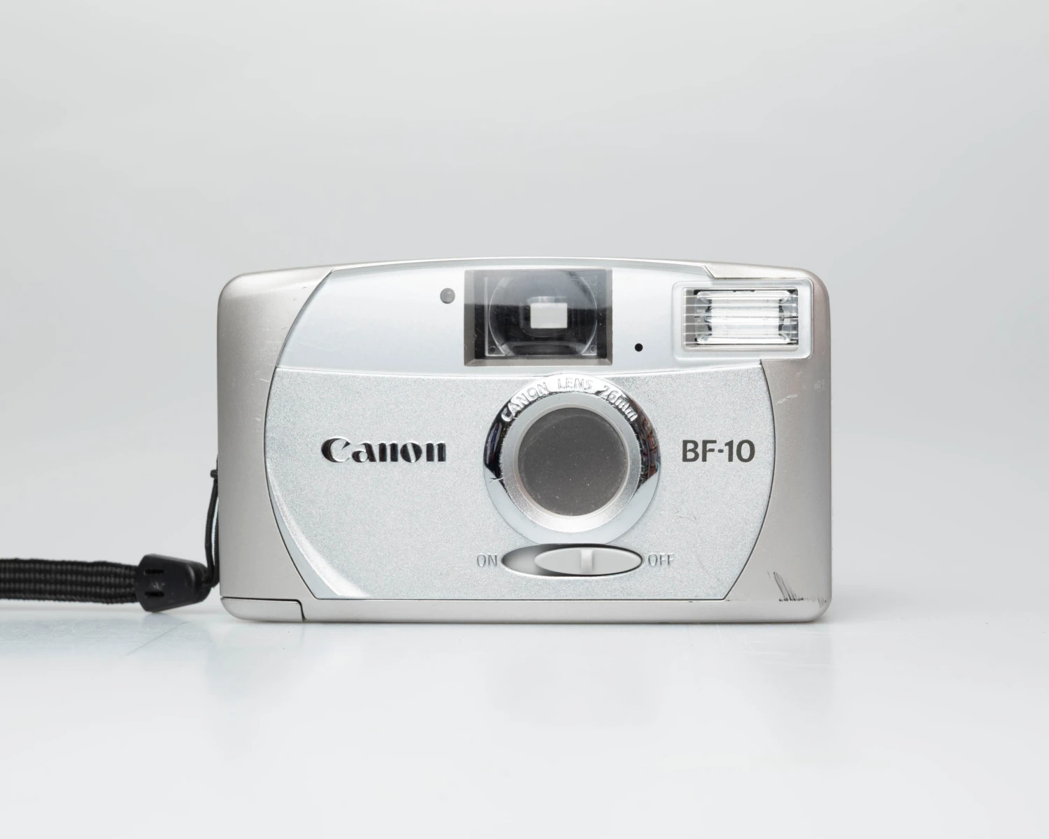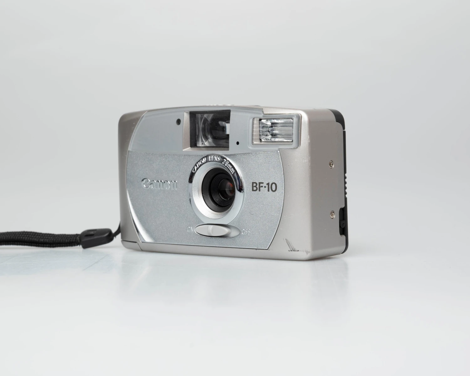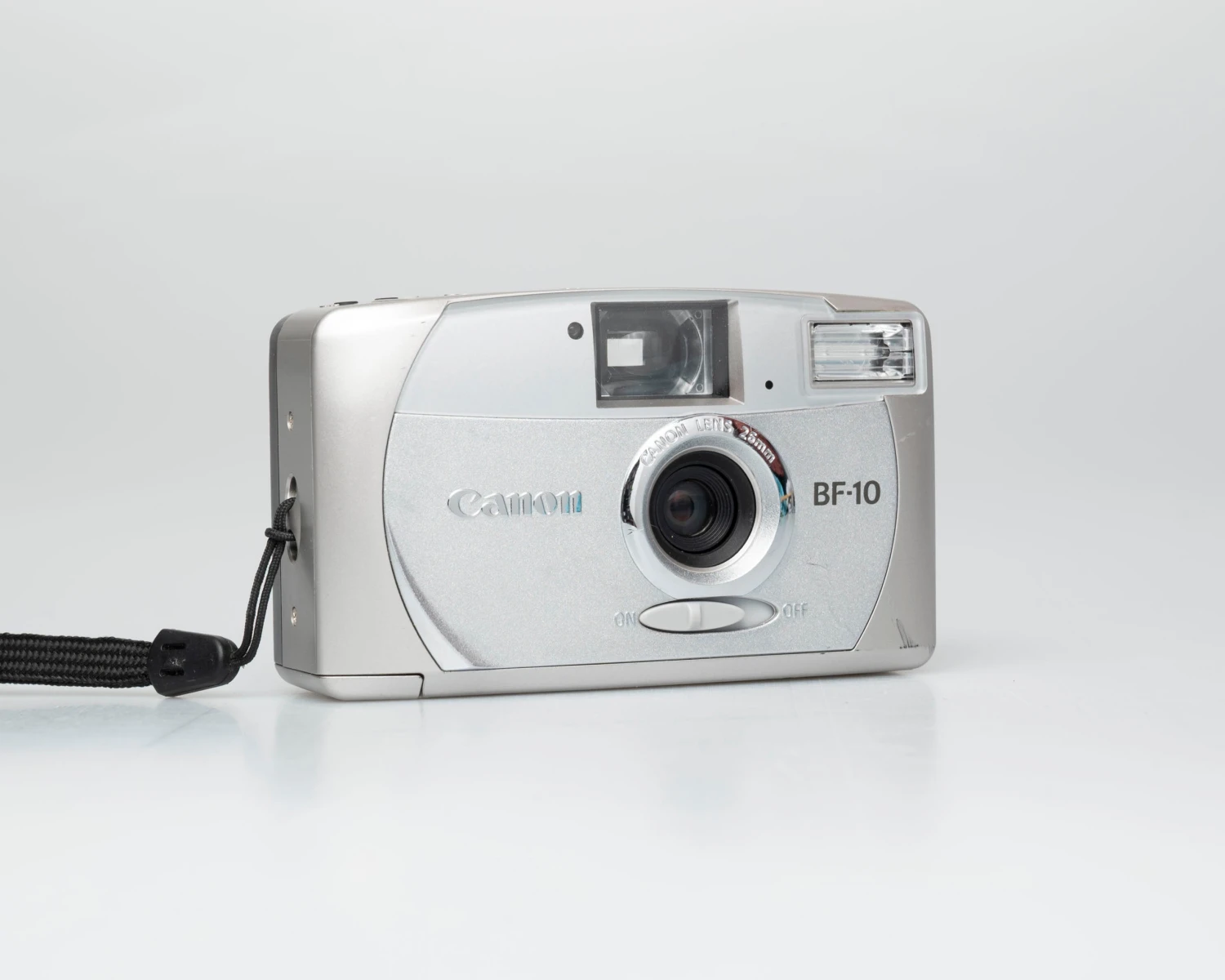 The Canon Sure Shot BF-10 (aka Prima BF-9S) is a very simple, fully automatic 35mm point-and-shoot camera from circa 2003 that features an unusually wide 26mm lens and bright, large viewfinder.