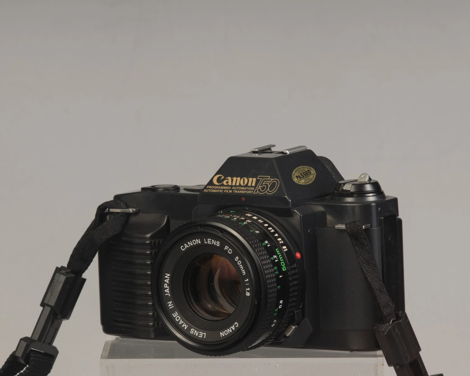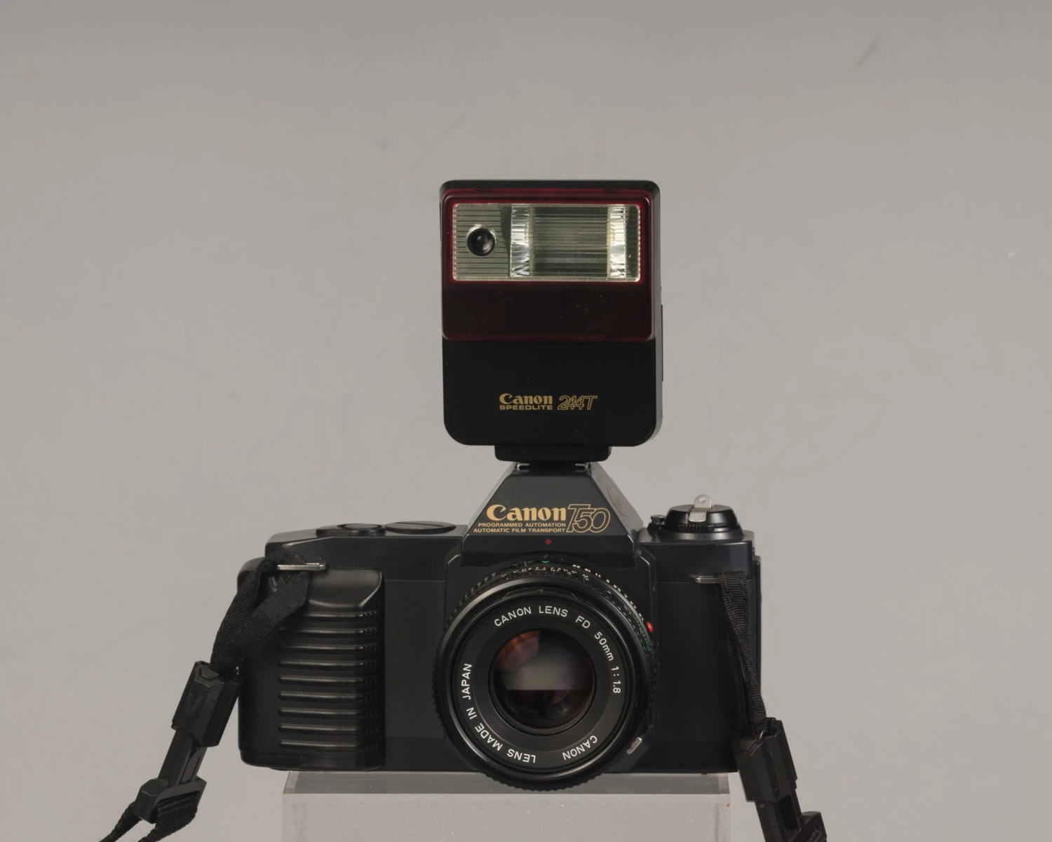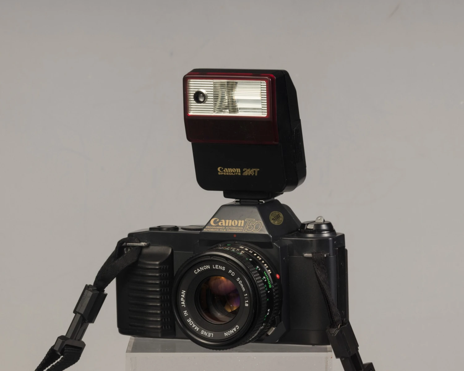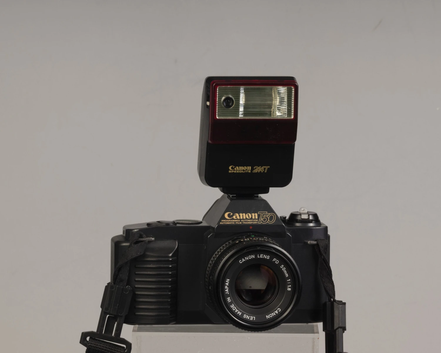 The Canon T50 is a wonderfully minimalist FD mount SLR from the early 1980s. It’s a lovely camera that’s really fun to use. It comes complete with a nice sharp Canon 50mm F1.8 FD lens and the Canon 244T Speedlite (which is specially designed for this camera and offers fully automatic flash exposure). It’s a perfect SLR for someone who prefers simplicity and a clean design over the usual everything-but-the-kitchen-sink feature list from Canon. Except for focusing and the film speed setting dial, it is completely automatic. In other words, it’s designed for right-brain photography.