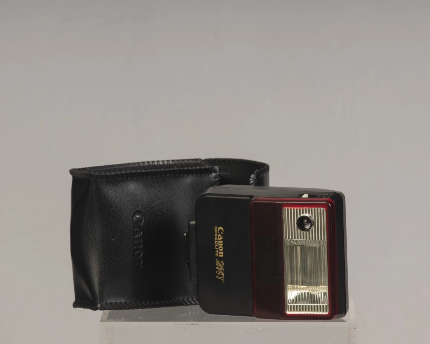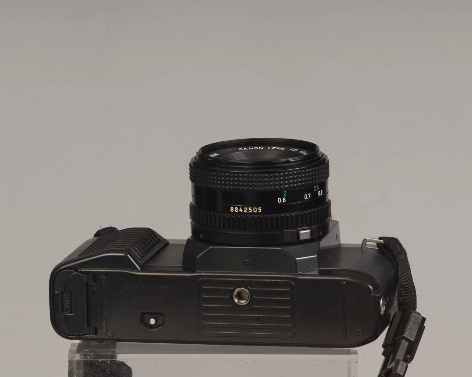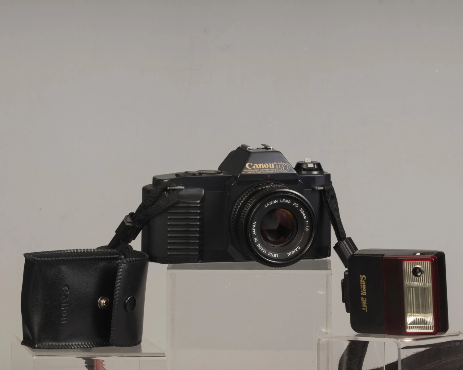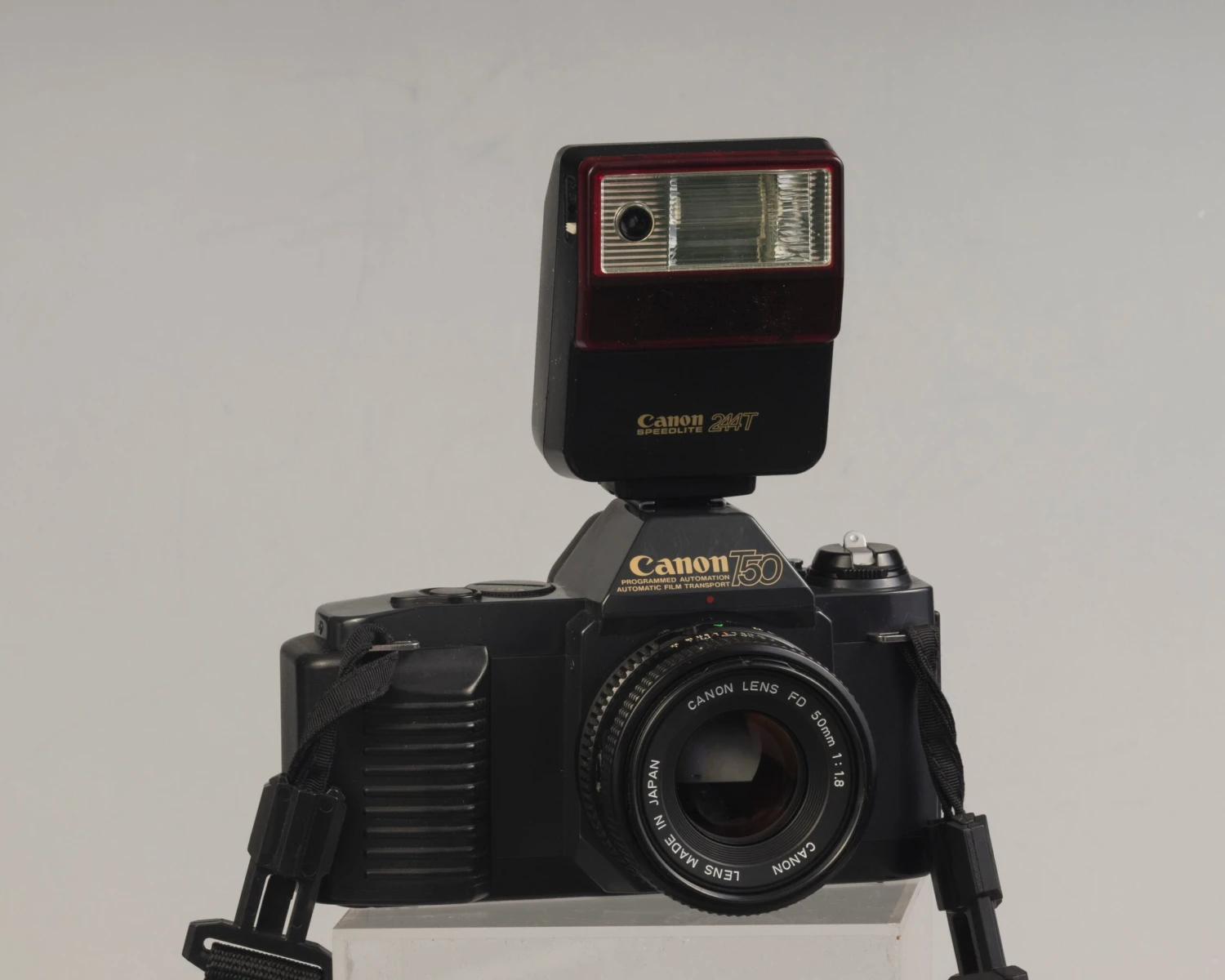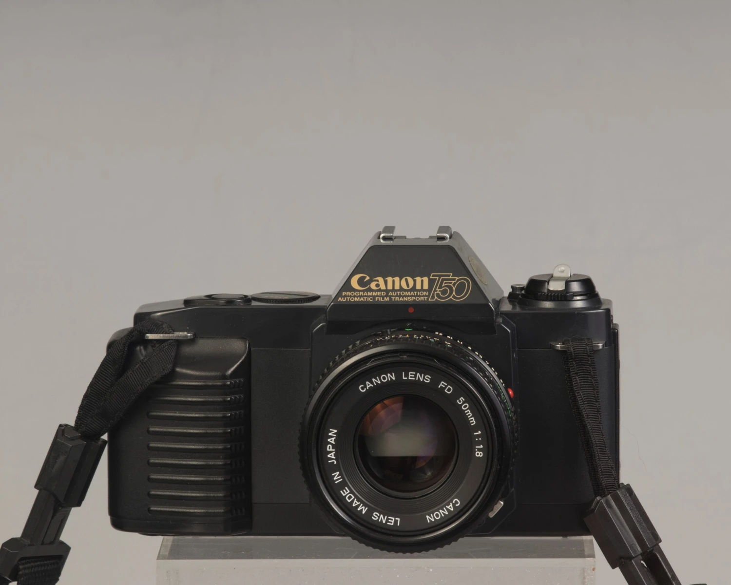 The Canon T50 is a wonderfully minimalist FD mount SLR from the early 1980s. It’s a lovely camera that’s really fun to use. It comes complete with a nice sharp Canon 50mm F1.8 FD lens and the Canon 244T Speedlite (which is specially designed for this camera and offers fully automatic flash exposure). It’s a perfect SLR for someone who prefers simplicity and a clean design over the usual everything-but-the-kitchen-sink feature list from Canon. Except for focusing and the film speed setting dial, it is completely automatic. In other words, it’s designed for right-brain photography.