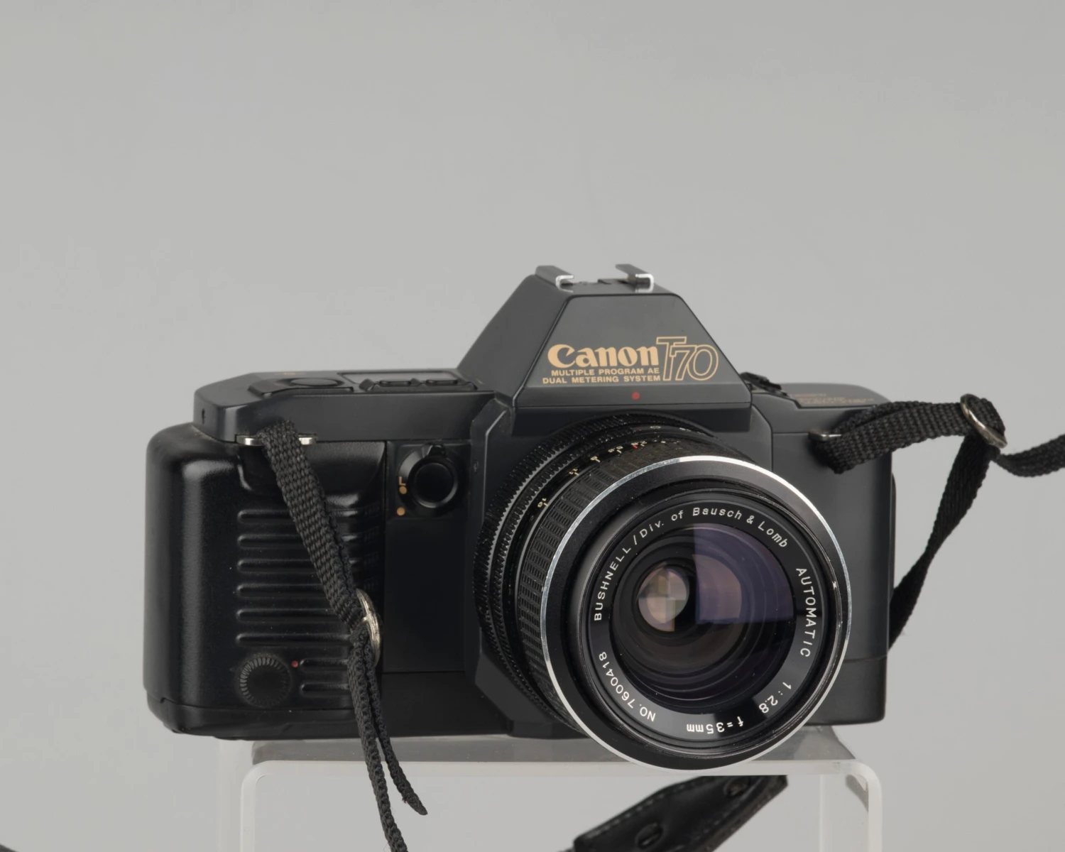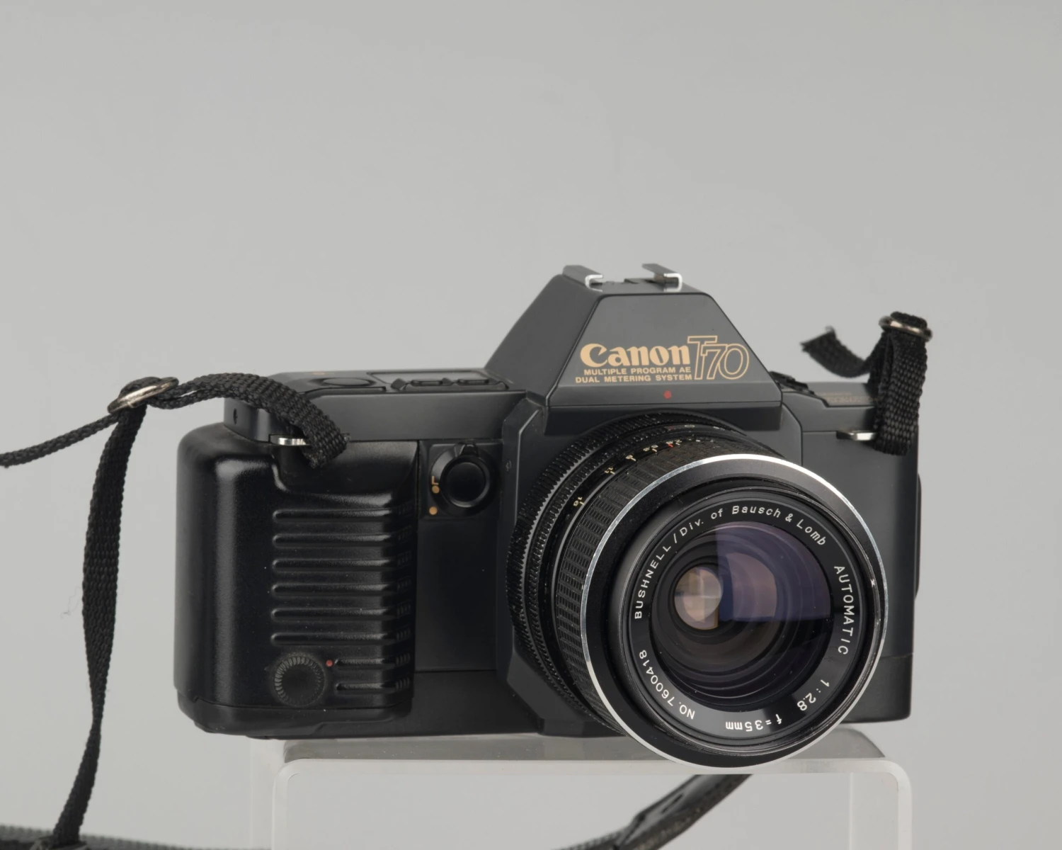 The Canon T70 is an FD-mount 35mm film SLR from the mid 1980s. It was the middle model in the company’s integrated film-motor T series (with the tank-like T90 being the pro model and the ultra-simple T50 the basic option). It’s a very underrated camera with four very handy auto exposure modes (standard program; tele program, wide angle program, and shutter priority) plus metered manual exposure. Owing to its vertical travelling, the T70 attains a higher flash sync speed (1/90) than the earlier A and F series SLRs. Its plastic outer skin hides the fact it’s built with a solid metal chassis underneath.