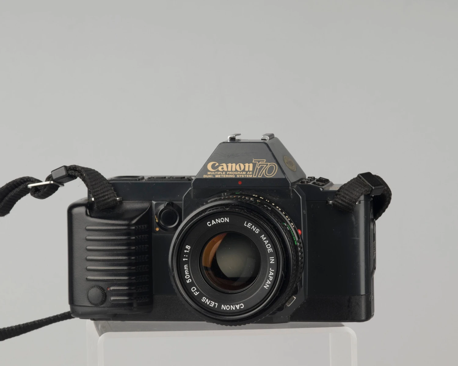 The Canon T70 is an FD-mount 35mm film SLR from the mid 1980s. It was the middle model in the company’s integrated film-motor T series (with the tank-like T90 being the pro model and the ultra-simple T50 the basic option). It’s a very underrated camera with four very handy auto exposure modes (standard program; tele program, wide angle program, and shutter priority) plus metered manual exposure. Owing to its vertical travelling, the T70 attains a higher flash sync speed (1/90) than the earlier A and F series SLRs. Its plastic outer skin hides the fact it’s built with a solid metal chassis underneath.