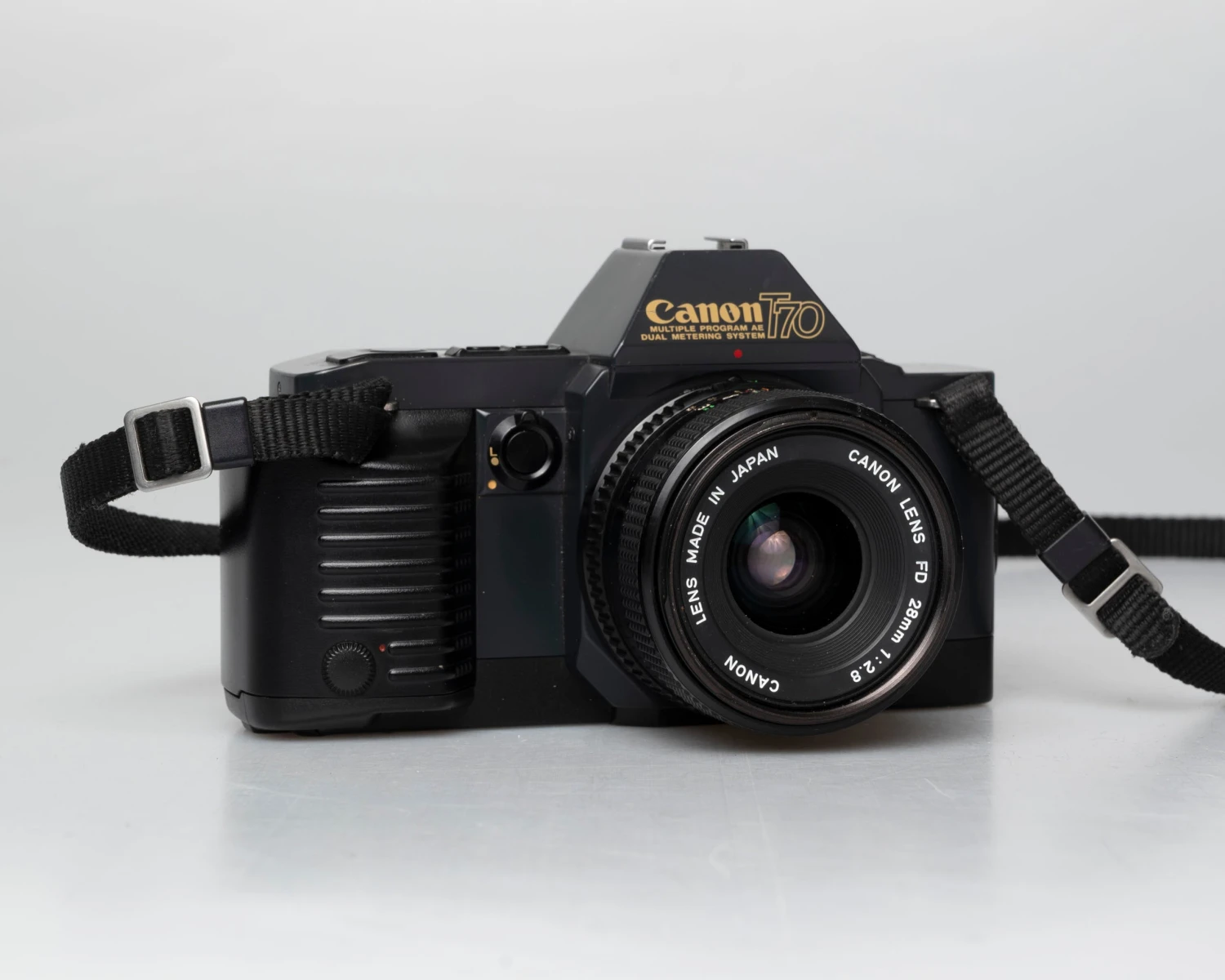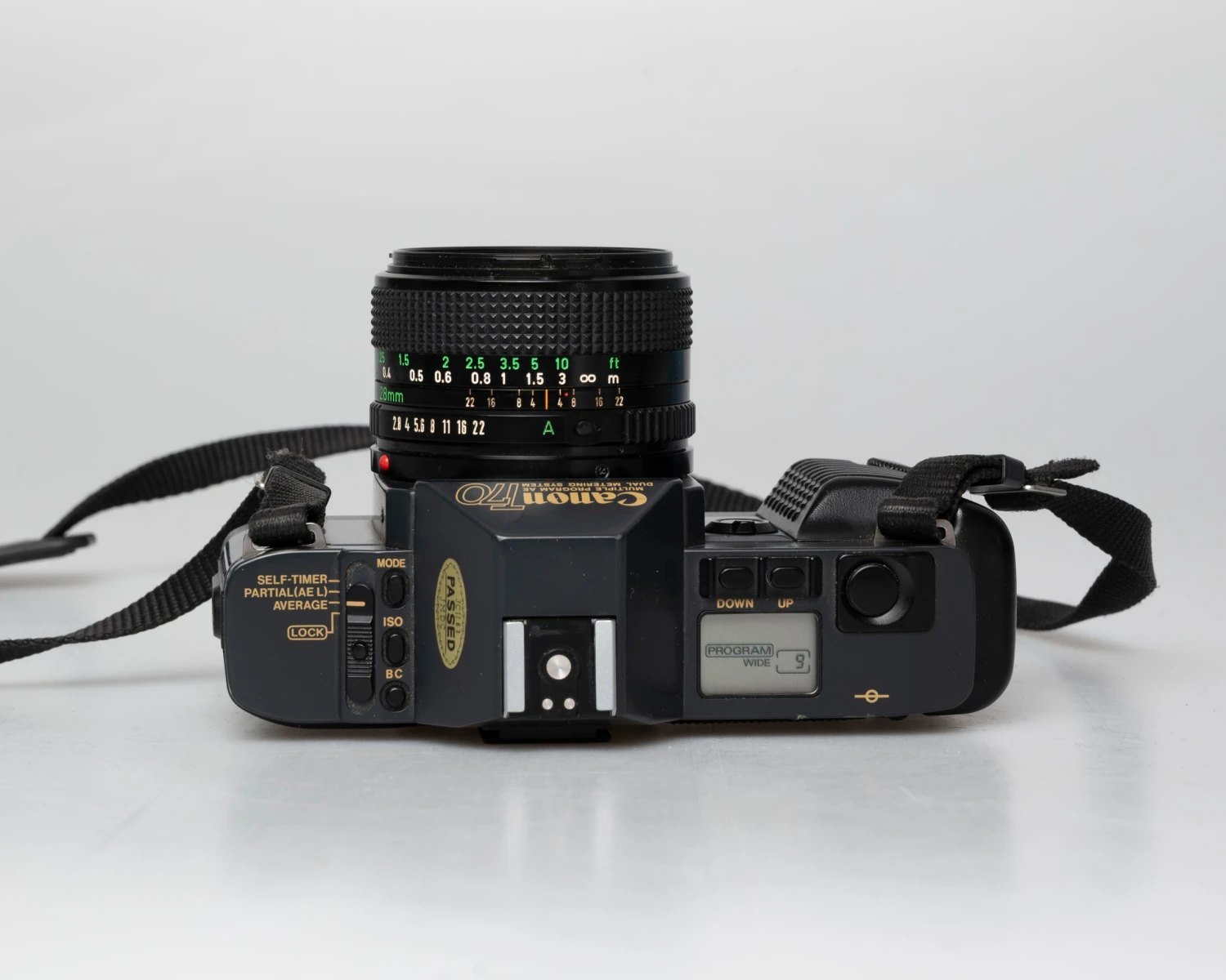 The Canon T70 is an FD-mount 35mm film SLR from the mid-1980s. This camera was the middle model in the company’s integrated film-motor T series (with the tank-like T90 being the pro model and the ultra-simple T50 the basic option).
