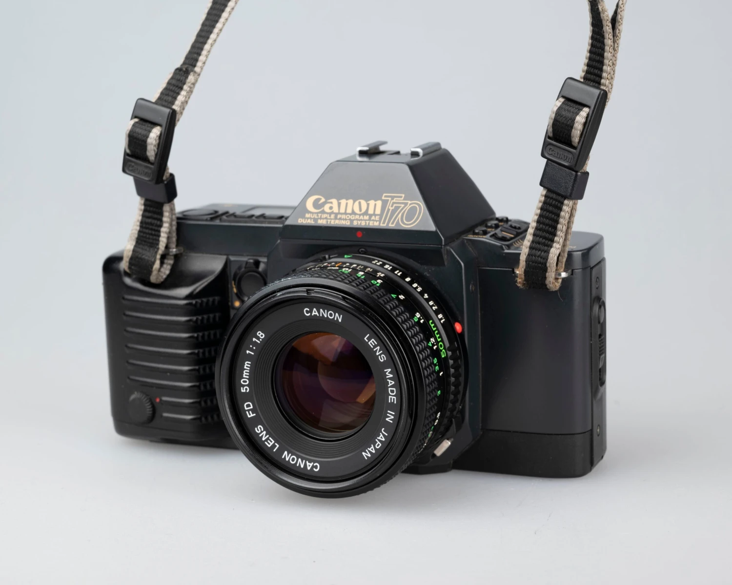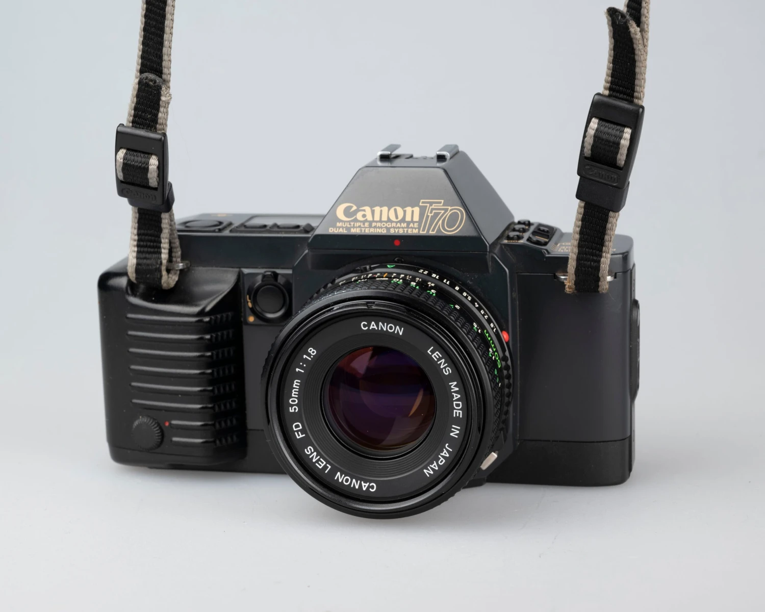 The Canon T70 is an FD-mount 35mm film SLR from the mid-1980s. This camera was the middle model in the company’s integrated film-motor T series (with the tank-like T90 being the pro model and the ultra-simple T50 the basic option). The T70 is a very underrated camera with four very useful auto exposure modes (standard program; telephoto program, wide angle program, and shutter priority) plus metered manual exposure.