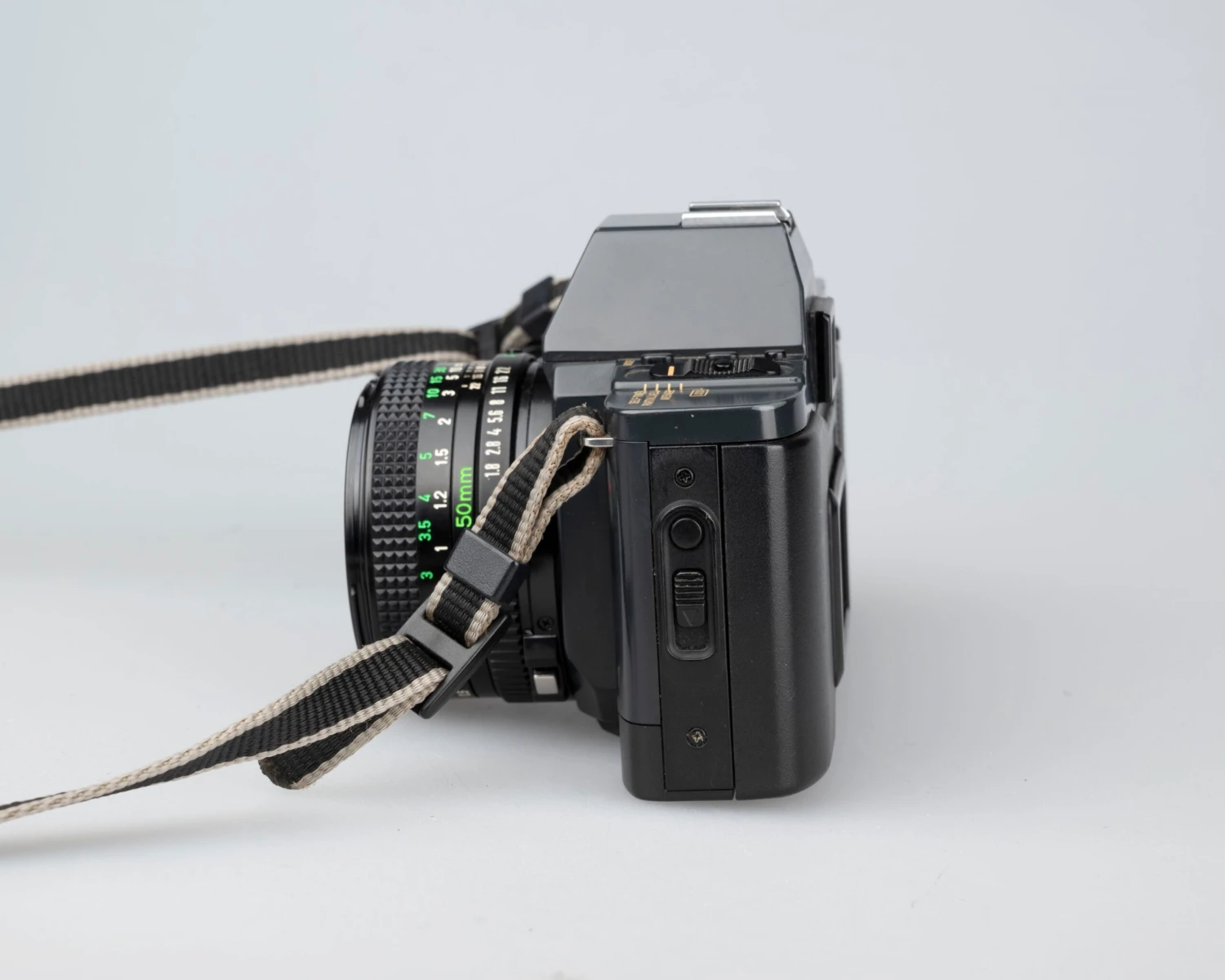 - Usable lenses: Canon FD lenses (full aperture metering) and non-FD lenses (stopped-down metering).