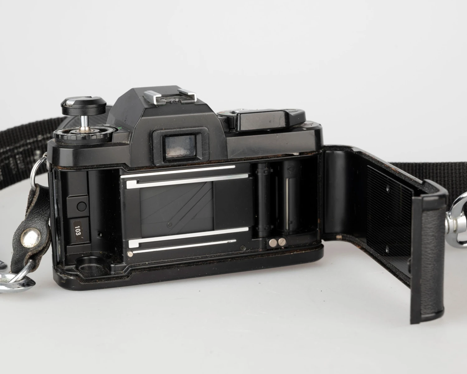 The camera was tested with a battery and film installed (the film was not developed however) and all functions are working correctly. We verified the camera’s shutter speeds and auto-exposure are working with very good accuracy. The camera is good cosmetic condition apart from the dark smudge in the viewfinder mentioned earlier. The included lens is in good condition.