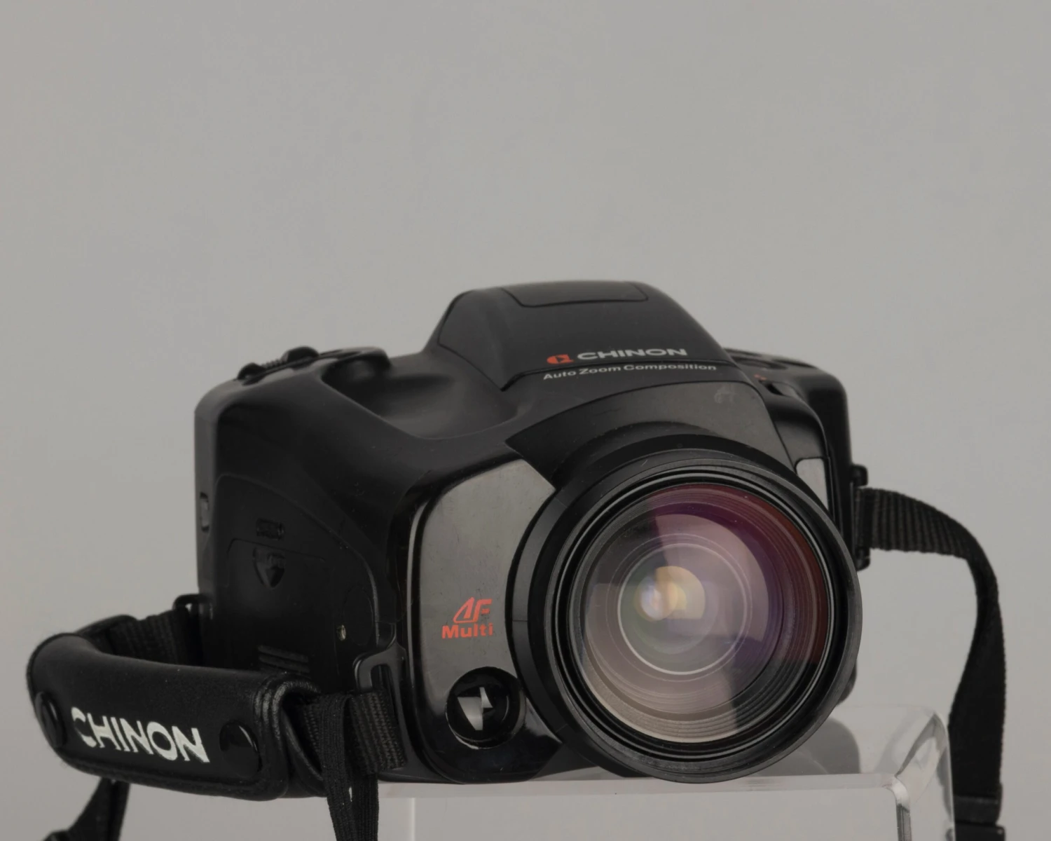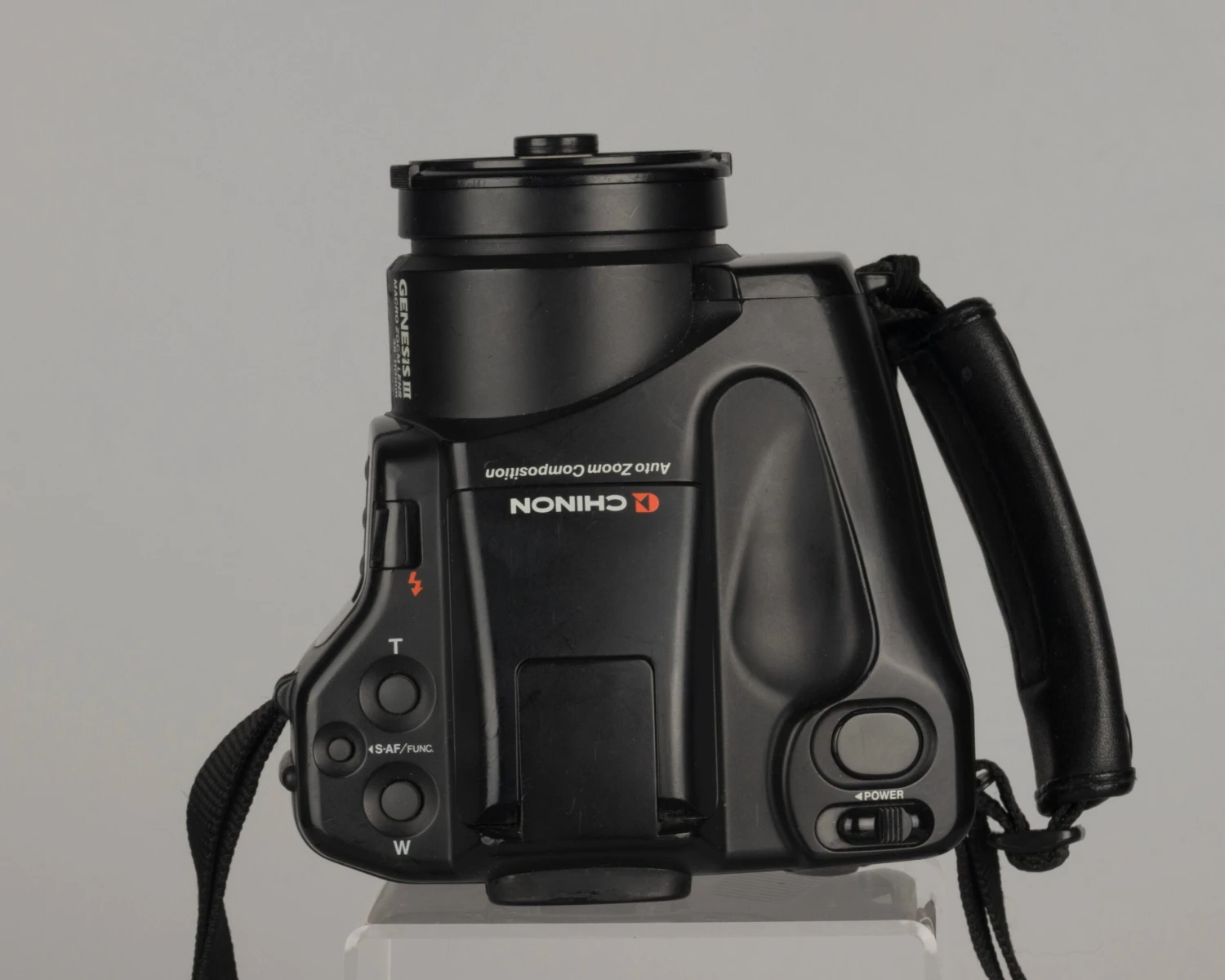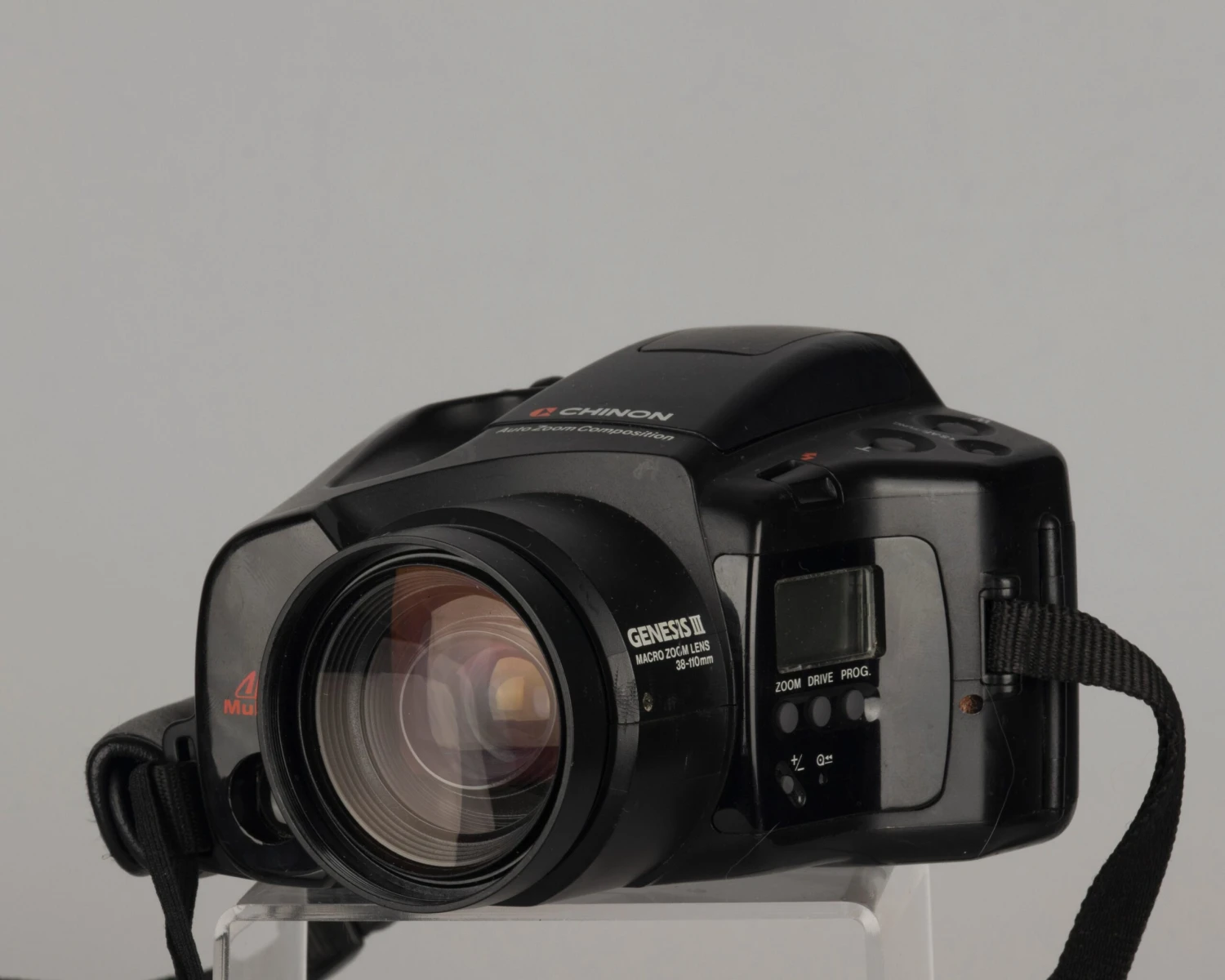 The Chinon Genesis III is a well designed and high-quality SLR with a 38-110mm fixed (not interchangeable) zoom lens. It’s a very comfortable and easy camera to use in its basic mode but offer a huge number of features if you choose to go deep.