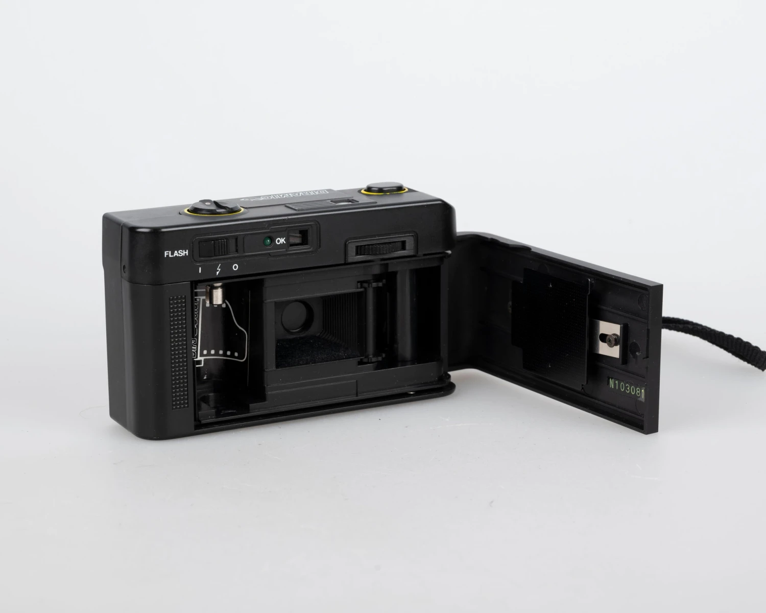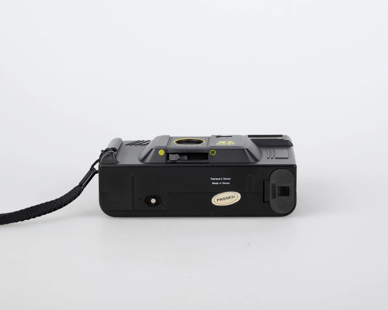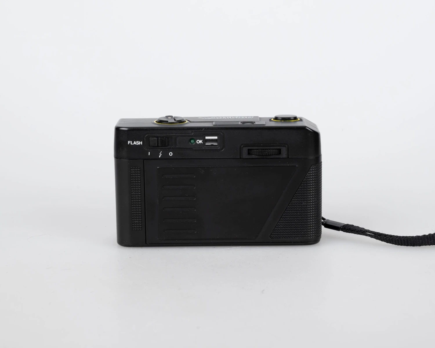 The Diramic XL 1000 is a simple focus-free, mechanical drive 35mm point-and-shoot camera from the 1980s. It has a fixed 38mm f5.6 lens and supports metering for ISO 100/200, and 400 films. The camera’s flash will not fire unless it’s switched on (a nice feature in our opinion).