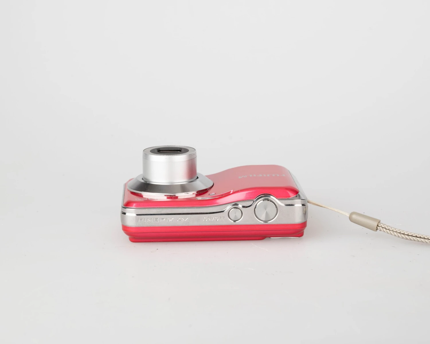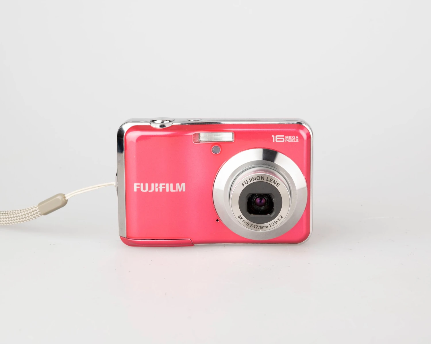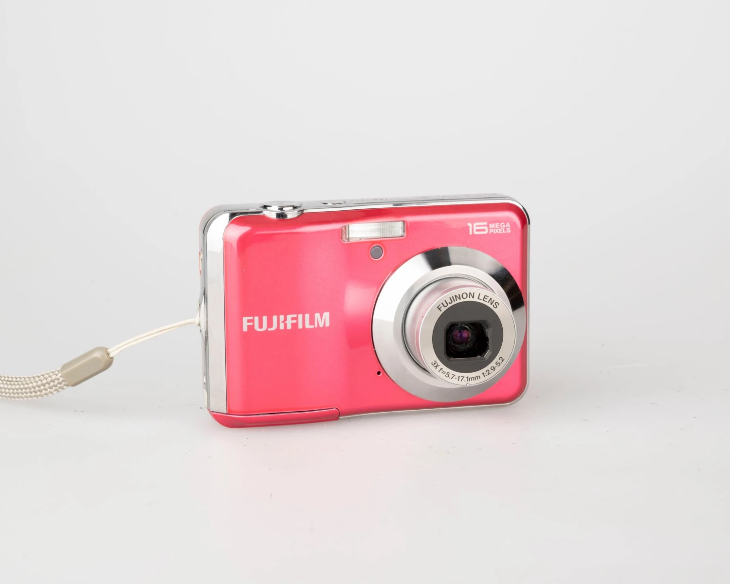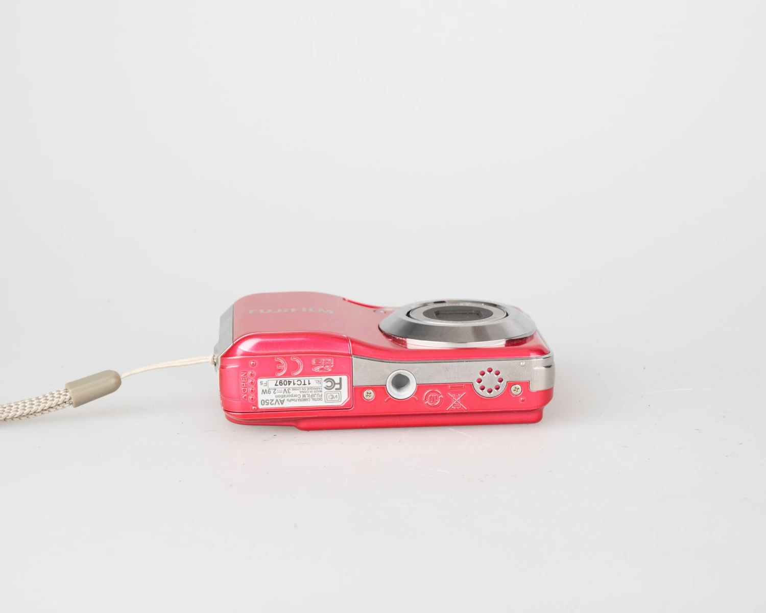 The Fujifilm Finepix AV250 is a circa-2011 digicam featuring a 16 megapixel CCD sensor. Beyond its striking metalic pink colour, this camera is notable for having an unusually fast lens on its wide angle end (F2.8) for a compact digital camera.