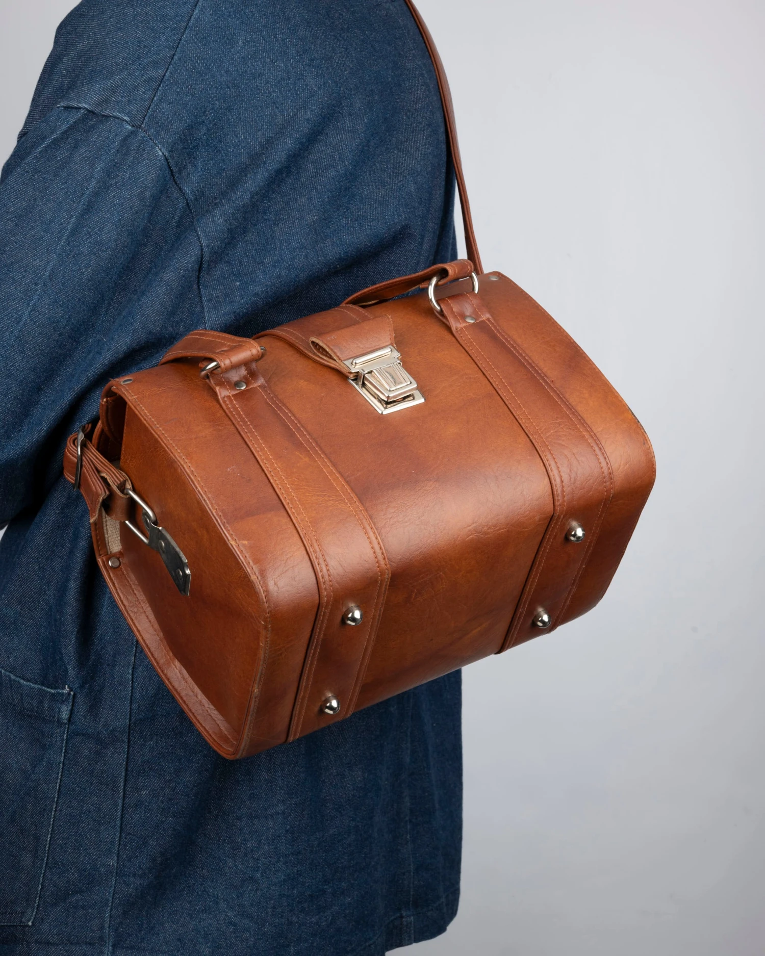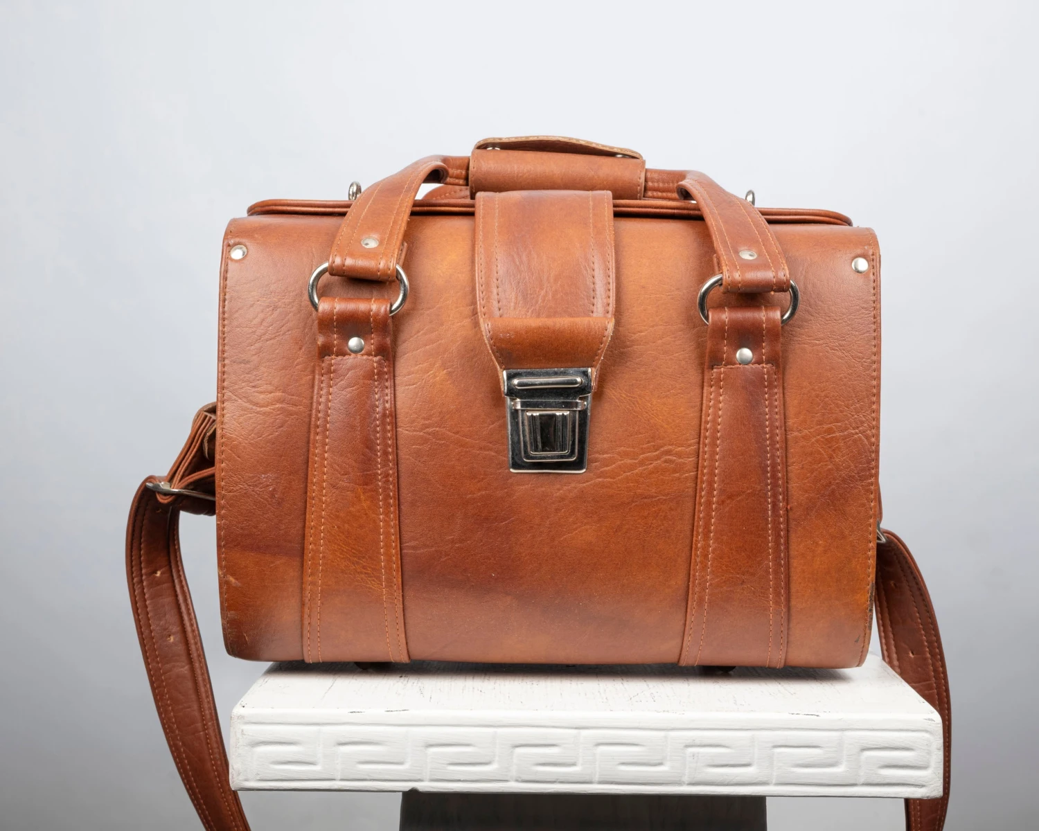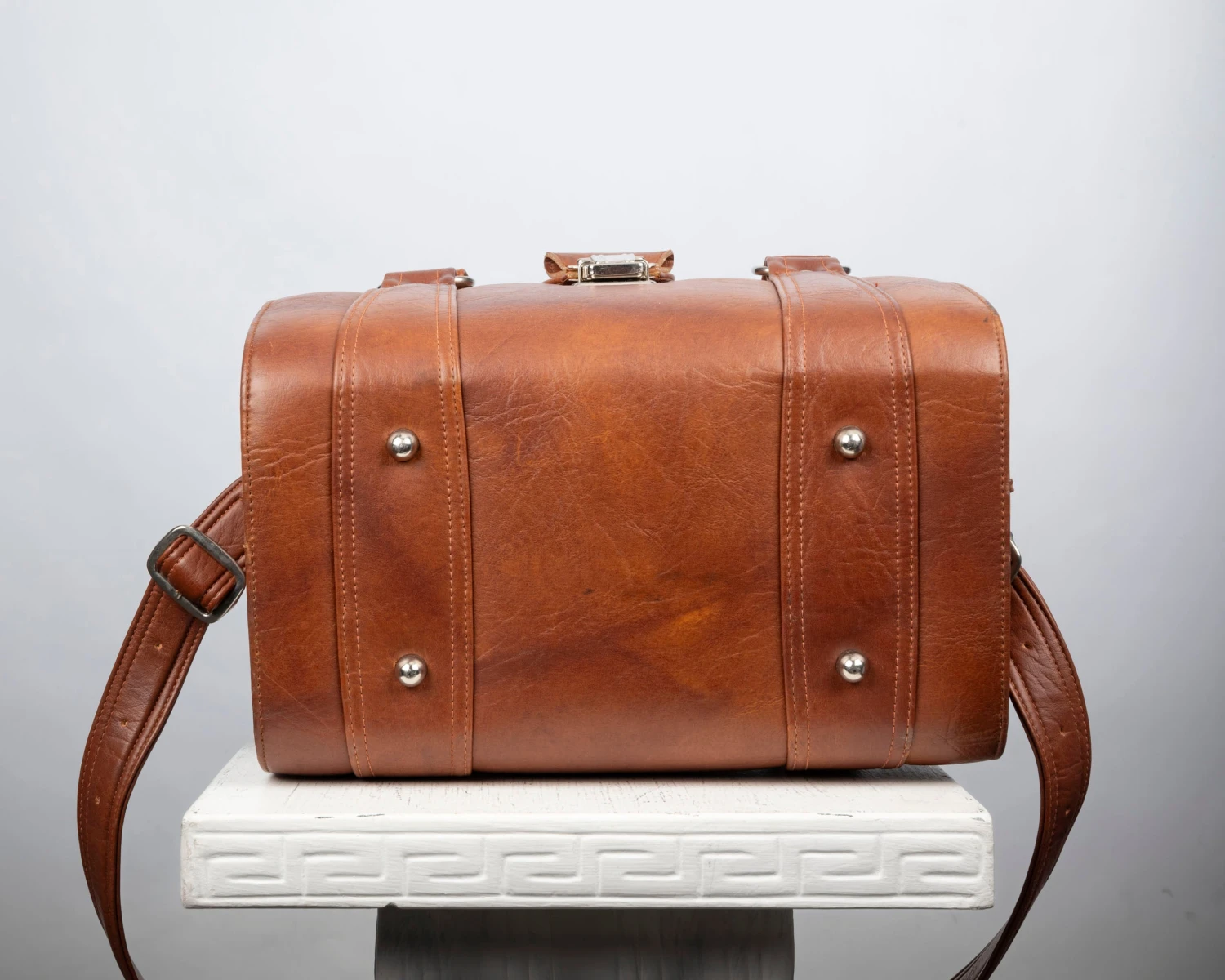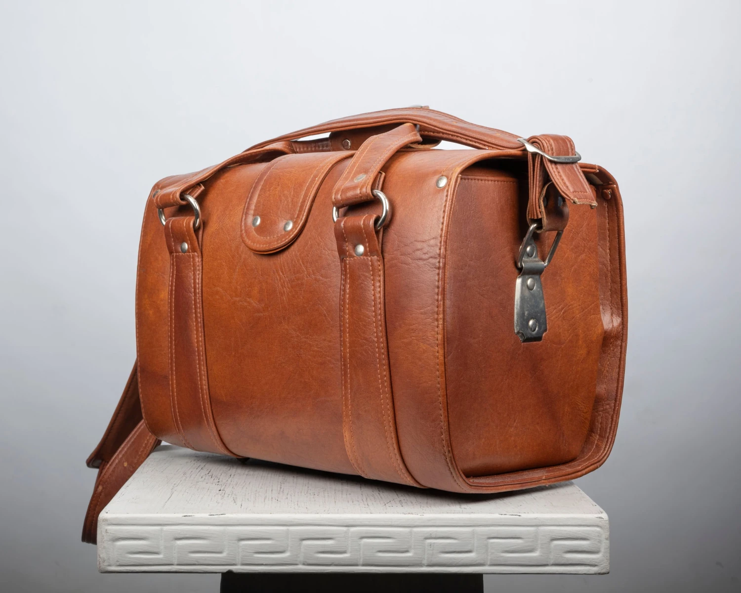 This is a very well-preserved 1970s tan leatherette camera shoulder bag. It features metal top and front clasps so it closes very securely. The bag’s interior feature two ‘levels’: the top ‘shelf’ features a molded area for storing a standard 35mm SLR camera (and an clasp on a strap to keep it in place); the bottom area features compartment for easy storage of lenses, flashes, and film.