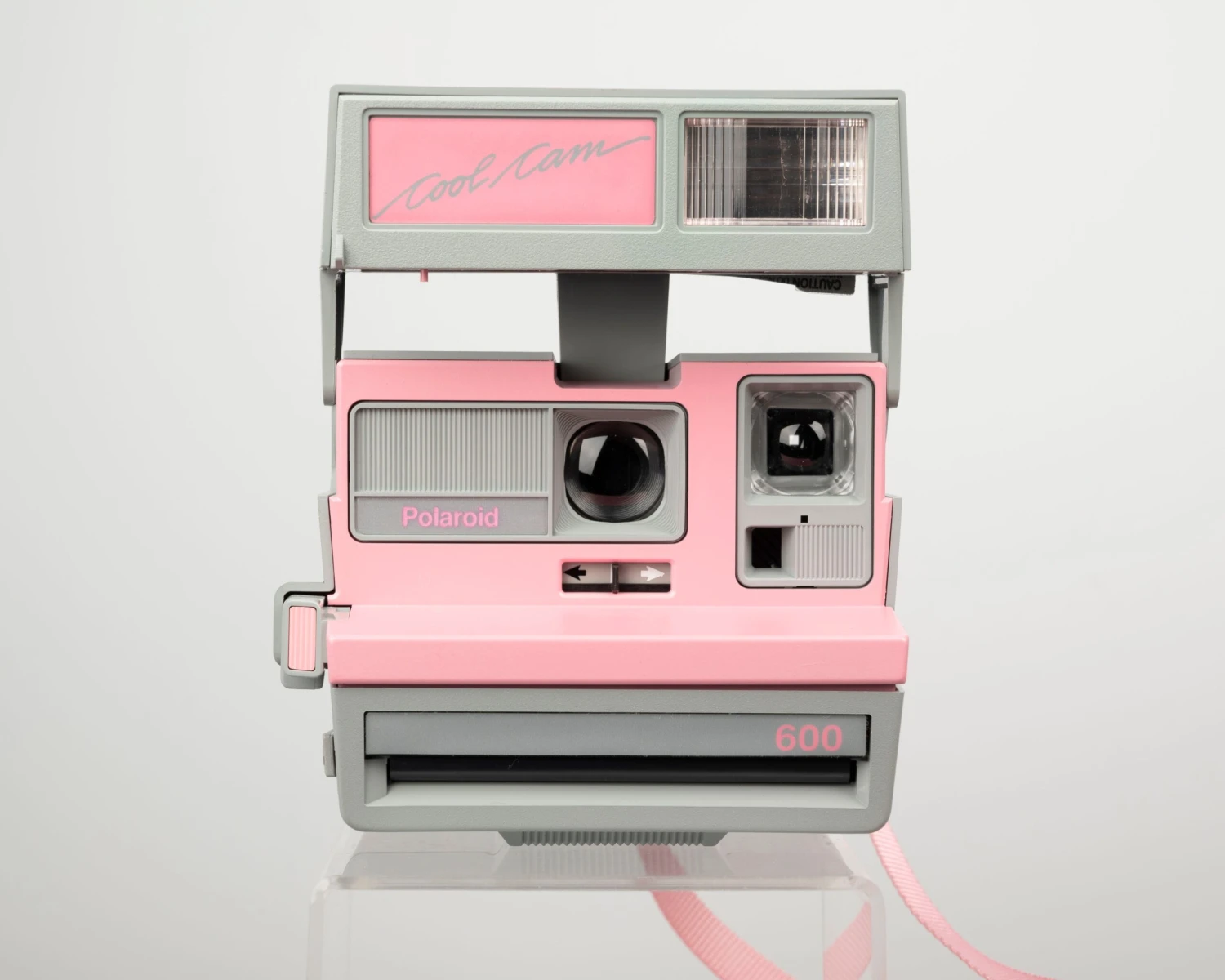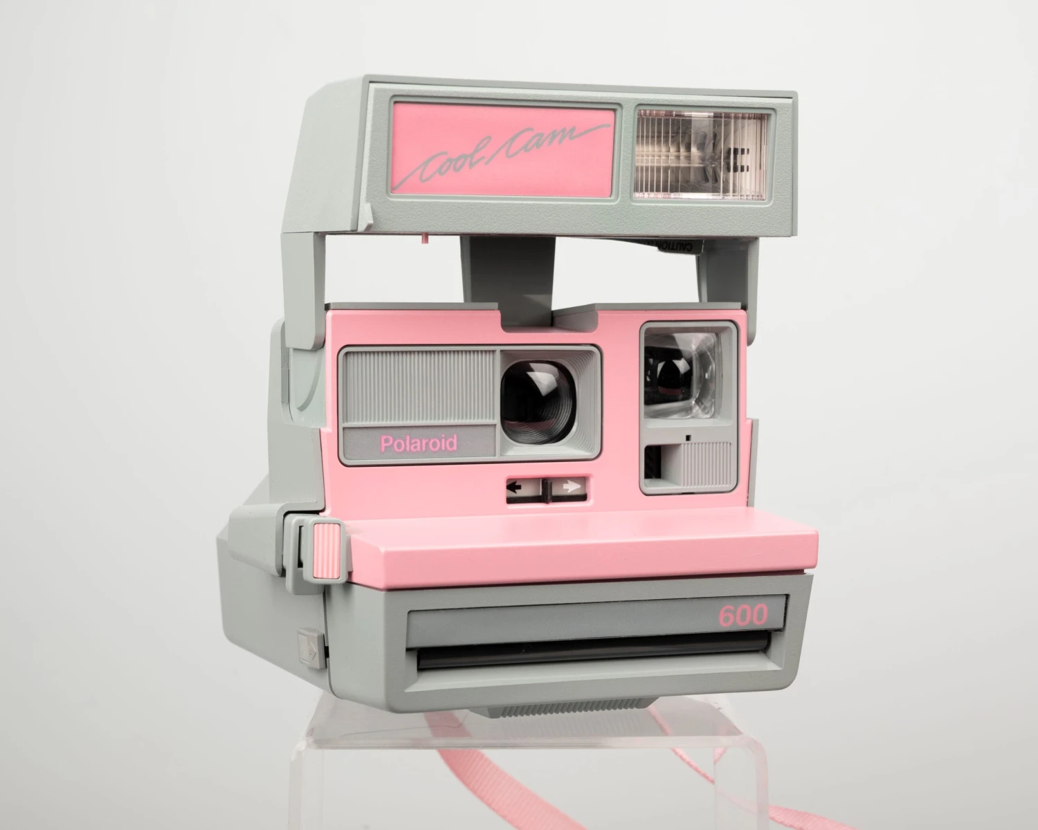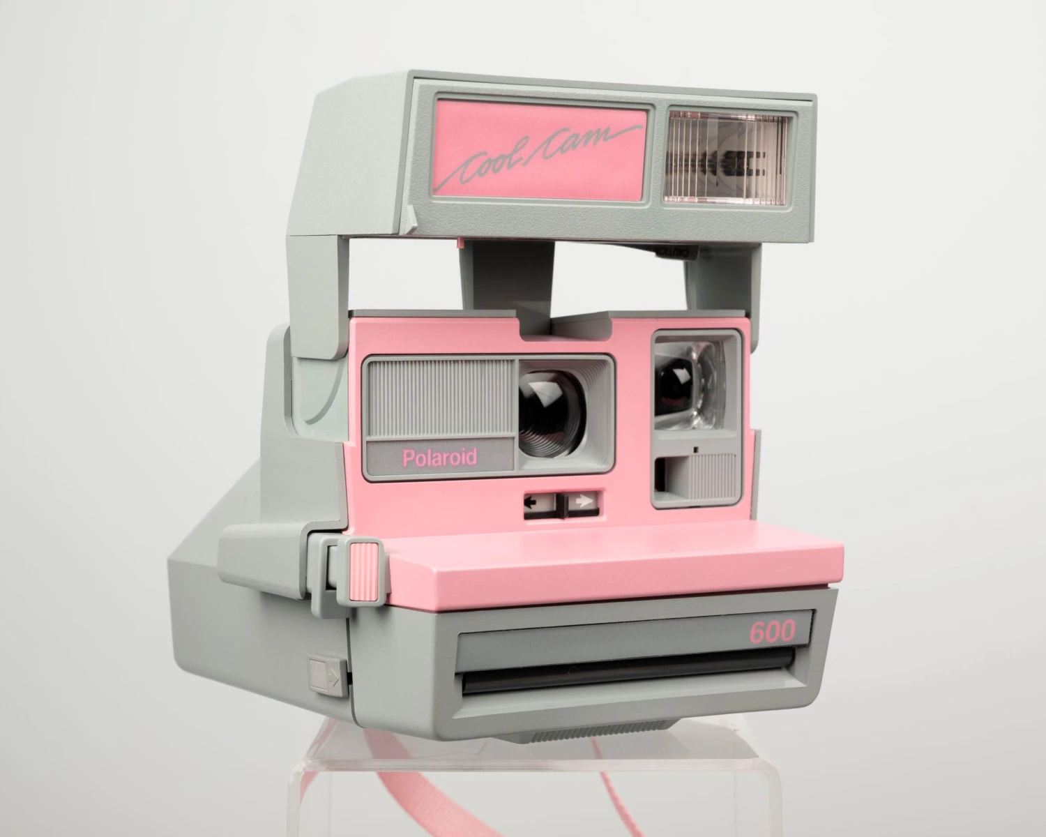 The stylish grey and pink Polaroid Cool Cam is one of the more desirable type-600 instant film cameras from the 1990s.