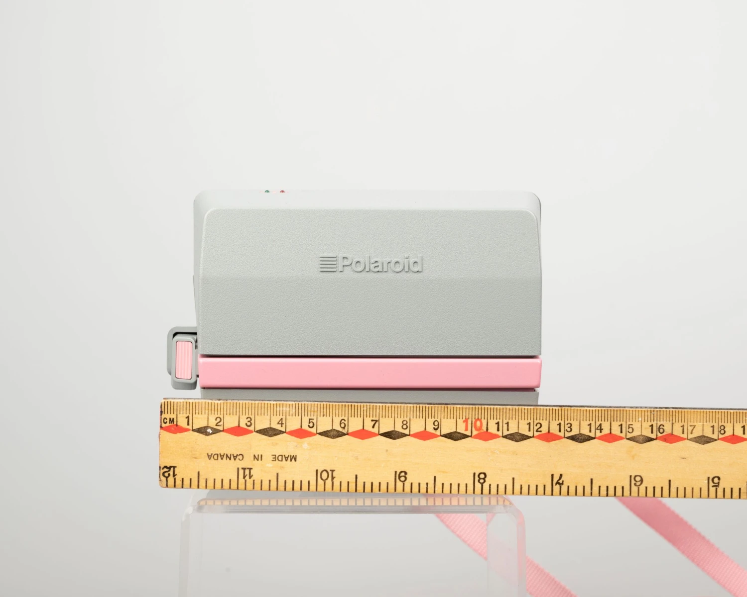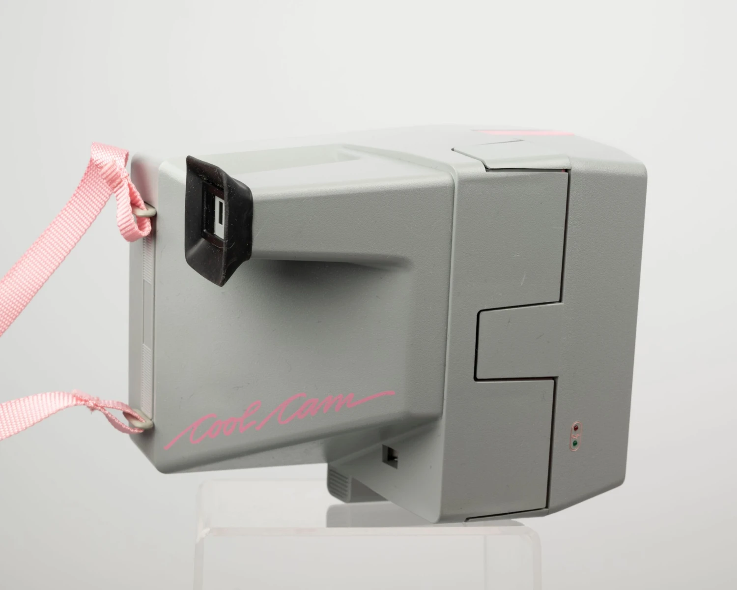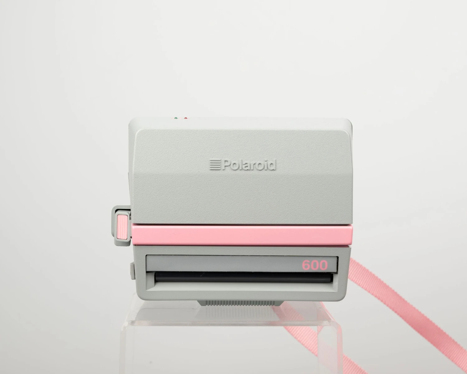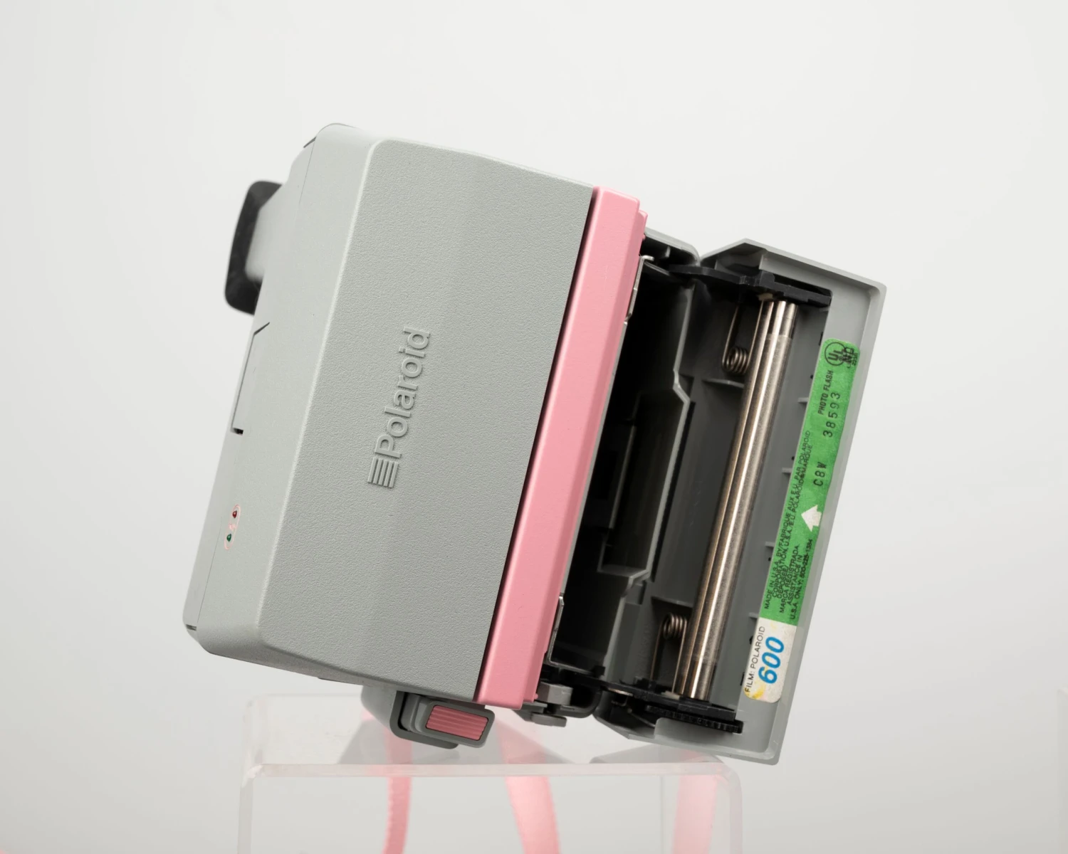 The stylish grey and pink Polaroid Cool Cam is one of the more desirable type-600 instant film cameras from the 1990s.