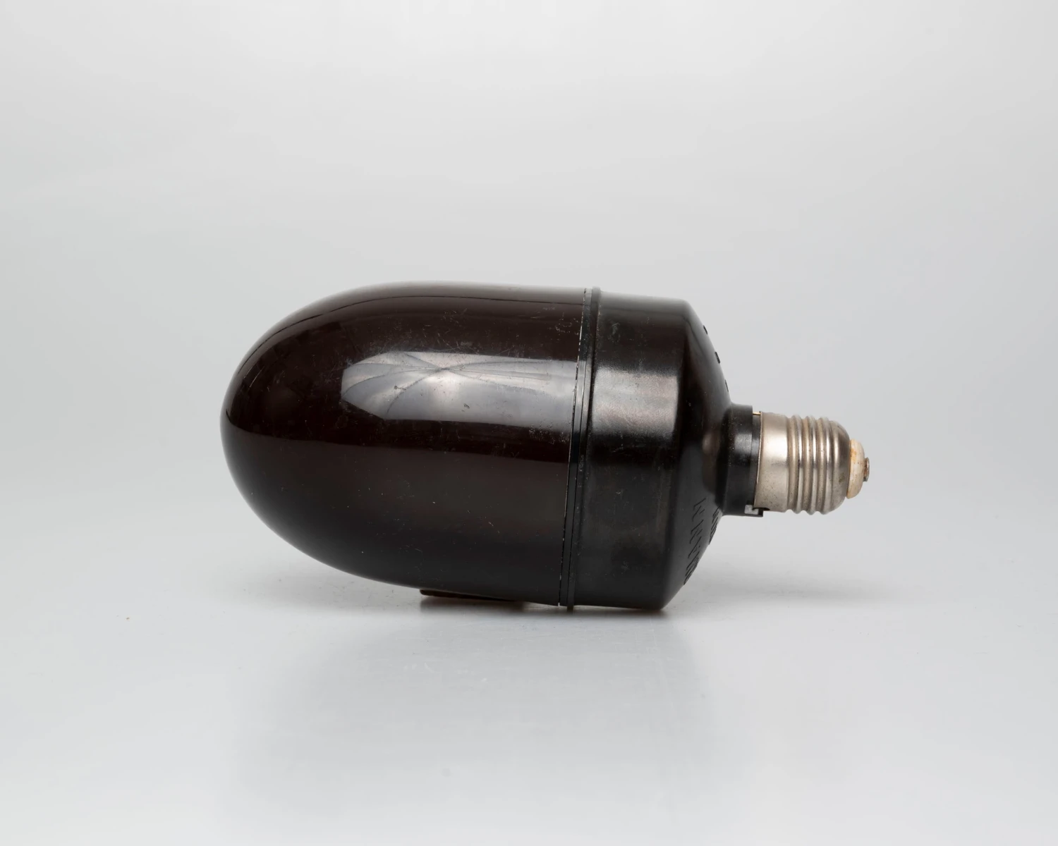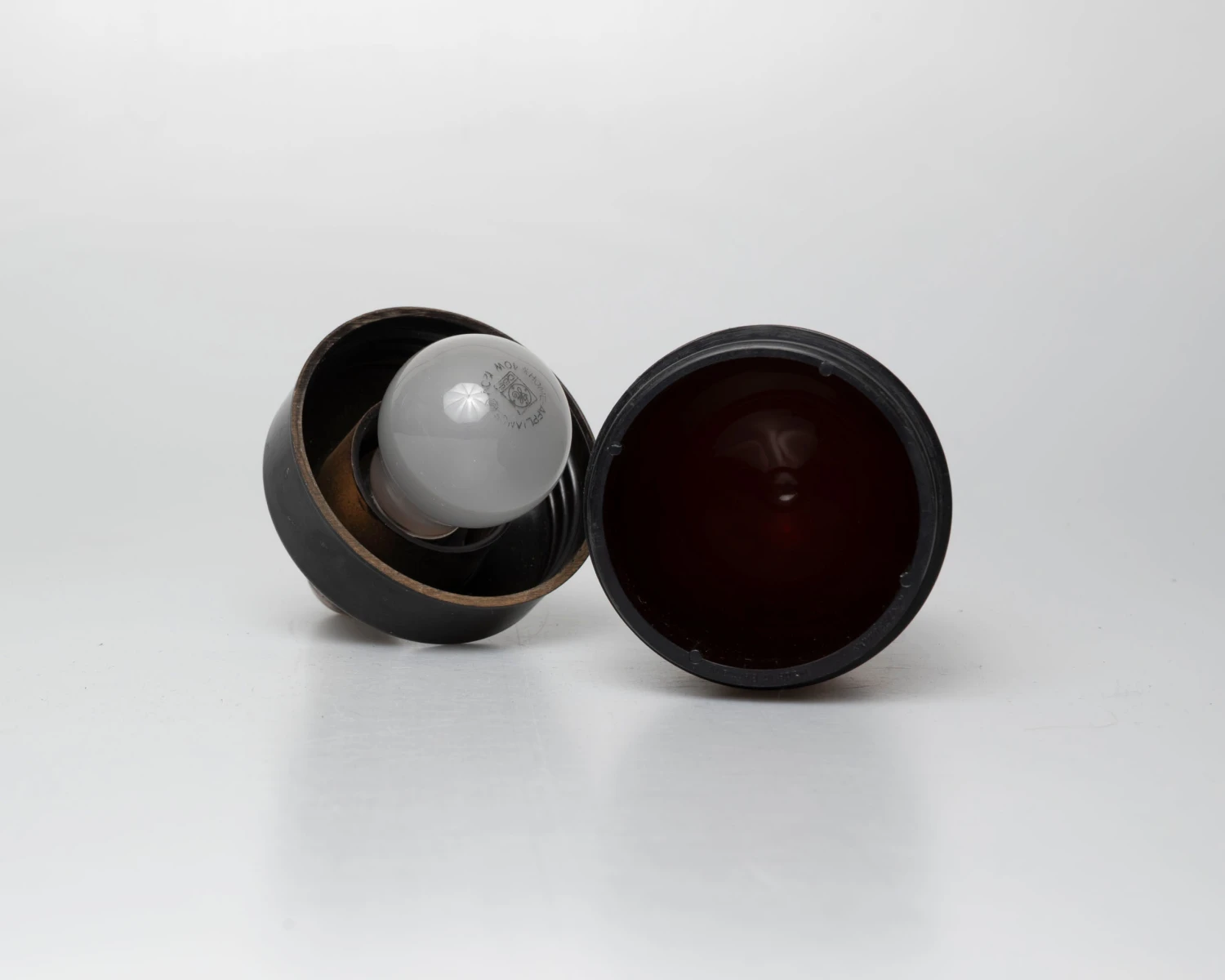 This is a good quality German-made darkroom safelight that fits a standard North American light socket. It provides an amber glow (equivalent to a Kodak OC type) that is suitable for black and white darkroom printing with modern papers. A working 10 watt bulb is also included.