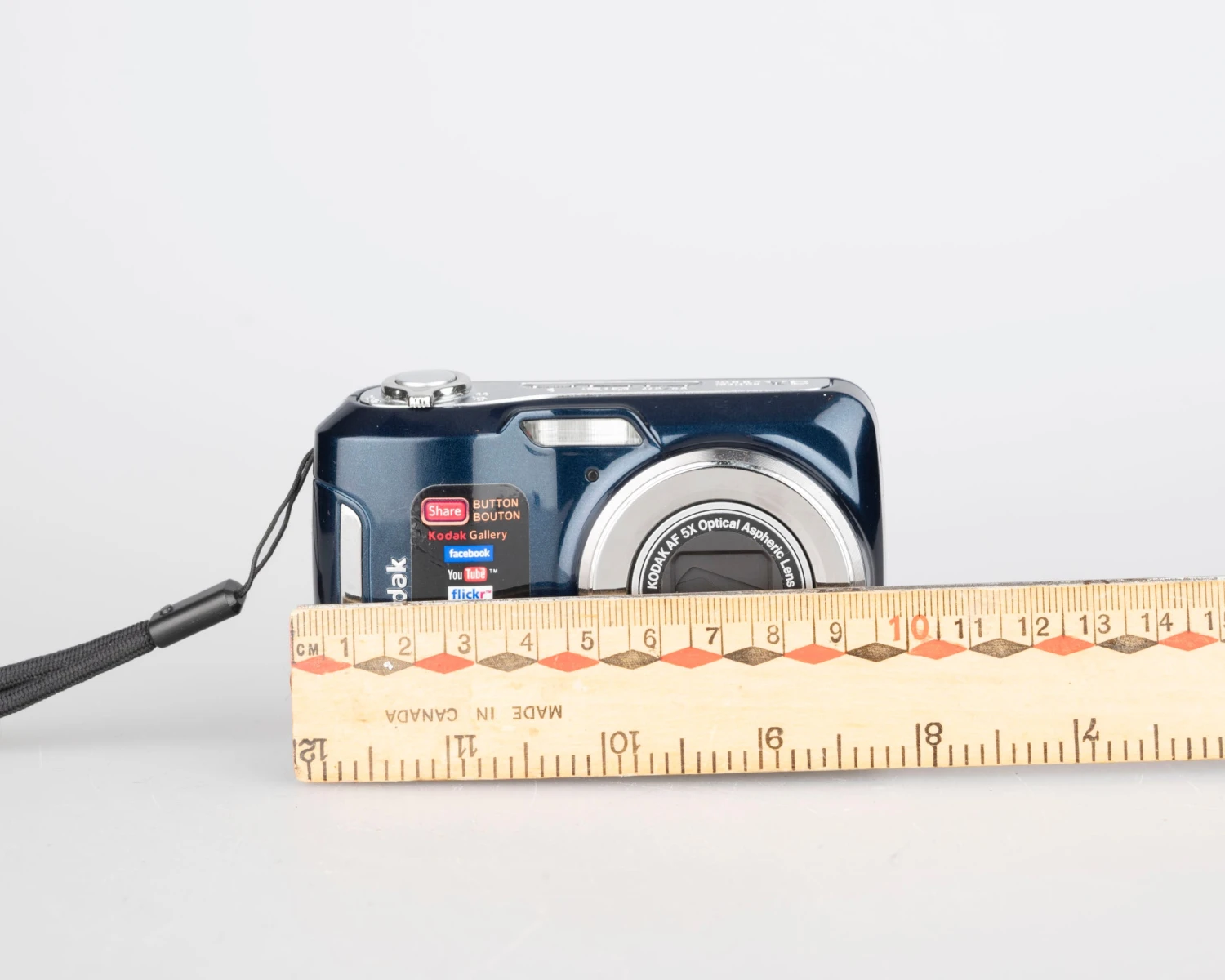 The Kodak Easyshare C195 is a basic compact digicam from circa 2010. This camera features a 14-megapixel CCD sensor and uses two AA batteries (not included) and common SD cards for memory (also not included). However the camera does include a small amount of internal memory to store some photos without an SD card.
