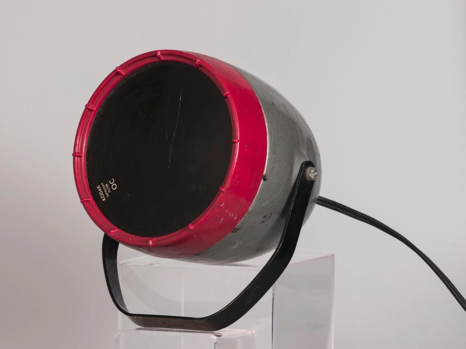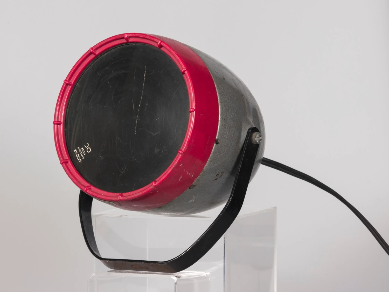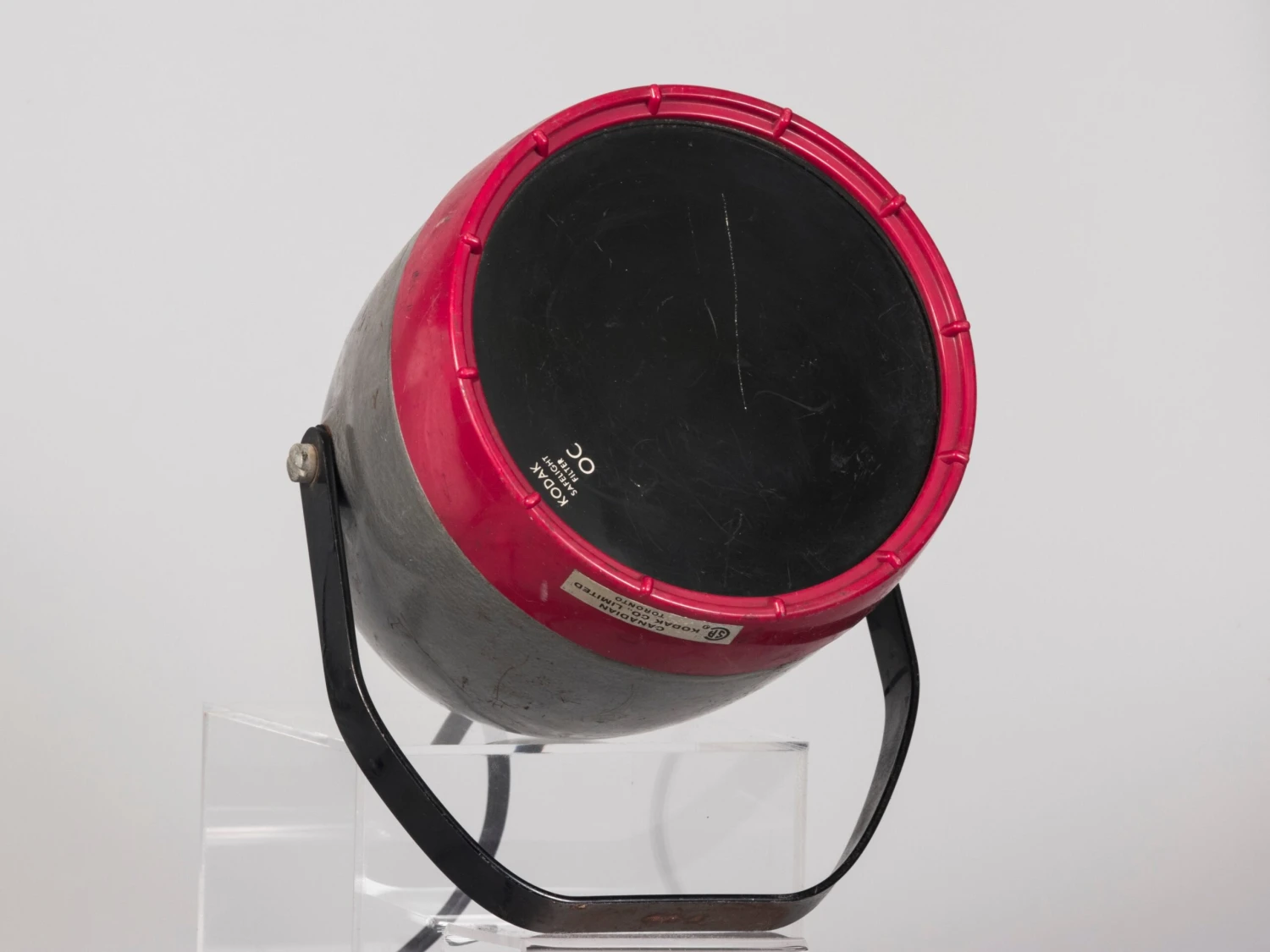 The Kodak Model B safelight is an iconic design, a darkroom standard for decades. This example is in good condition except for scuffing (see photos) and the original owner removed its base (to make it easier to hang by hook or clamp). This is the earlier model with an on/off switch on the power cord.