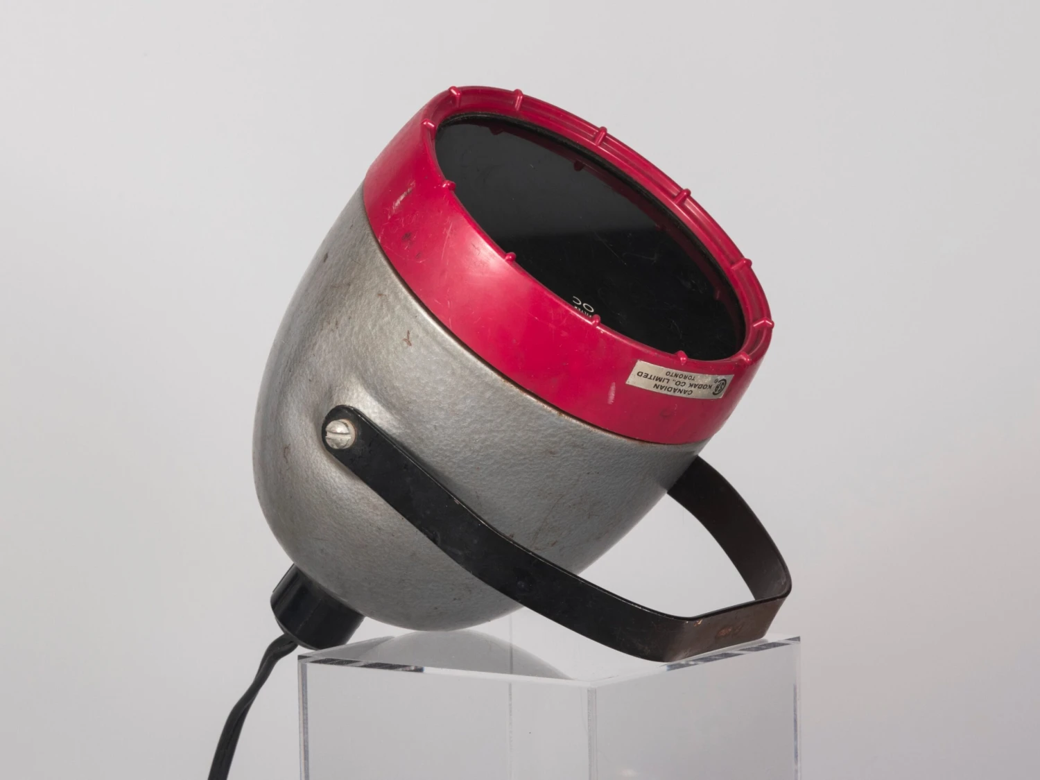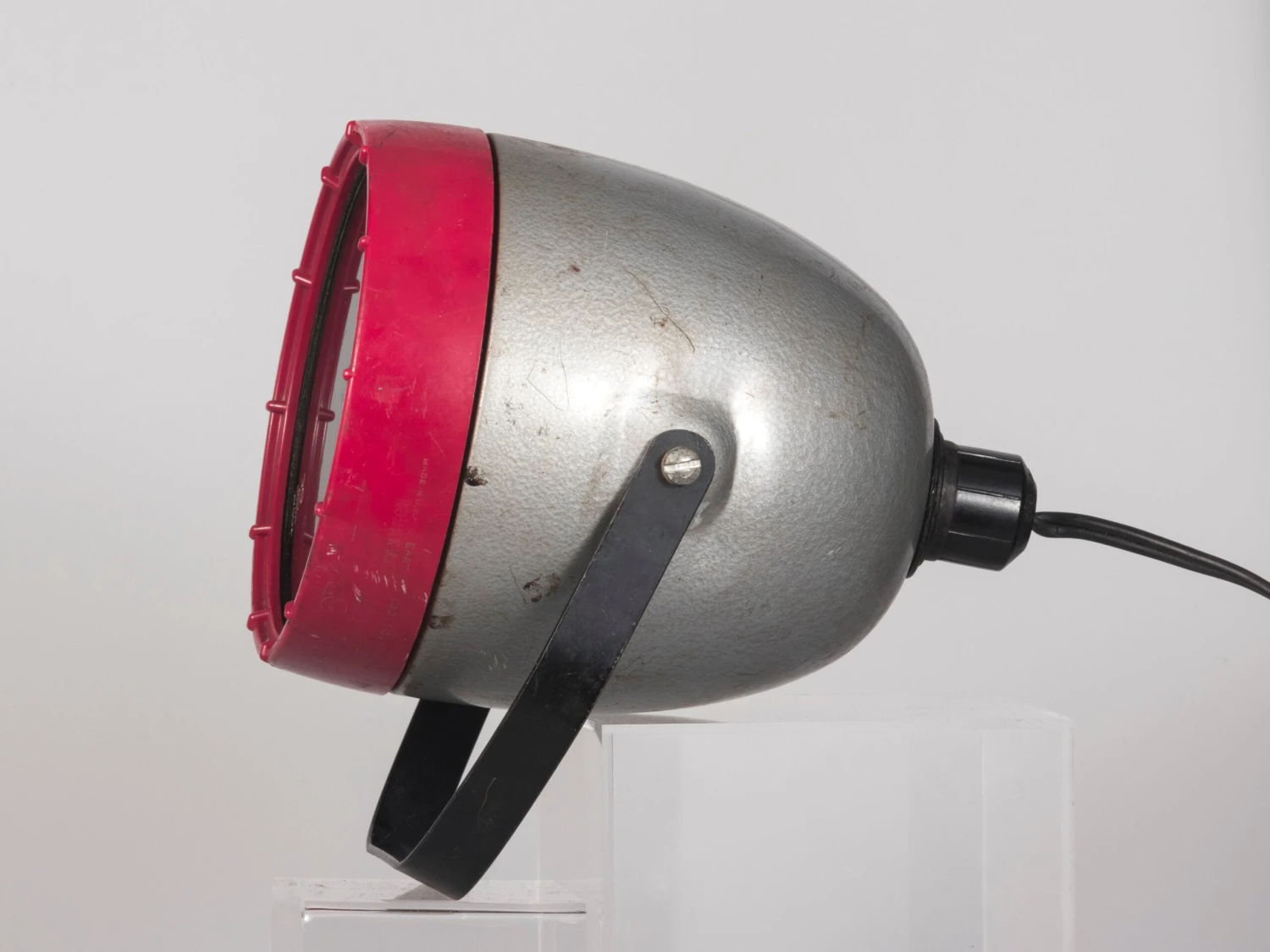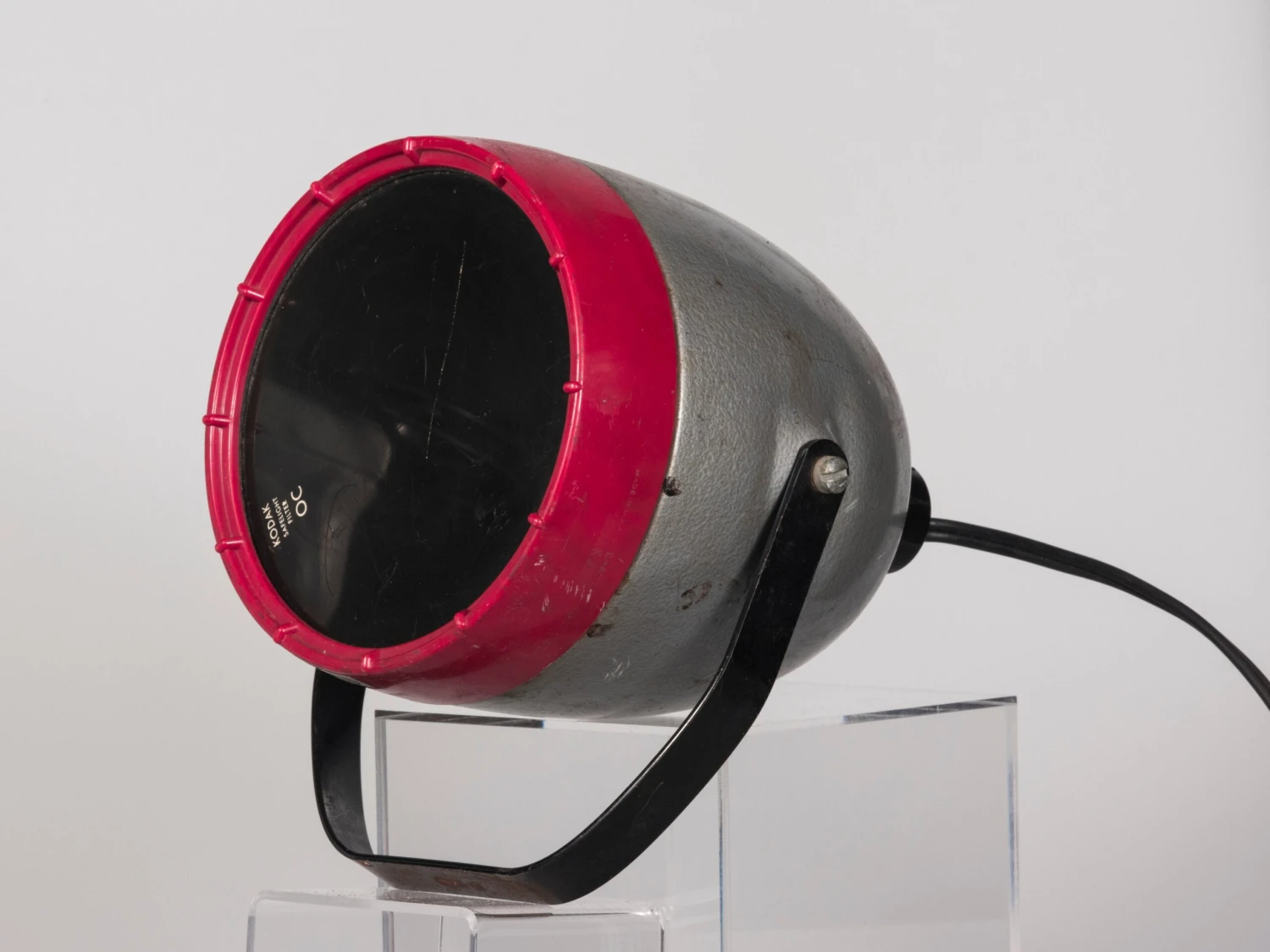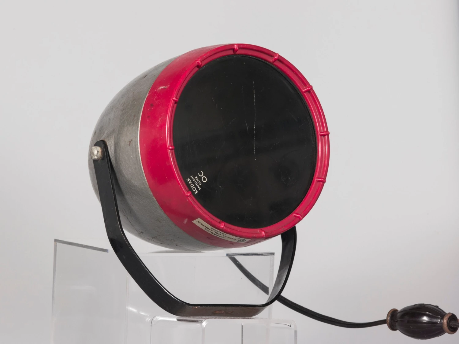 The Kodak Model B safelight is an iconic design, a darkroom standard for decades. This example is in good condition except for scuffing (see photos) and the original owner removed its base (to make it easier to hang by hook or clamp). This is the earlier model with an on/off switch on the power cord.