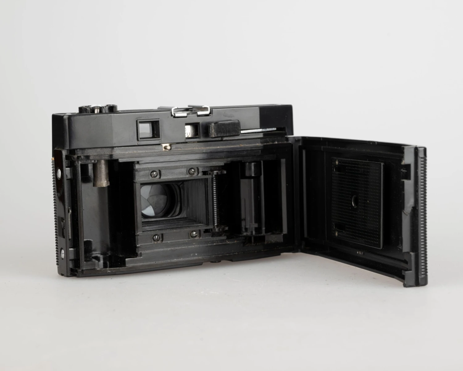 The camera is in very good cosmetic condition. In addition, it’s functioning very well, firing at all shutter speeds. We verified the infinity focus and confirmed that the flash shoe is triggering correctly. The case is in overall good condition but the back rivet is a bit loose (it doesn’t seem to affect its ability to stay closed).