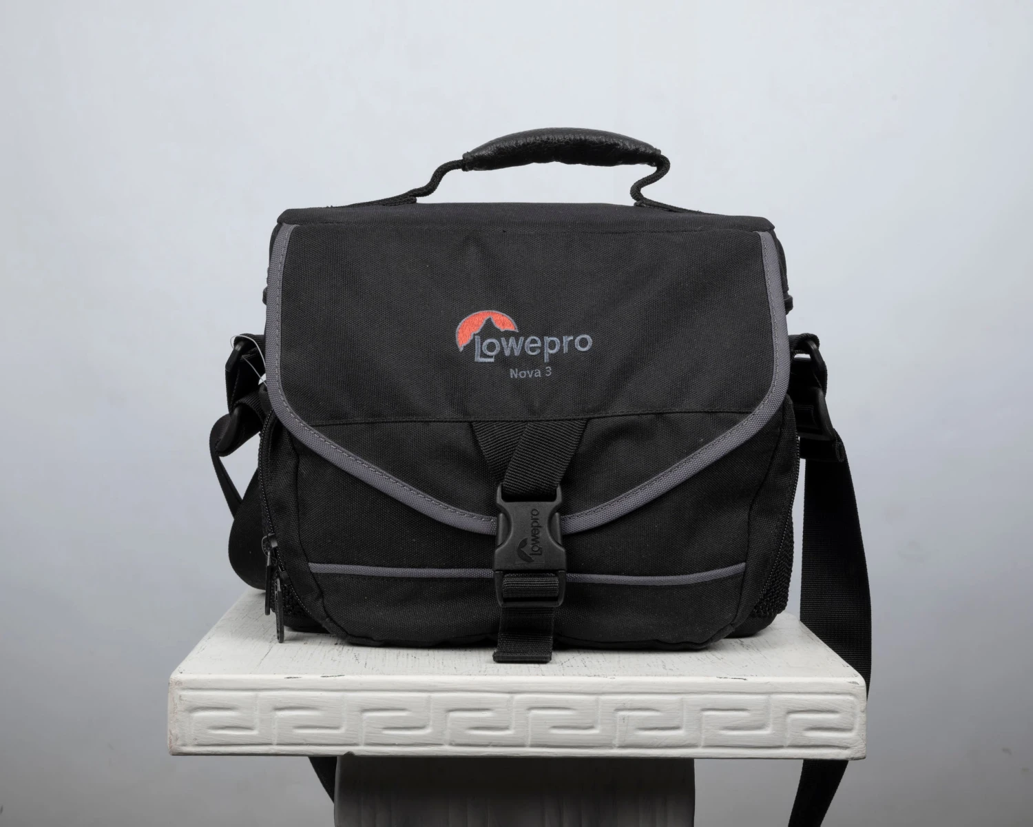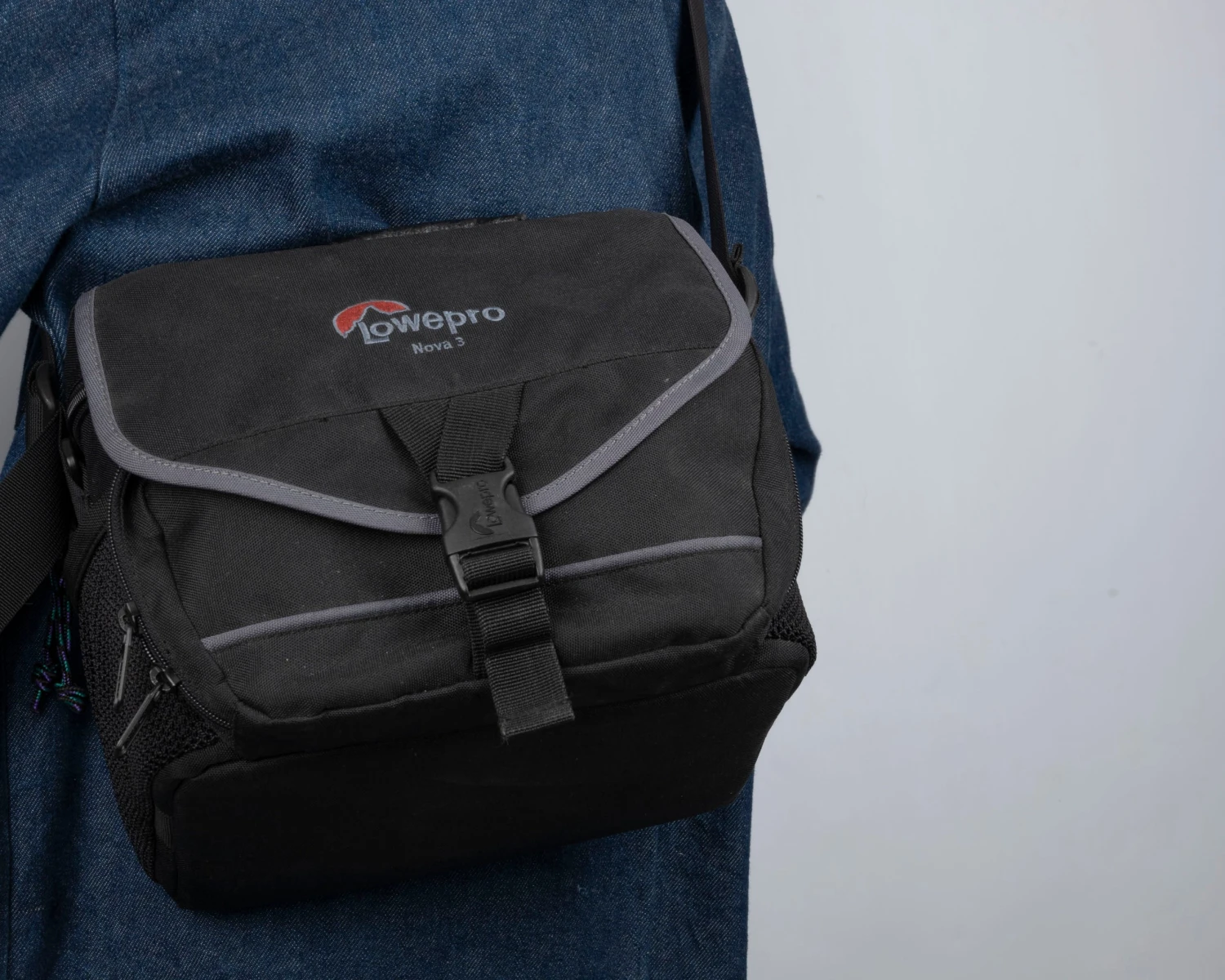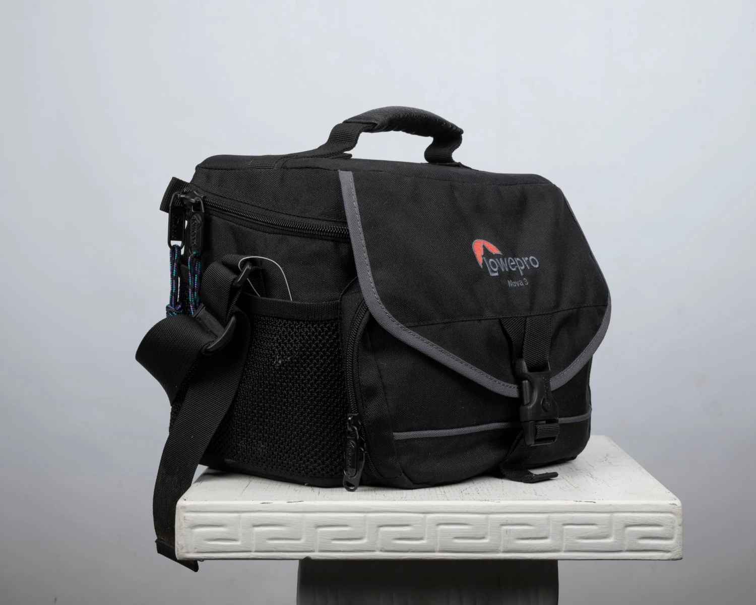 The Lowepro Nova 3 is a shoulder bag designed for camera and video equipment. It features an adjustable main compartment and detachable film bag (located in the front pocket). It also offers mesh side pockets.