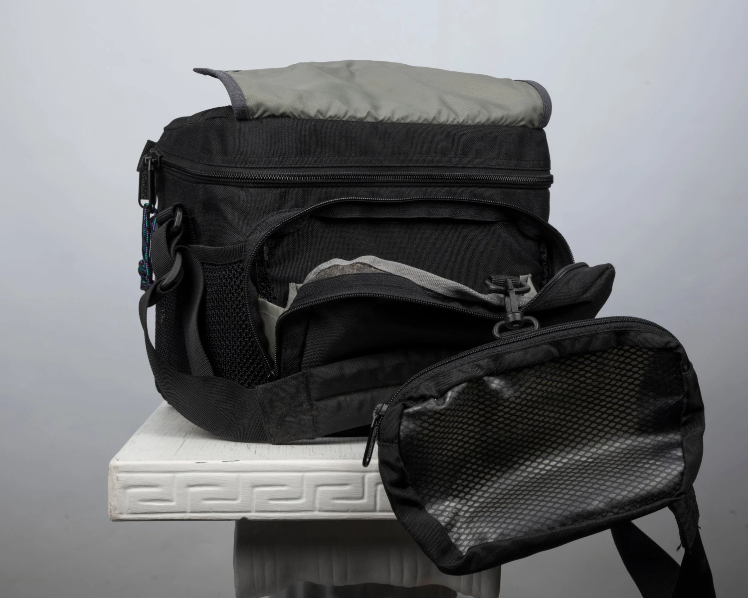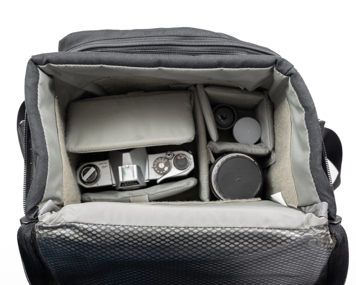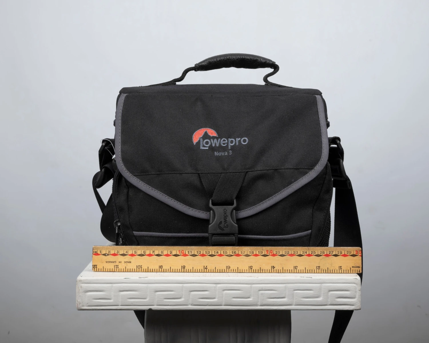 The Lowepro Nova 3 is a shoulder bag designed for camera and video equipment. It features an adjustable main compartment and detachable film bag (located in the front pocket). It also offers mesh side pockets.