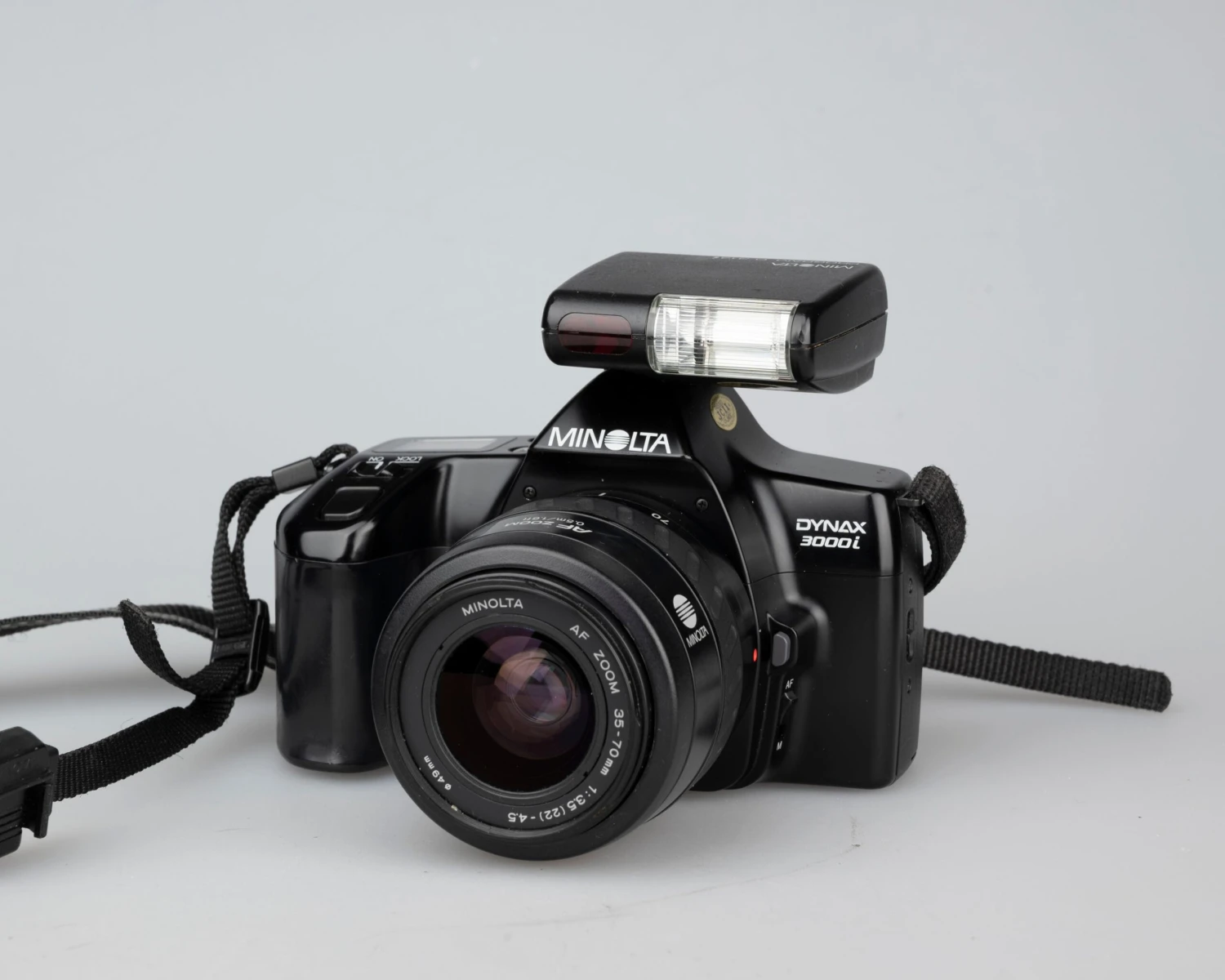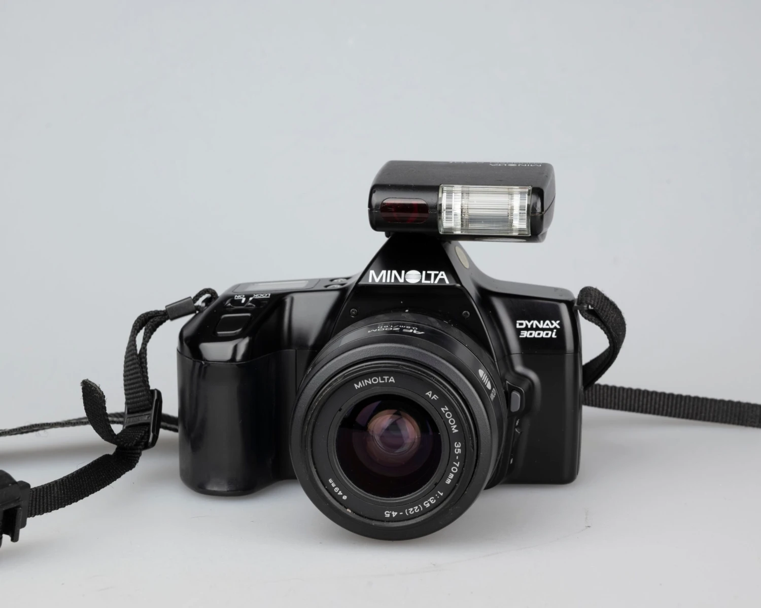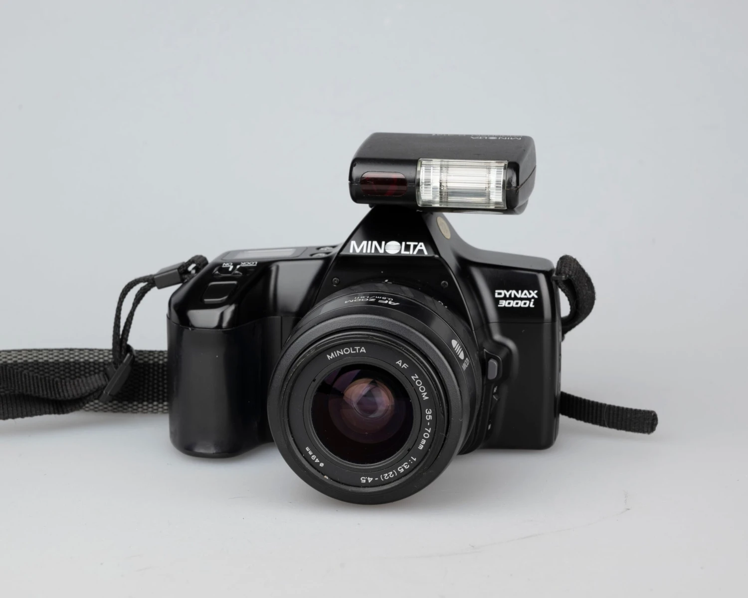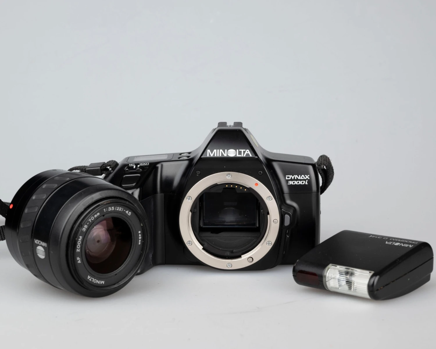If you’re looking for point-and-shoot ease of use combined with the quality, flexibility, and high percentage of good photos (film isn’t free!) that you get with an SLR, the Dynax 3000i might be a good choice. The camera (also known as the Dynax 3000i) is an incredibly simple-to-use 35mm film SLR camera from the early 90s. It includes a Minolta AF 35-70mm f3.5-4.5 zoom lens. A Minolta Maxxum D314 i flash is also included.