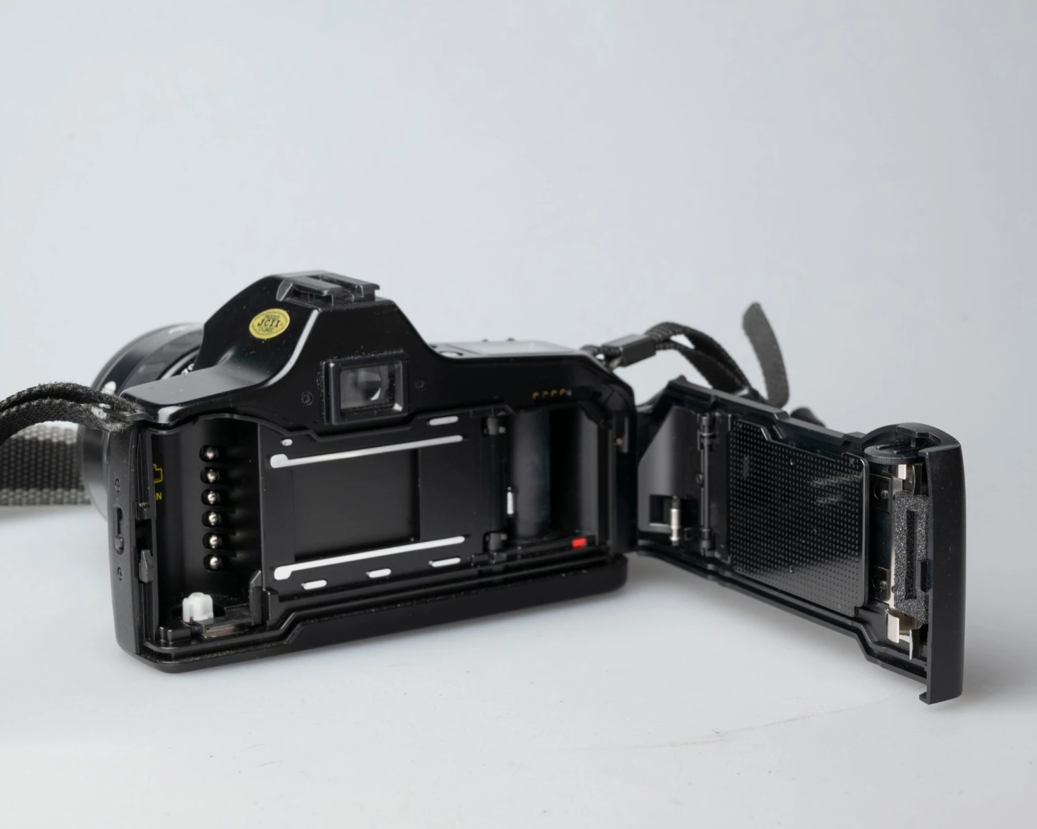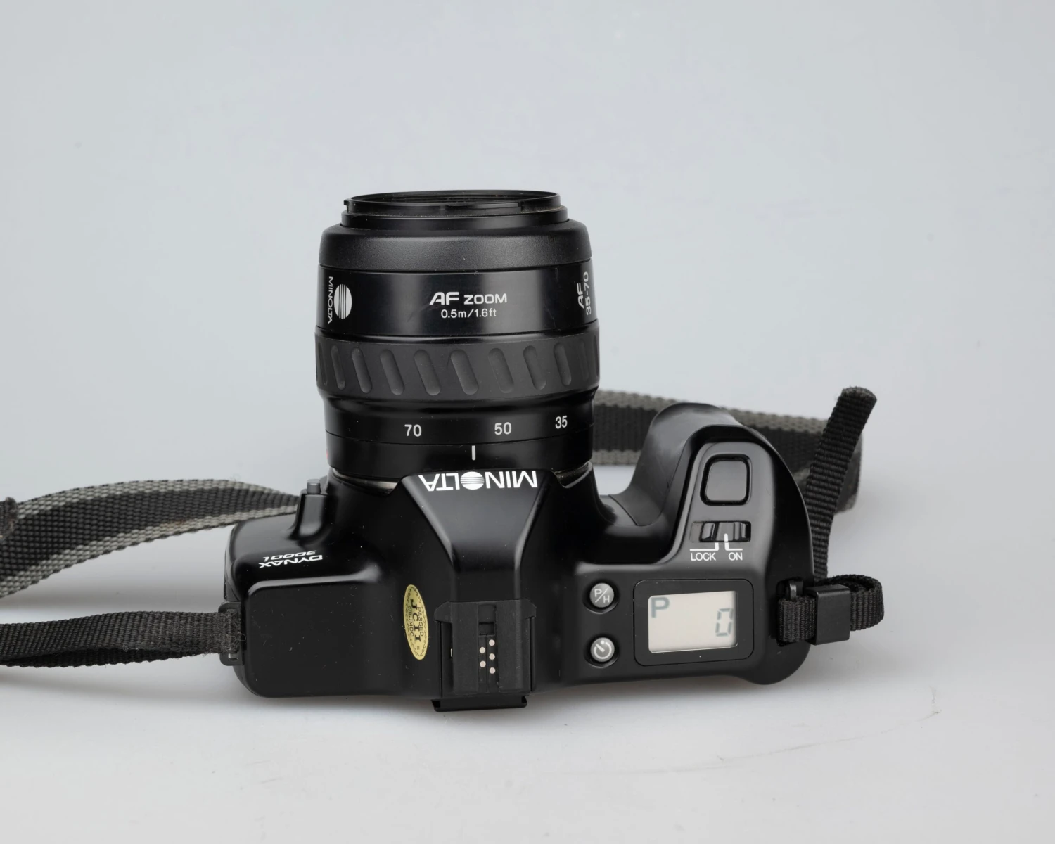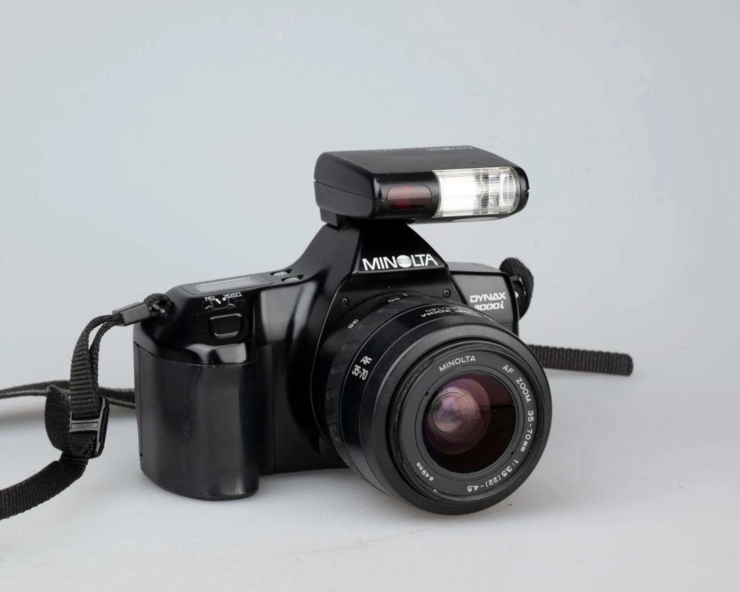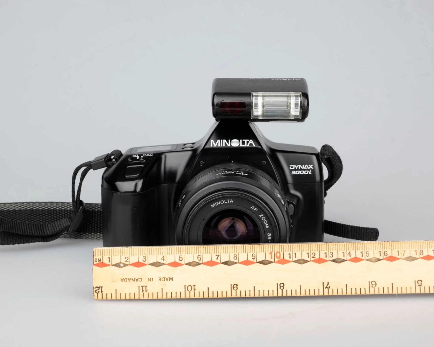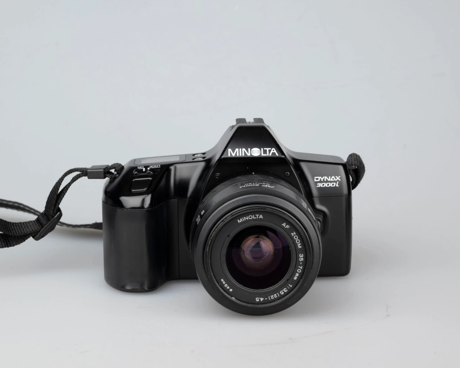 If you’re looking for point-and-shoot ease of use combined with the quality, flexibility, and high percentage of good photos (film isn’t free!) that you get with an SLR, the Dynax 3000i might be a good choice. The camera (also known as the Dynax 3000i) is an incredibly simple-to-use 35mm film SLR camera from the early 90s. It includes a Minolta AF 35-70mm f3.5-4.5 zoom lens. A Minolta Maxxum D314 i flash is also included.