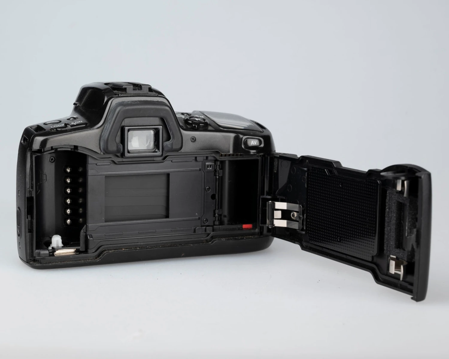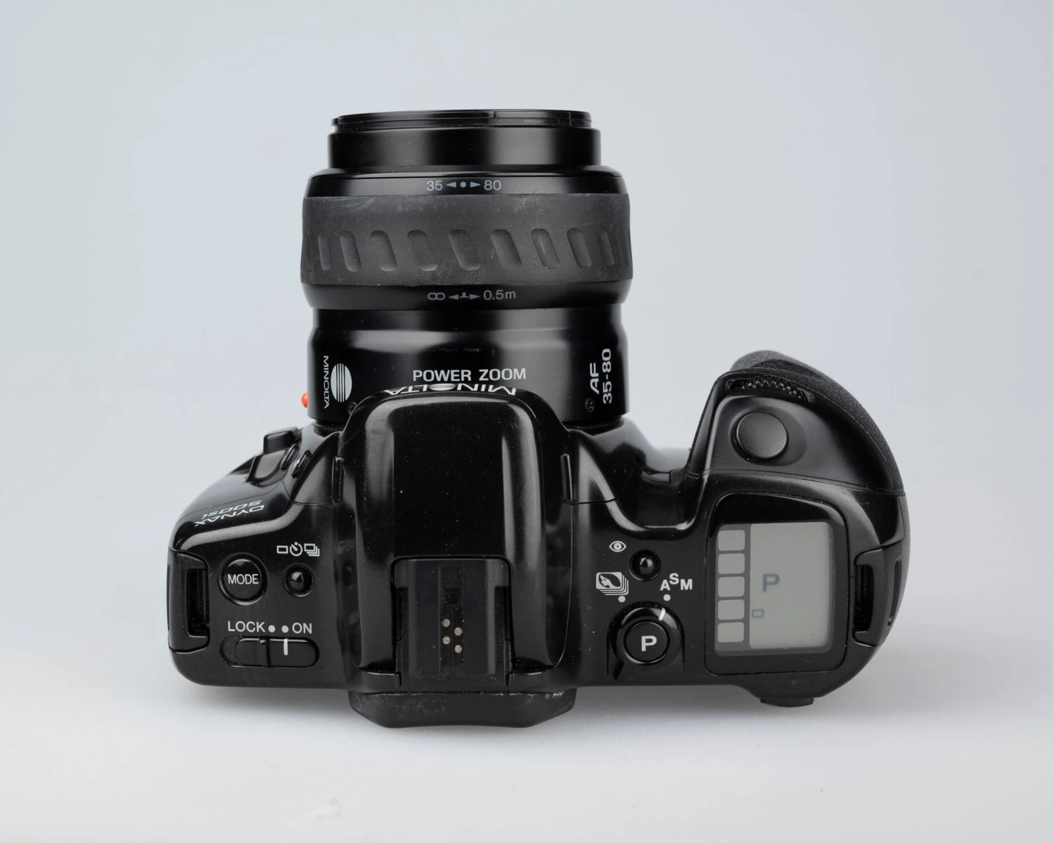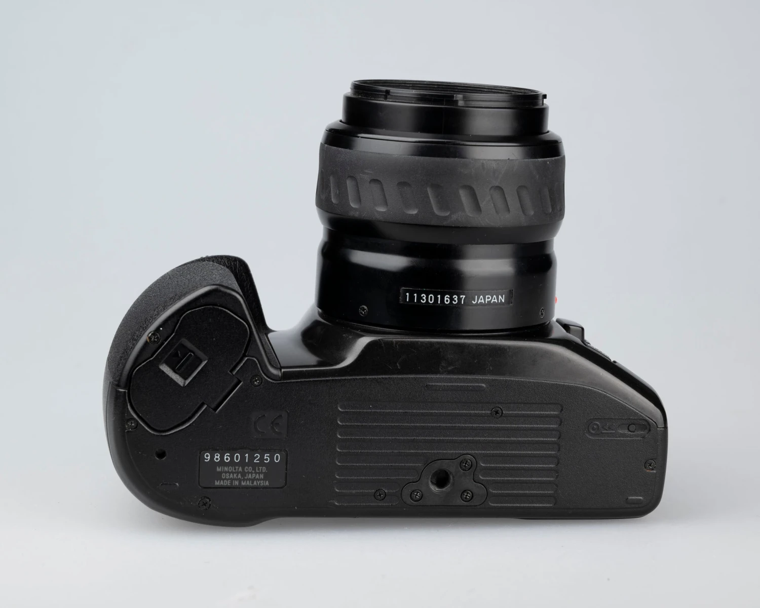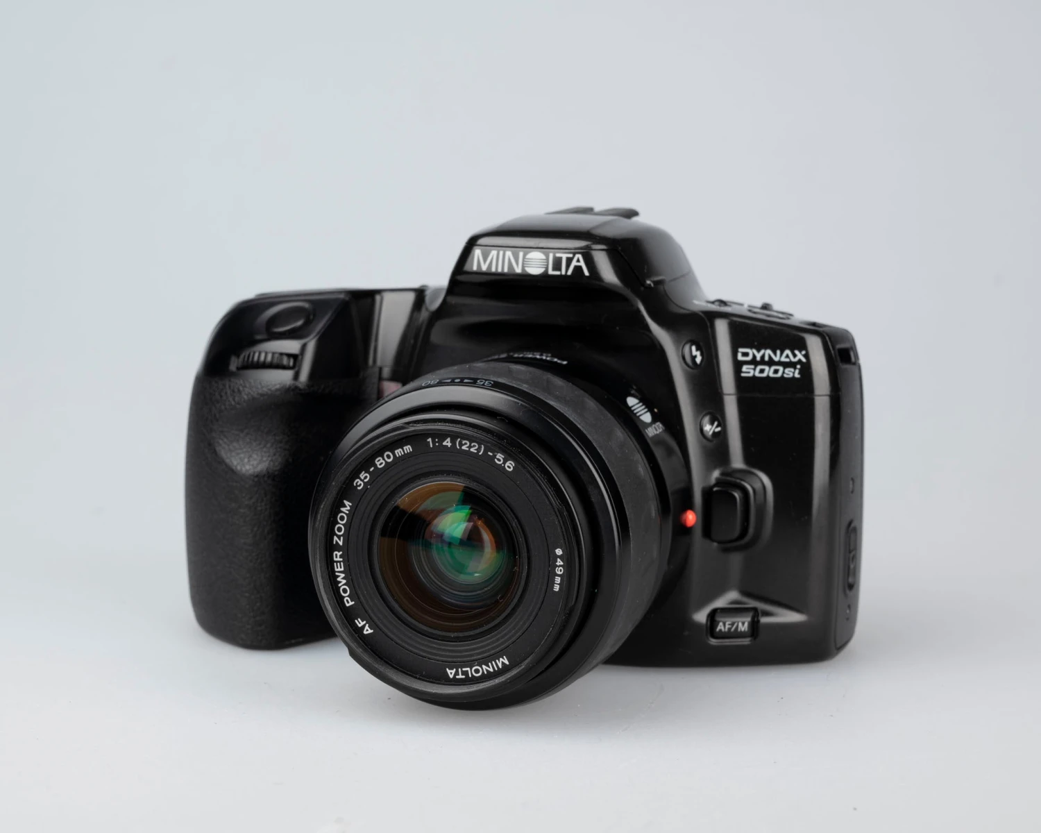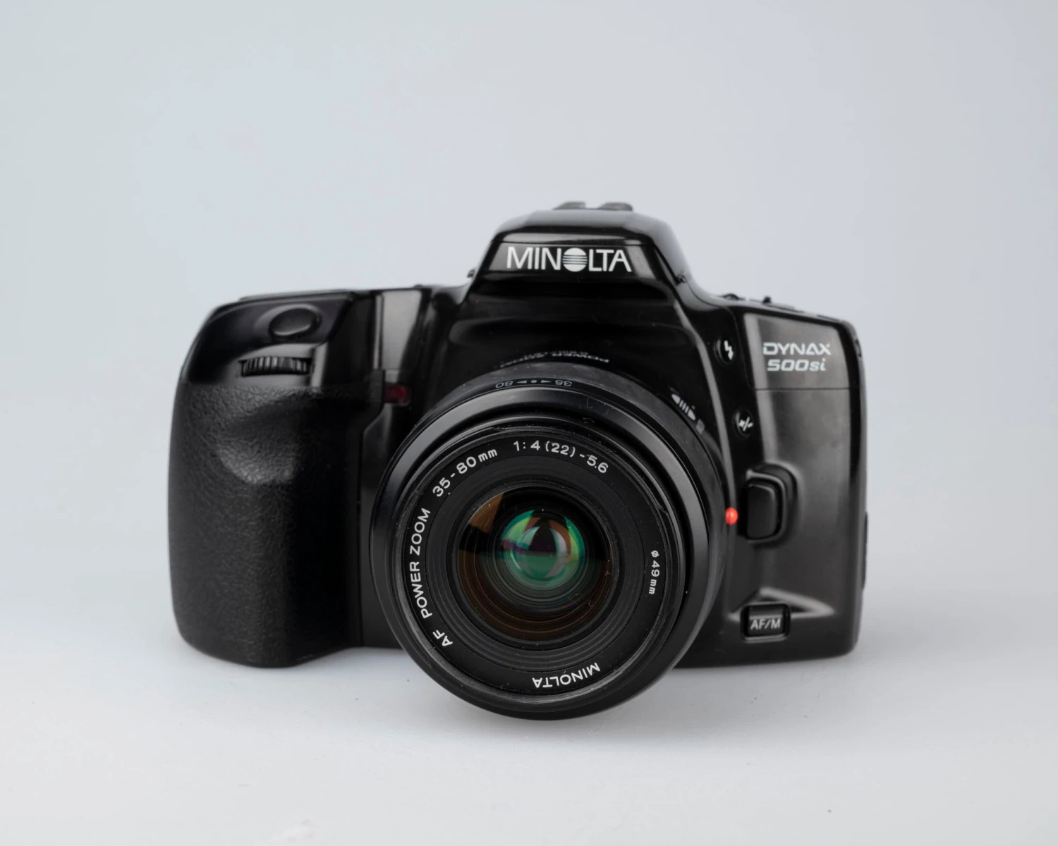 The Minolta Dynax 500si (aka Maxxum 400si) is a sophisticated 35mm film SLR camera from the mid 1990s. This was a mid-range offering in Minolta’s lineup with a wide array of features. It features full manual, shutter priority, aperture priority, and program exposure modes. The included lens is a compact 35-80mm power zoom, ideal for portraits, sports, and nature. It also features a pop-up integrated flash.