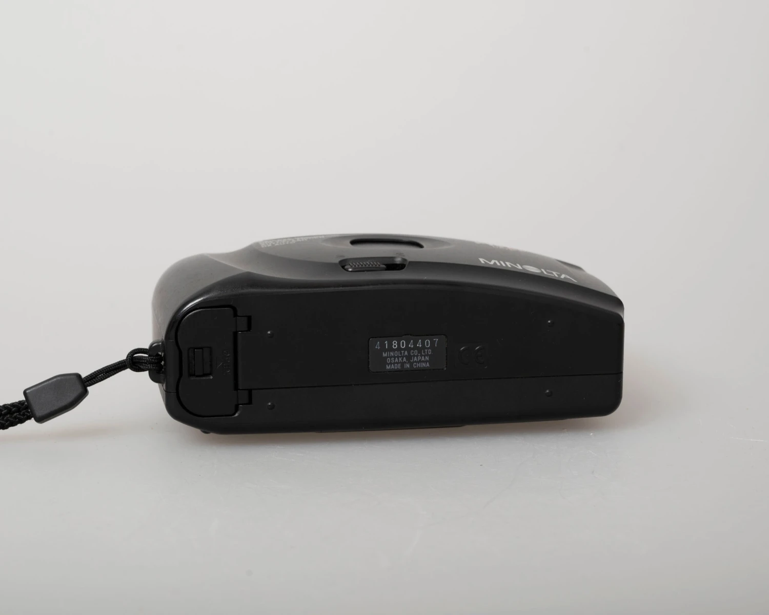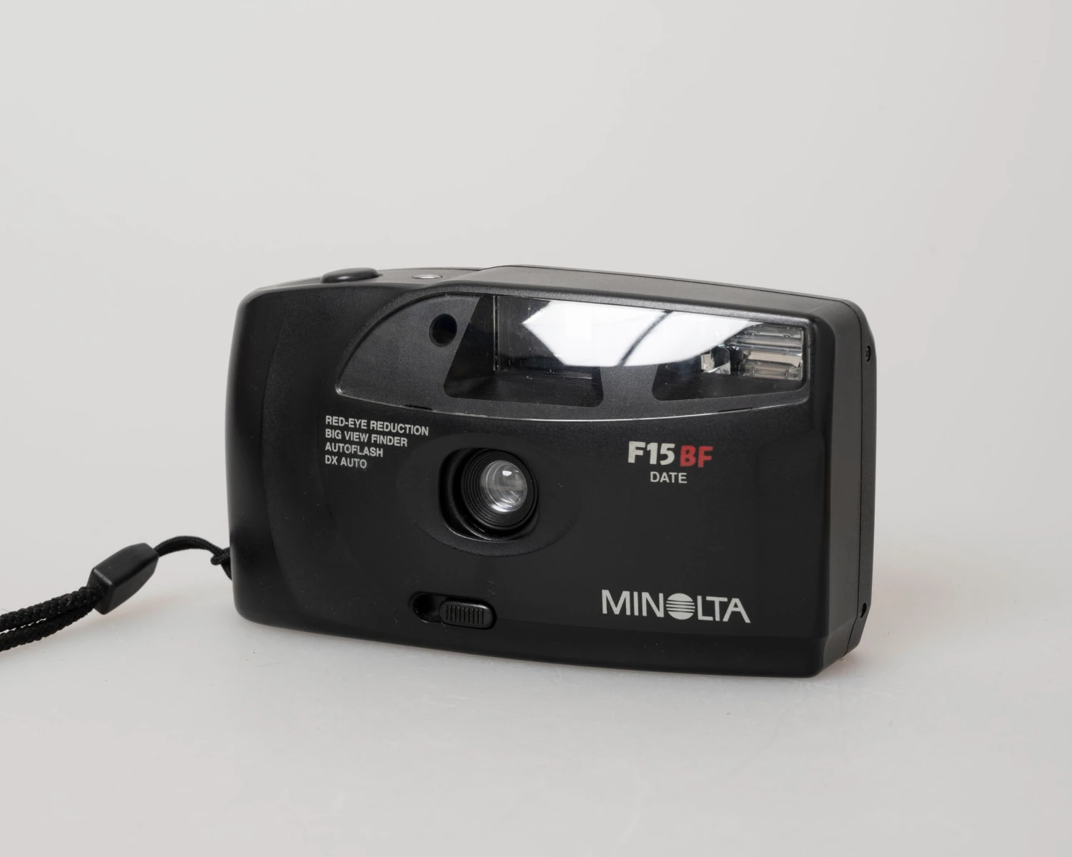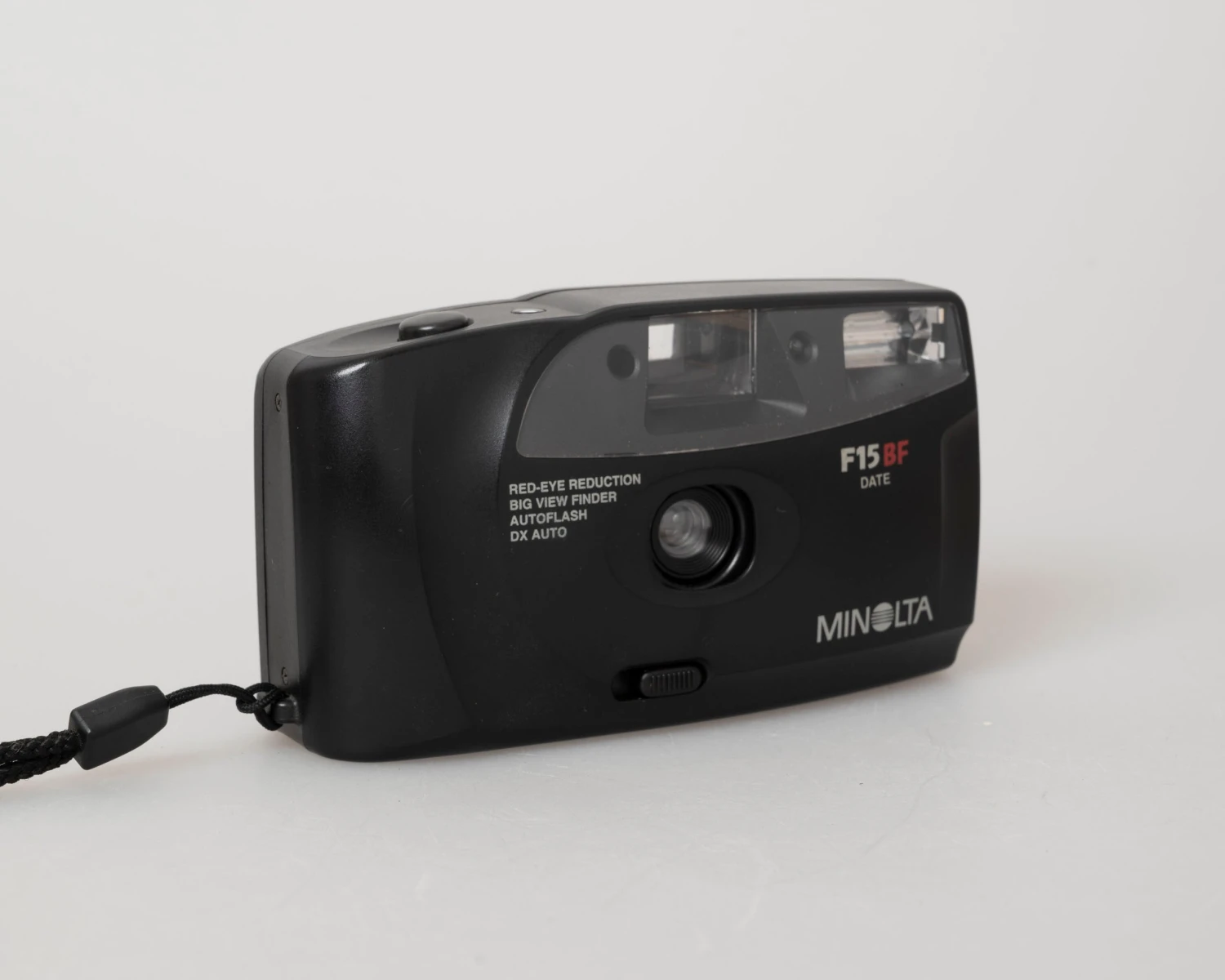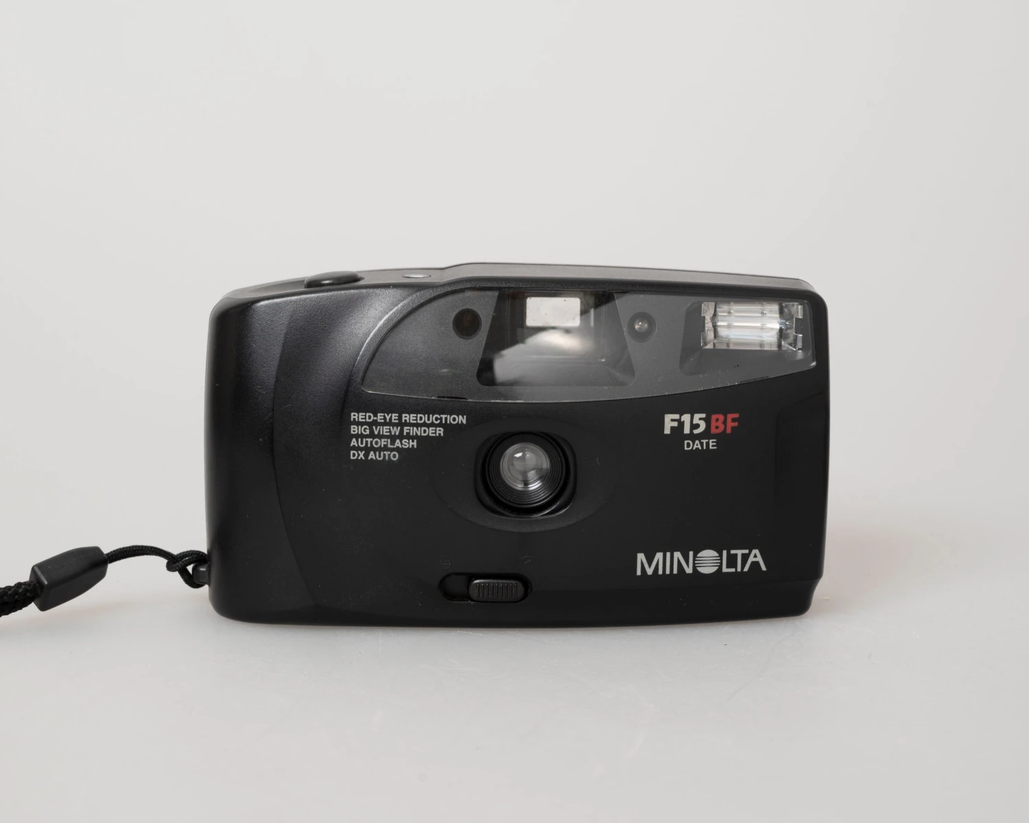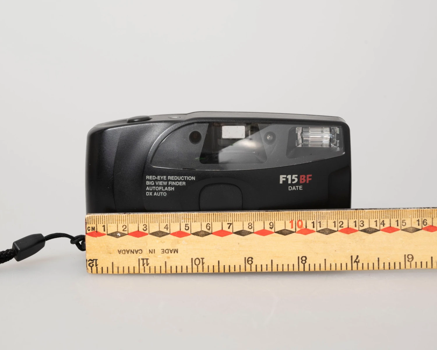 The Minolta F15BF is a simple and ruggedly built focus-free autoexposure 35mm film camera from the late 1990s. The camera requires two AA batteries (not included). I haven’t been able to locate the full specifications for this camera but it seems to be identical to the Minolta F10BF except that its 35mm lens has a slightly larger maximum aperture (f4 vs f5.6).