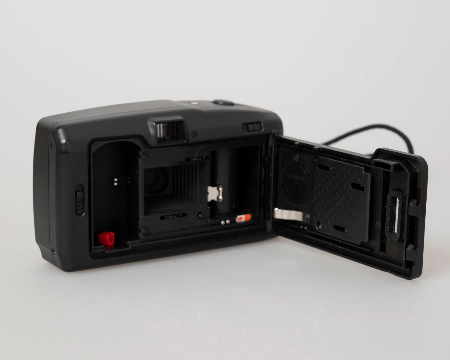 The camera was tested with batteries and film installed and all functions are working correctly (the film was not developed however). Film rewinding is a bit loud but we believe this is due to the design of the camera rather than any fault. The camera is in good cosmetic condition (see photos). We haven’t tested the date imprinting option (it requires a lithium battery). The velcro clasp on the included case is quite weak.