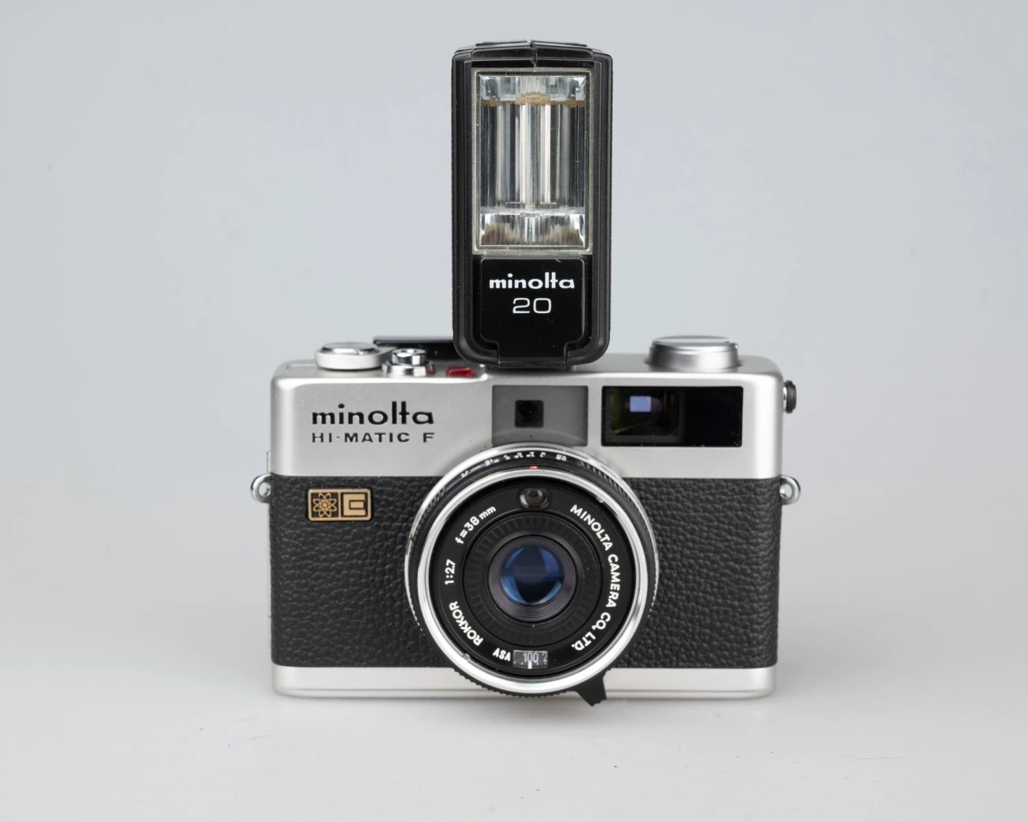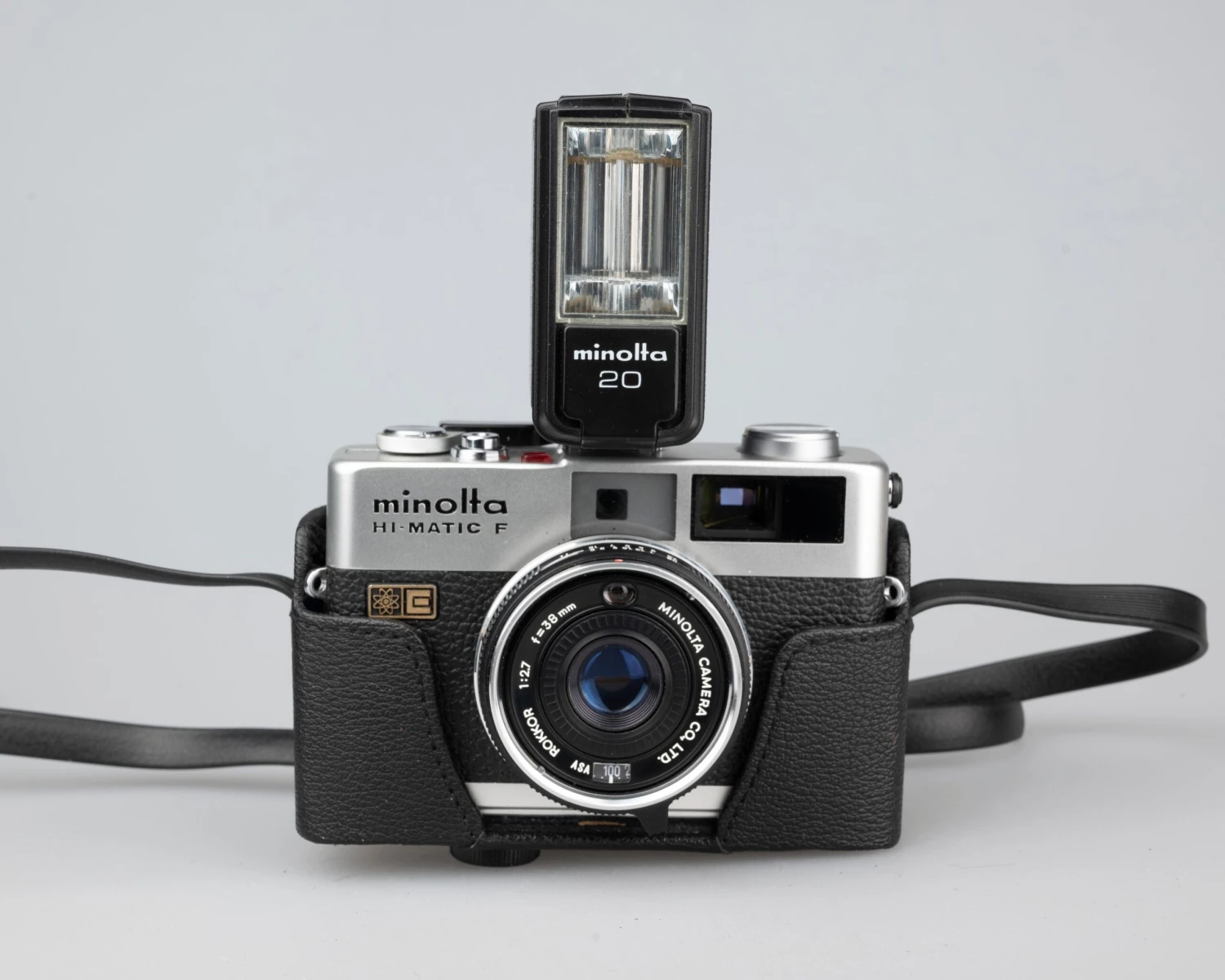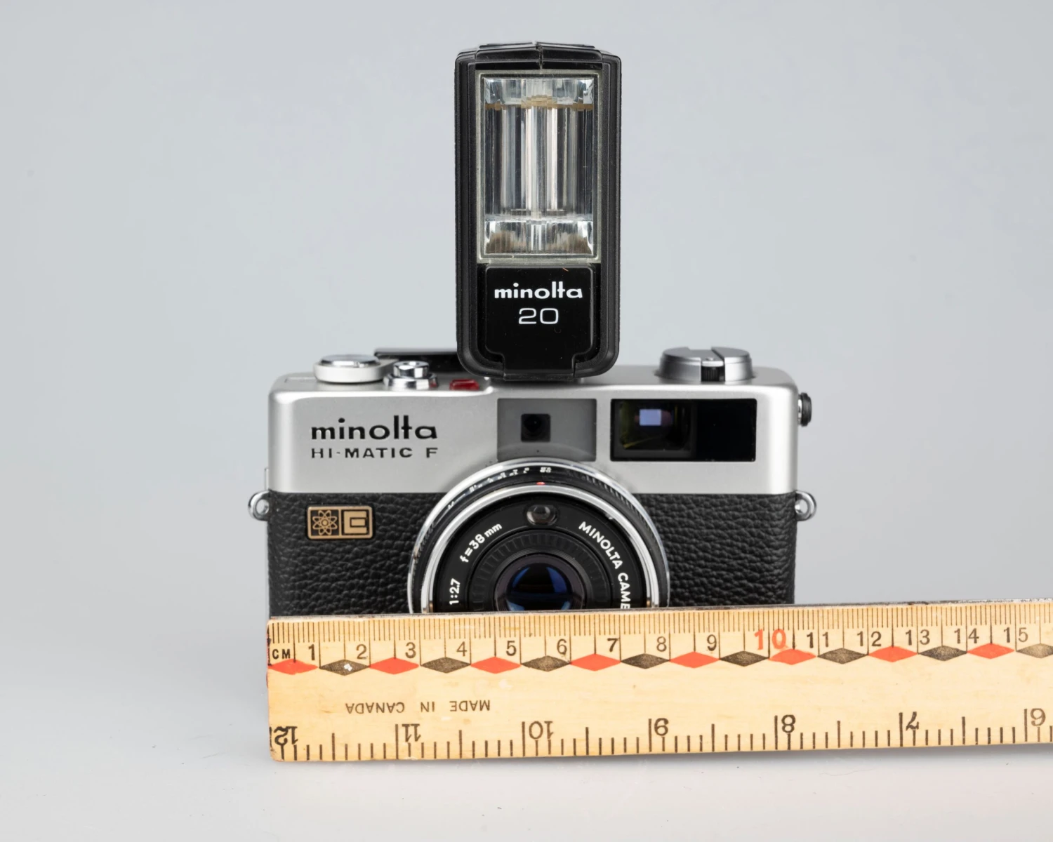 The included Minolta 20 flash (guide no 20 meter/32 feet at ISO 100) is the perfect size for this camera. It includes a case with attaches to the Hi-Matic F’s strap. The camera’s flash mode is very clever and easy to use: when the flash is attached, the aperture is automatically adjusted based on the distance of the subject (see the manual linked below for more info).