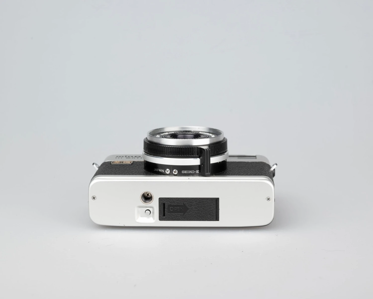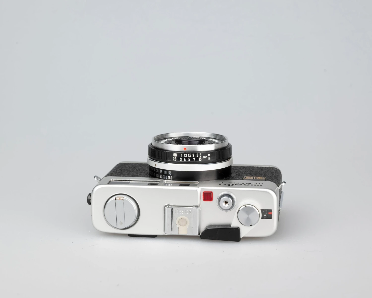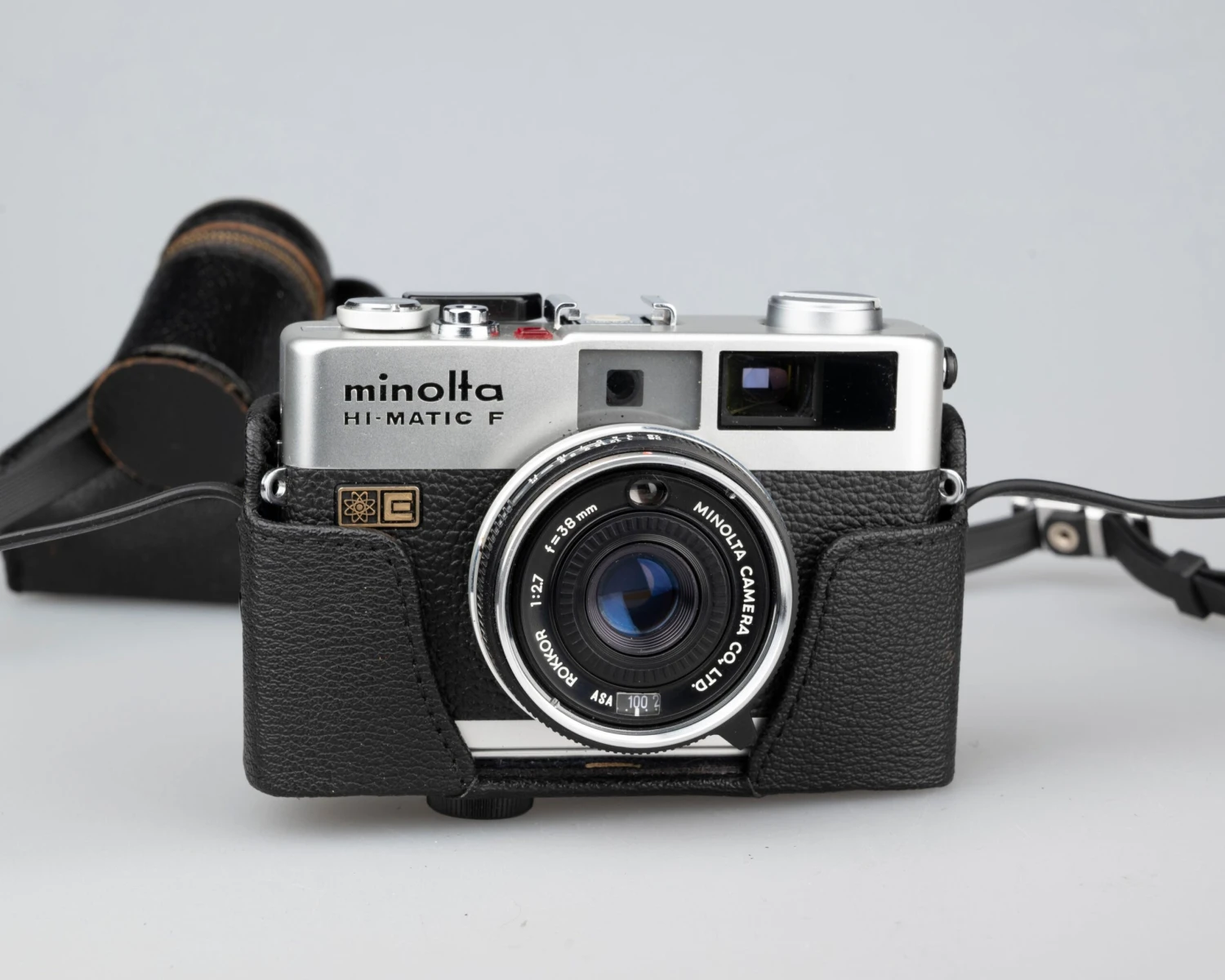 The Minolta Hi-Matic F is a lightweight and very compact 35mm rangefinder from the 1970s. It’s nearly as easy to use as a point-and-shoot but, in our experience, will give you a higher percentage of good photos (a rangefinder can’t be ‘fooled’ like a point-and-shoot’s autofocus).