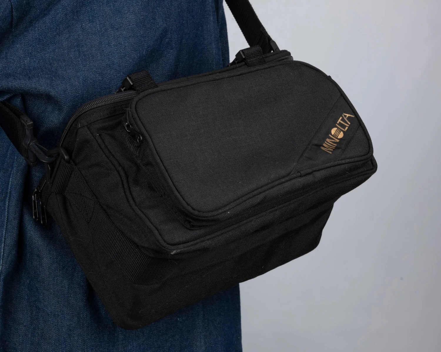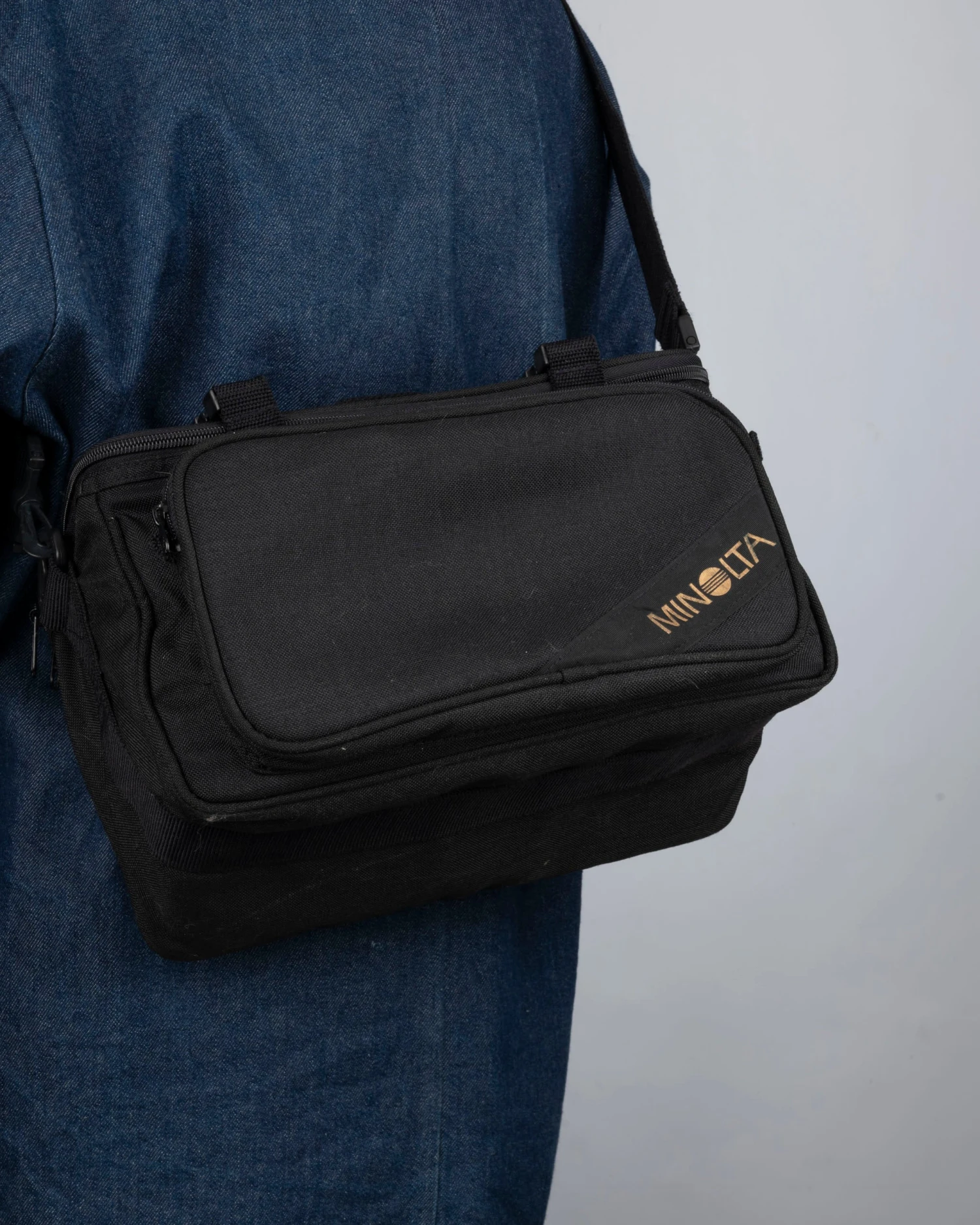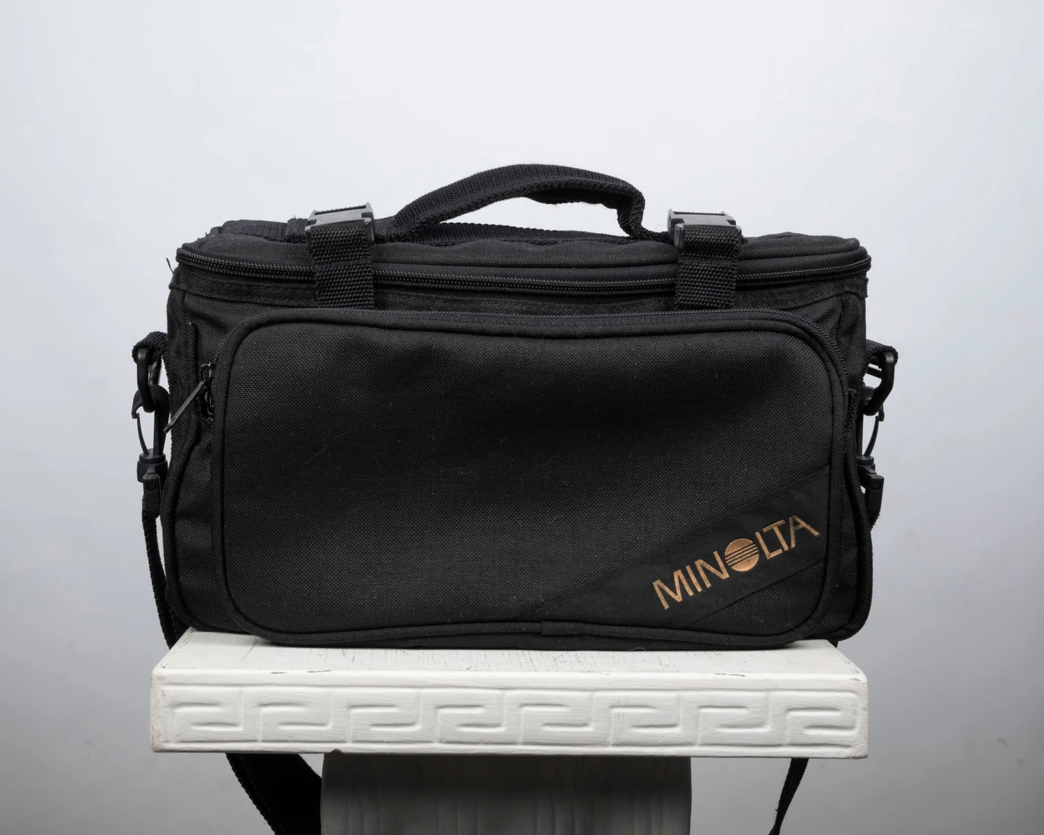 This is a vintage 1980s large Minolta camera shoulder bag. It features an adjustable main compartment as well as zippered front and back pockets.