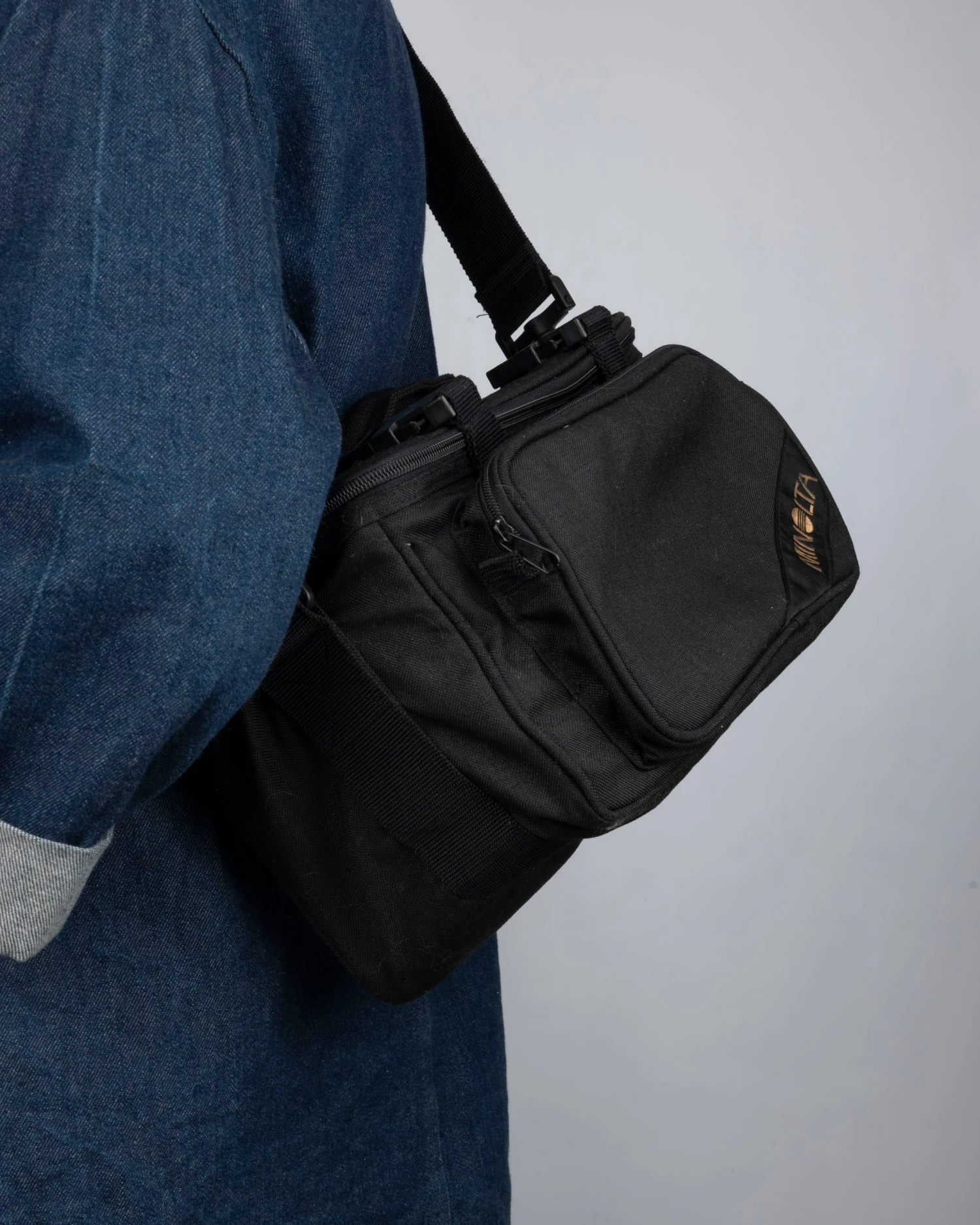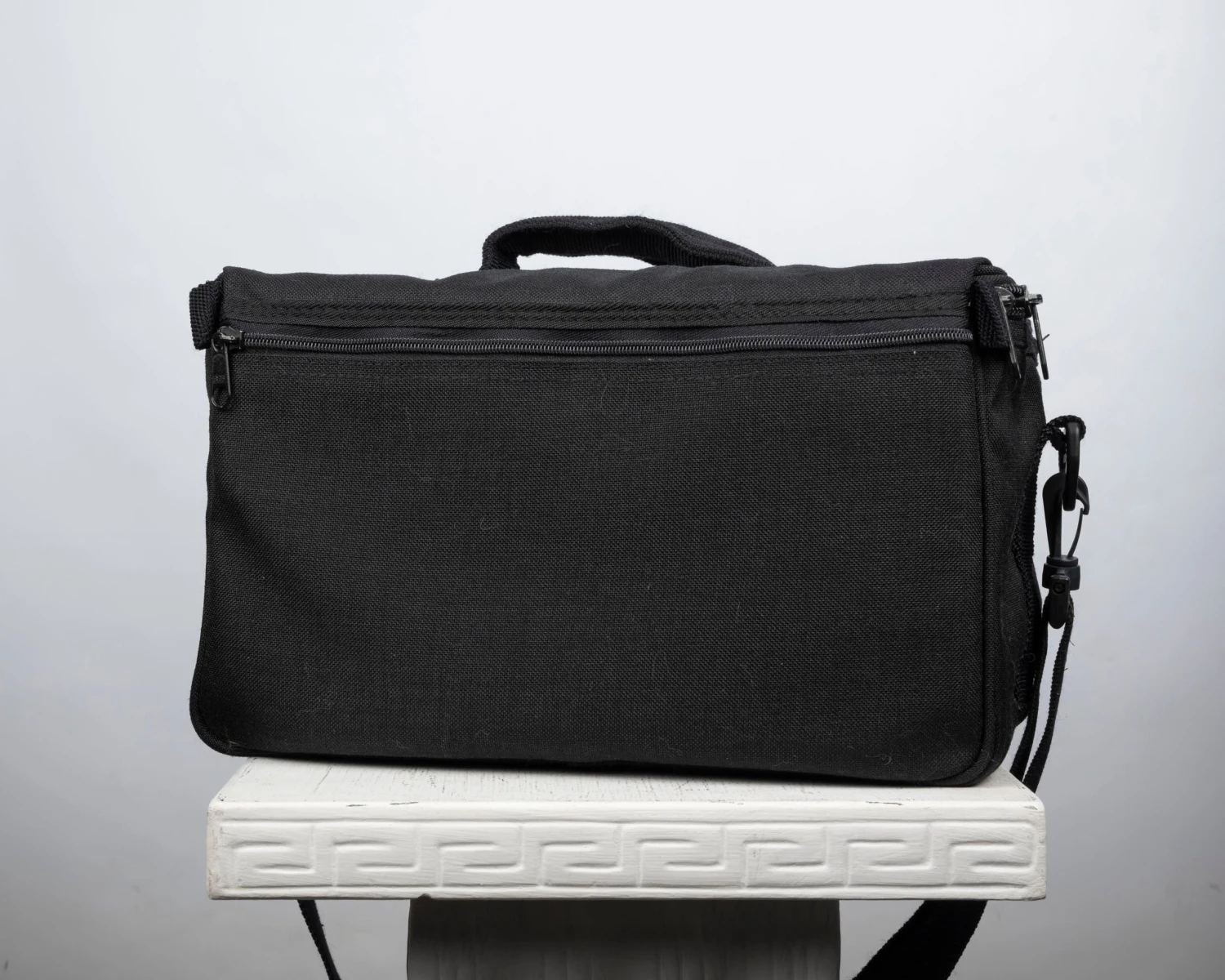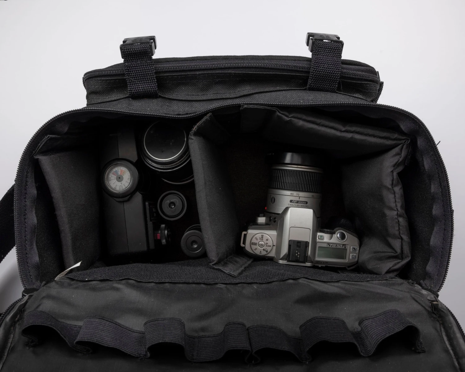 This is a vintage 1980s large Minolta camera shoulder bag. It features an adjustable main compartment as well as zippered front and back pockets.