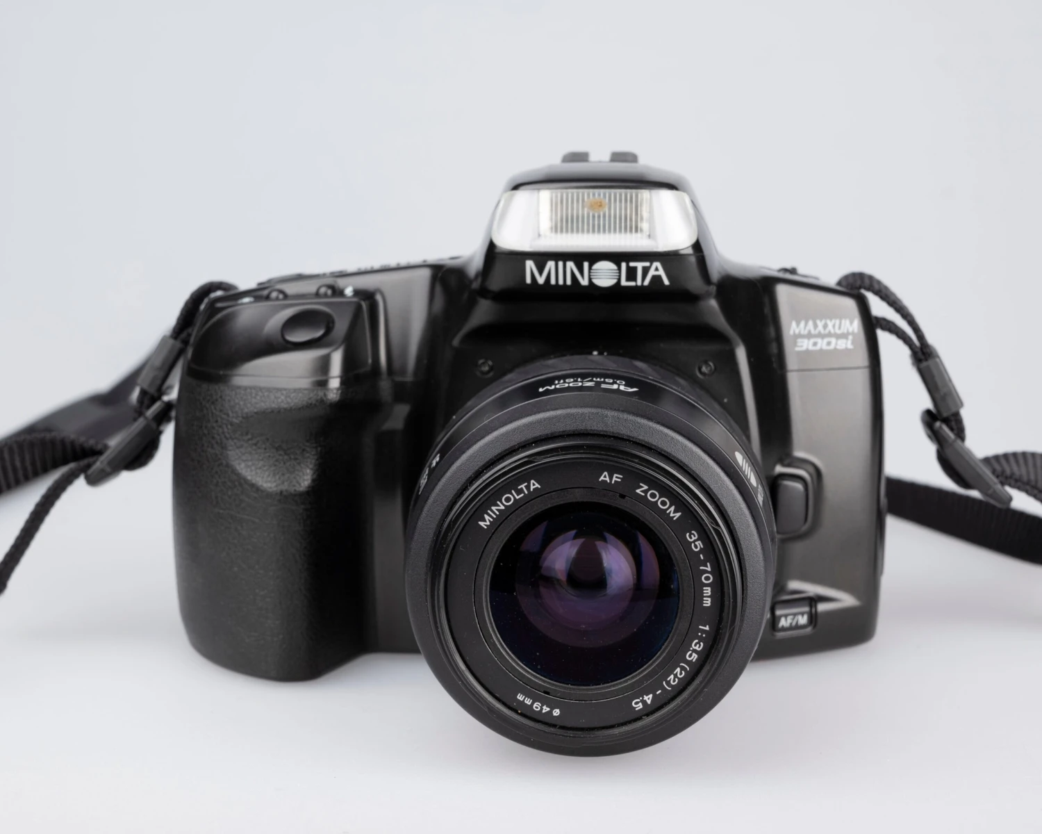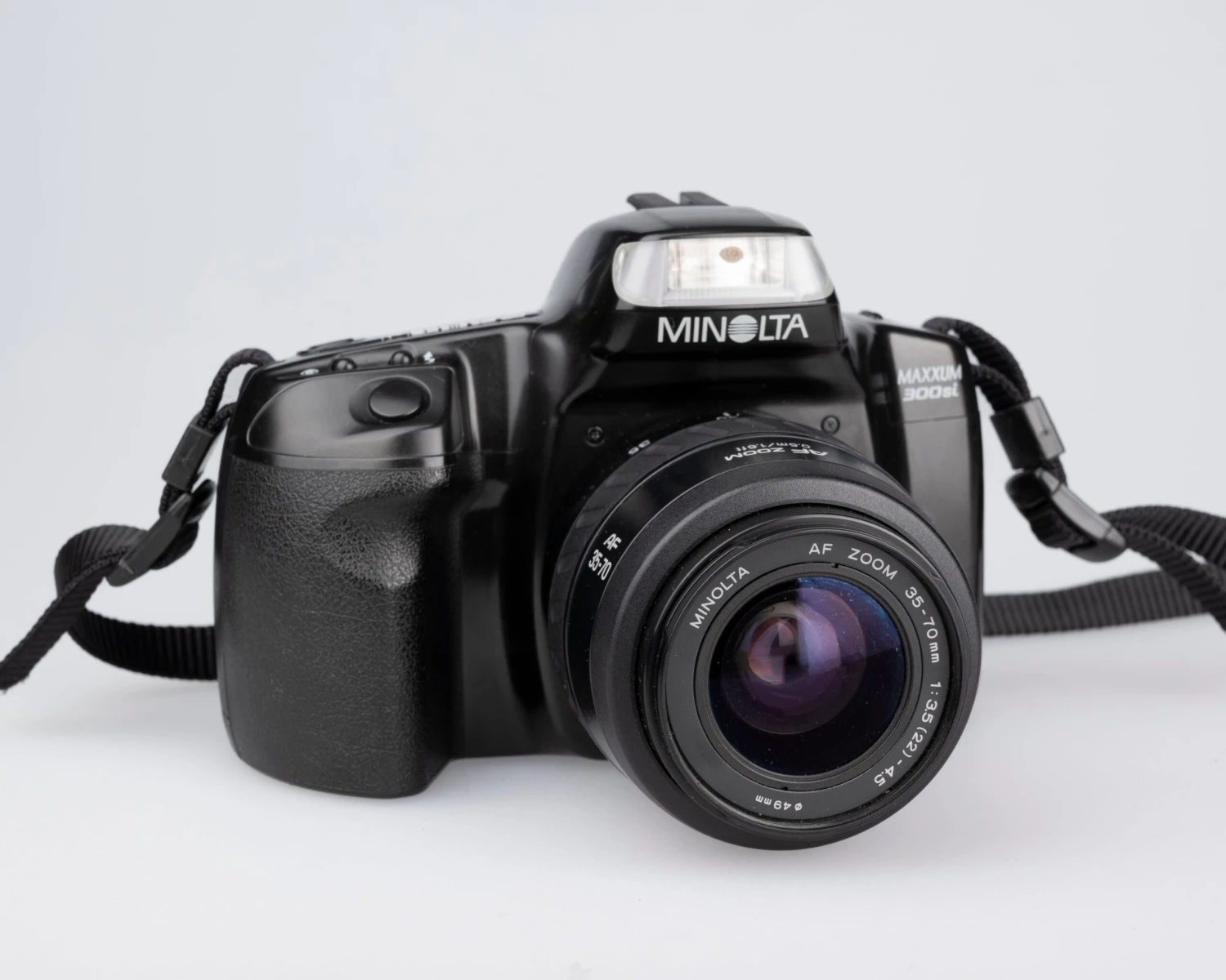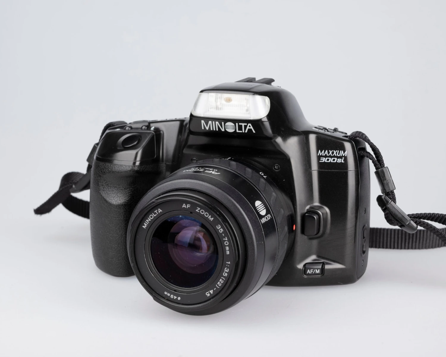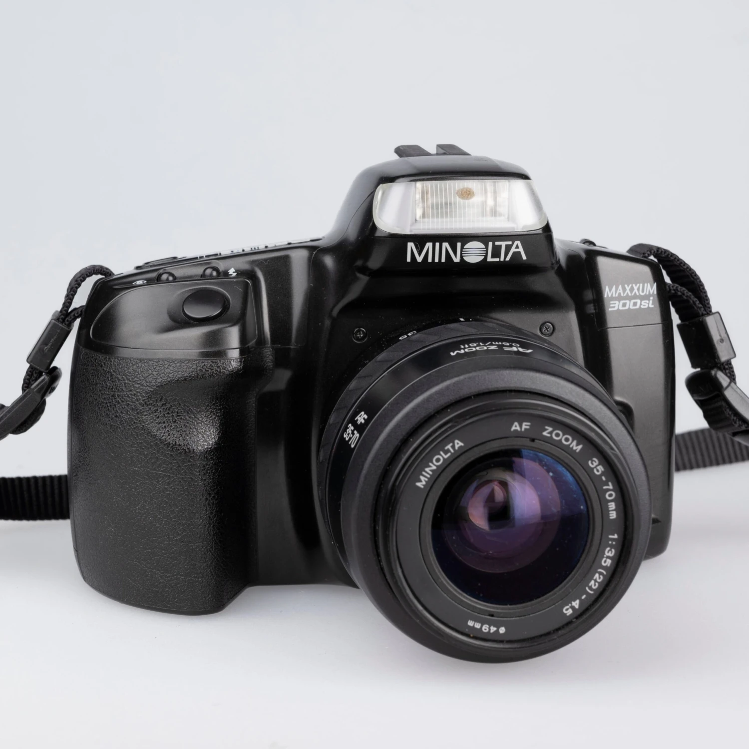 The Minolta Maxxum 300si is a versatile, lightweight, and very user-friendly 35mm film SLR from the mid 1990s. It features a very compact and flexible 35-70mm lens. Here’s how Popular Phototography described it in their March 1995 issue