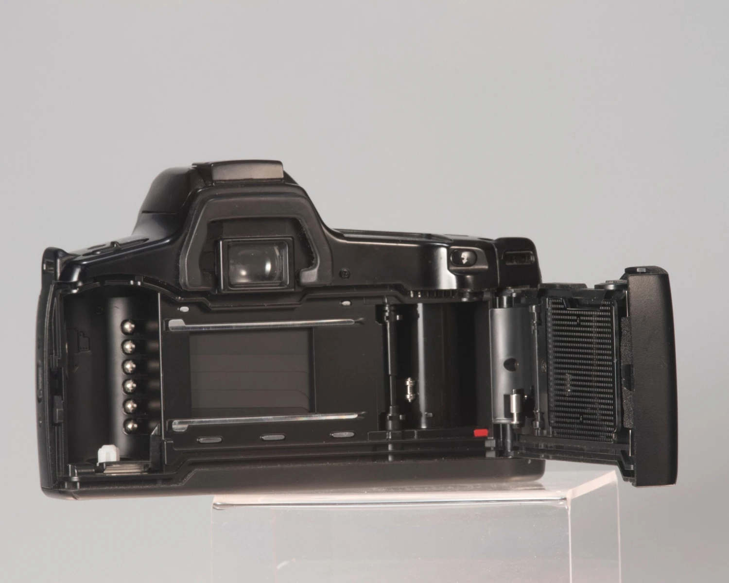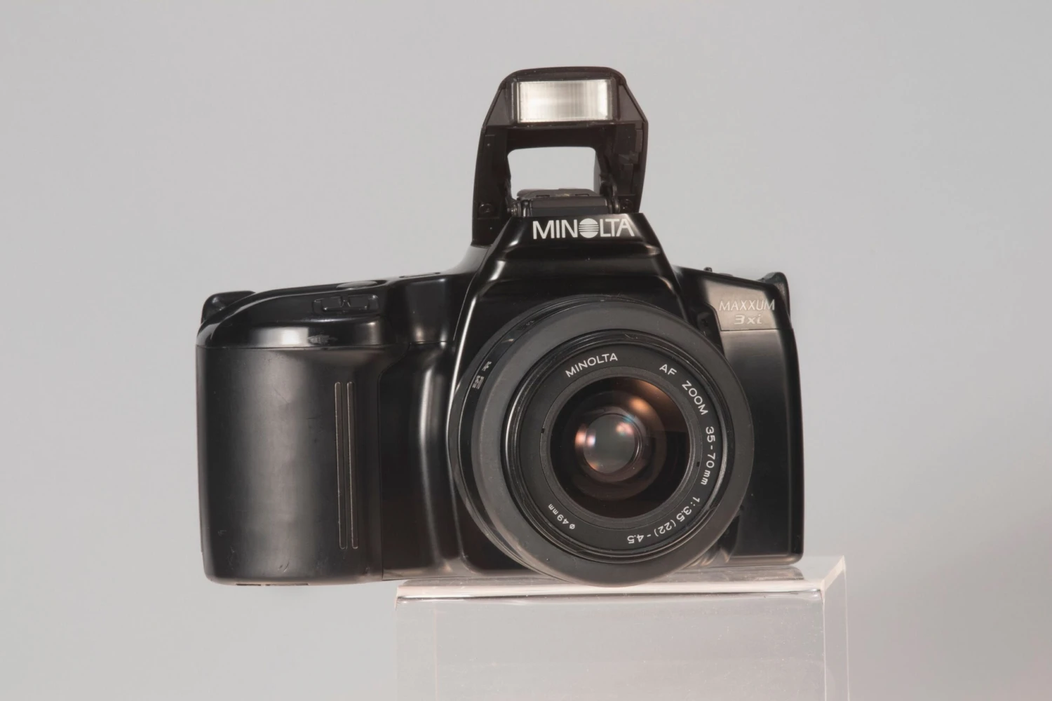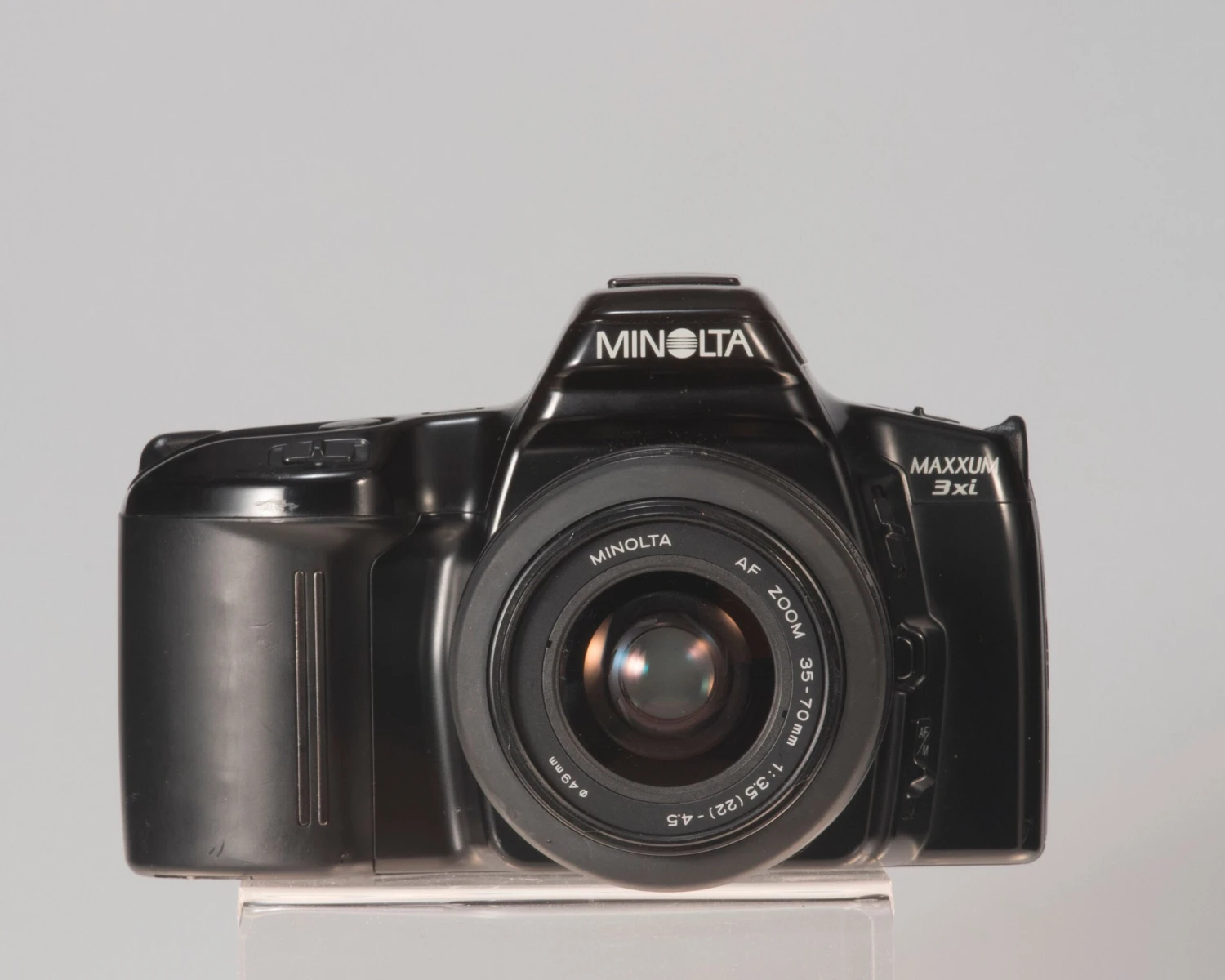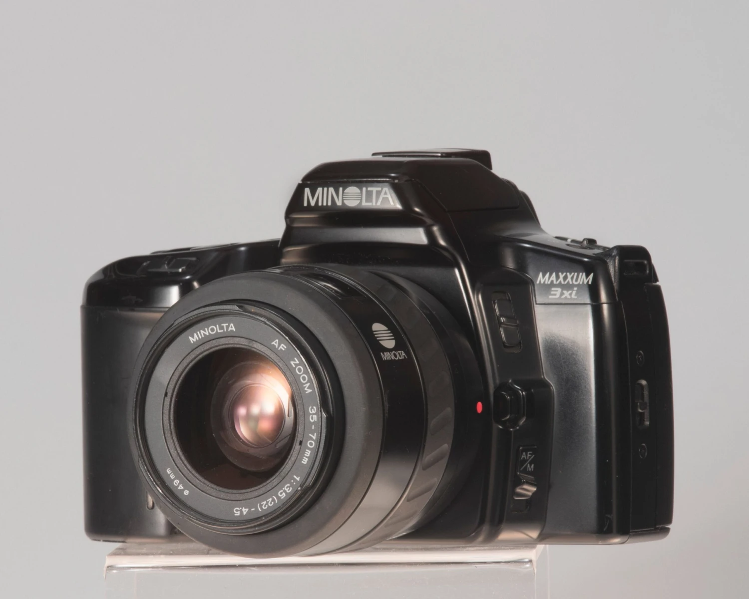 The Minolta Maxxum 3xi is lightweight and easy-to-use 35mm film SLR camera from the early 90s. It feature full manual, shutter priority, aperture priority, and program exposure modes. The included lens is a flexible 35-70mm f3.5-4.5 autofocus zoom. It also features a pop-up integrated flash.