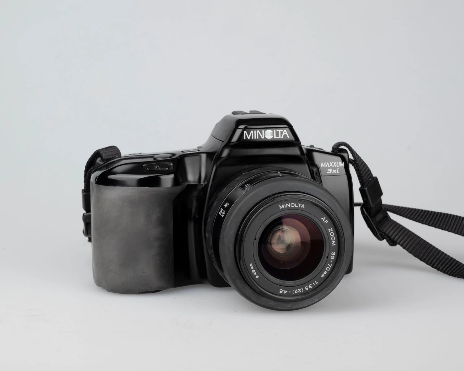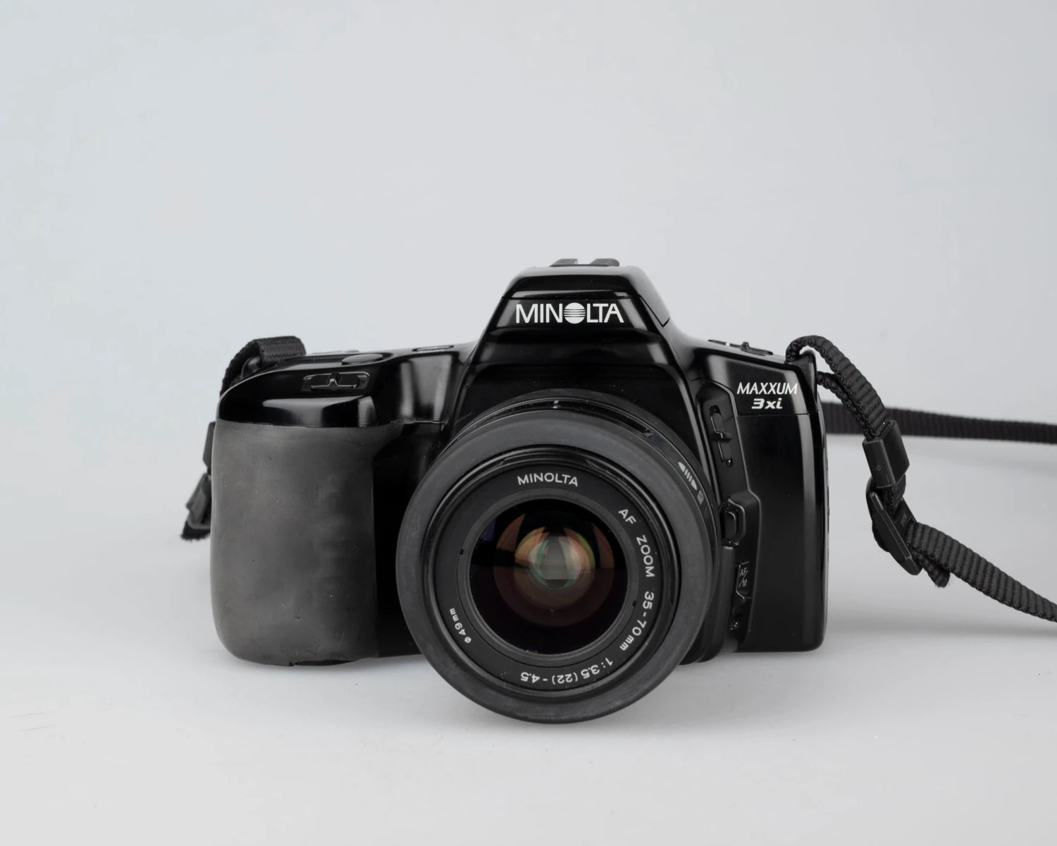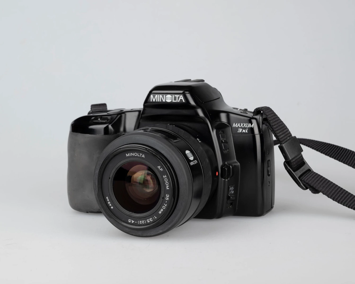 The Minolta Maxxum 3xi is lightweight and easy-to-use 35mm film SLR camera from the early 90s. In its auto mode, it’s as easy to use as a point-and-shoot, but it’s still well-appointed with advanced features. It offers full manual, shutter priority, aperture priority, and program exposure modes. The included lens is a flexible 35-70mm f3.5-4.5 autofocus zoom. It also features a pop-up integrated flash.