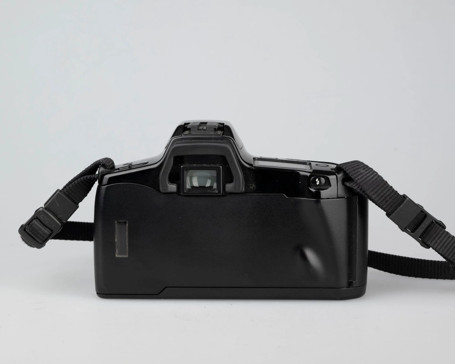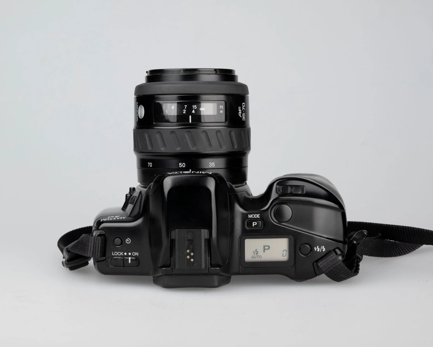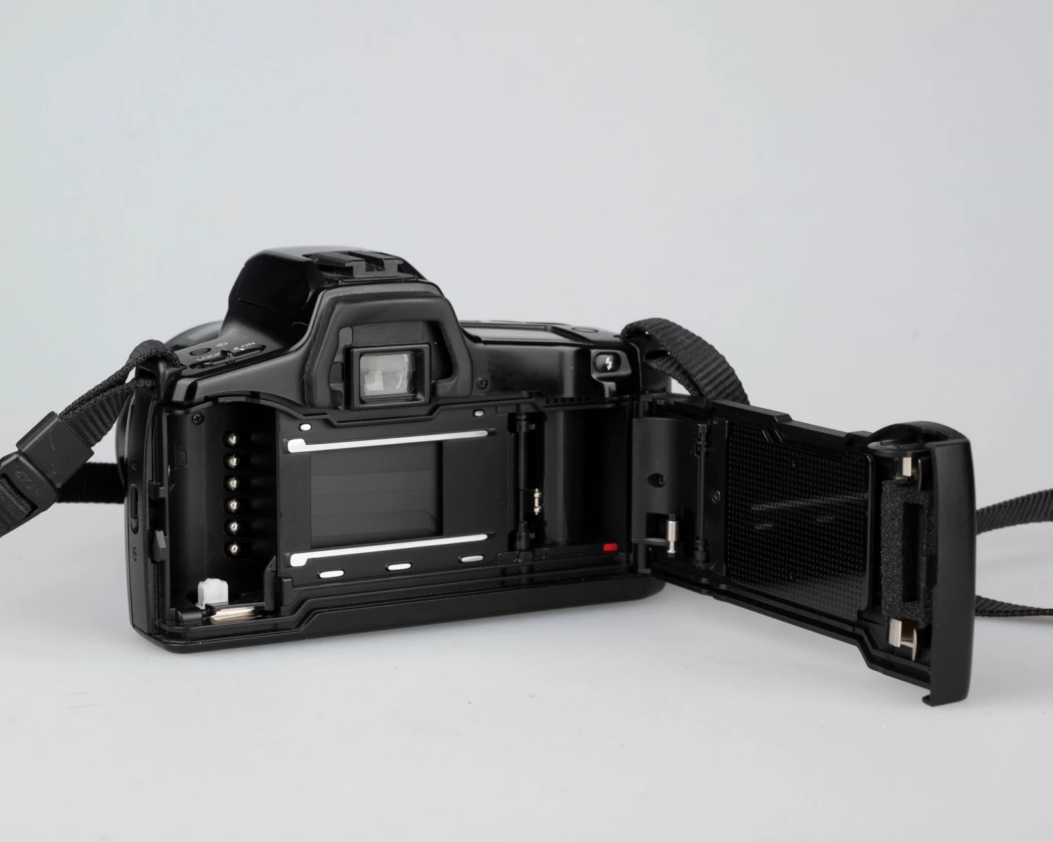 The Minolta Maxxum 3xi is lightweight and easy-to-use 35mm film SLR camera from the early 90s. In its auto mode, it’s as easy to use as a point-and-shoot, but it’s still well-appointed with advanced features. It offers full manual, shutter priority, aperture priority, and program exposure modes. The included lens is a flexible 35-70mm f3.5-4.5 autofocus zoom. It also features a pop-up integrated flash.