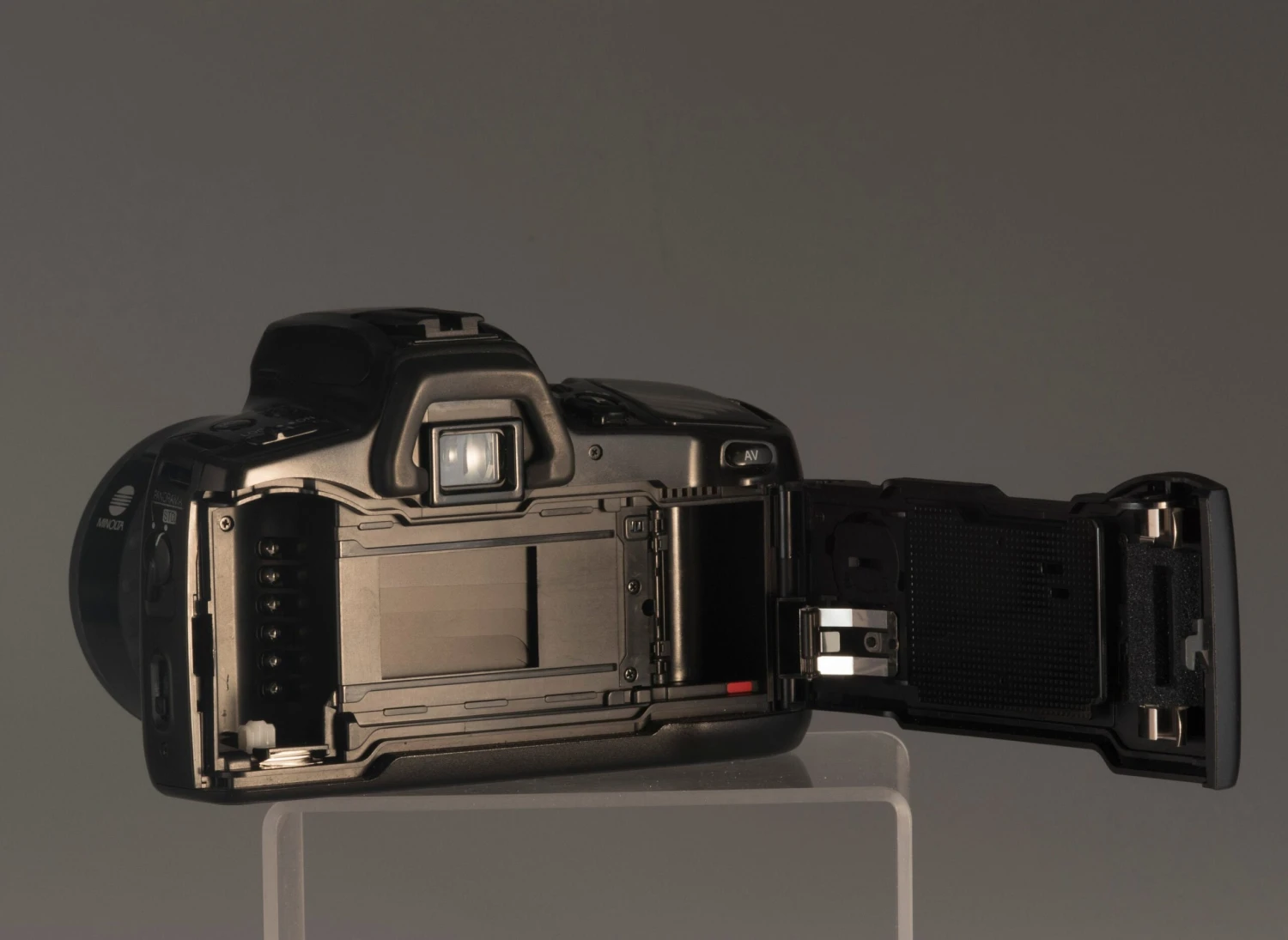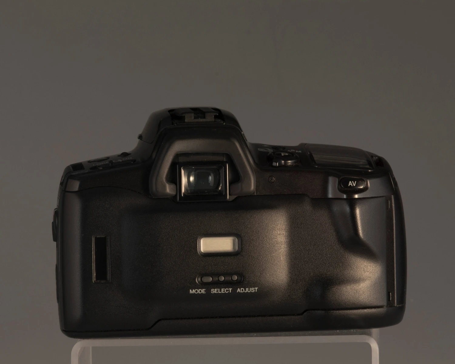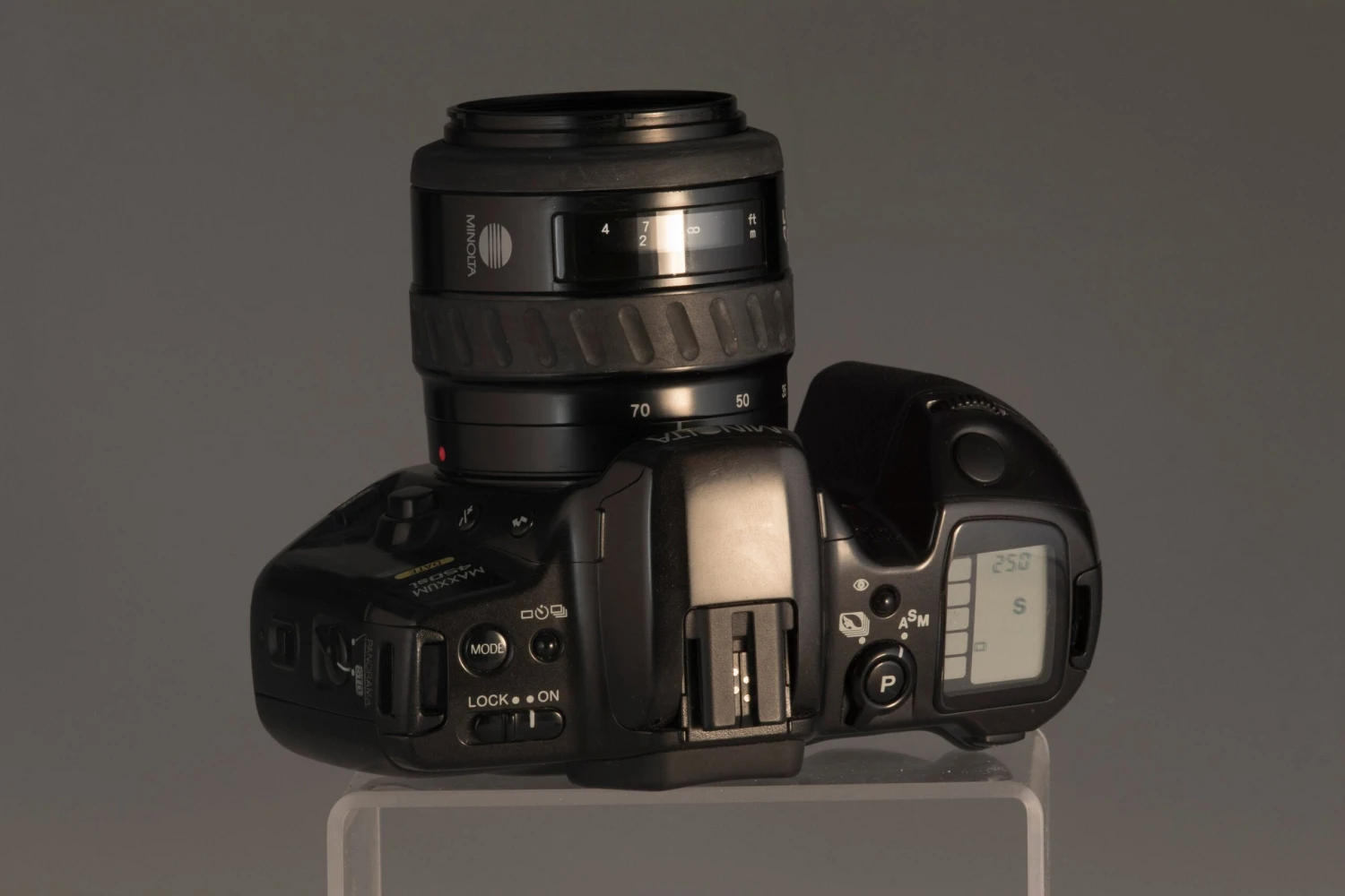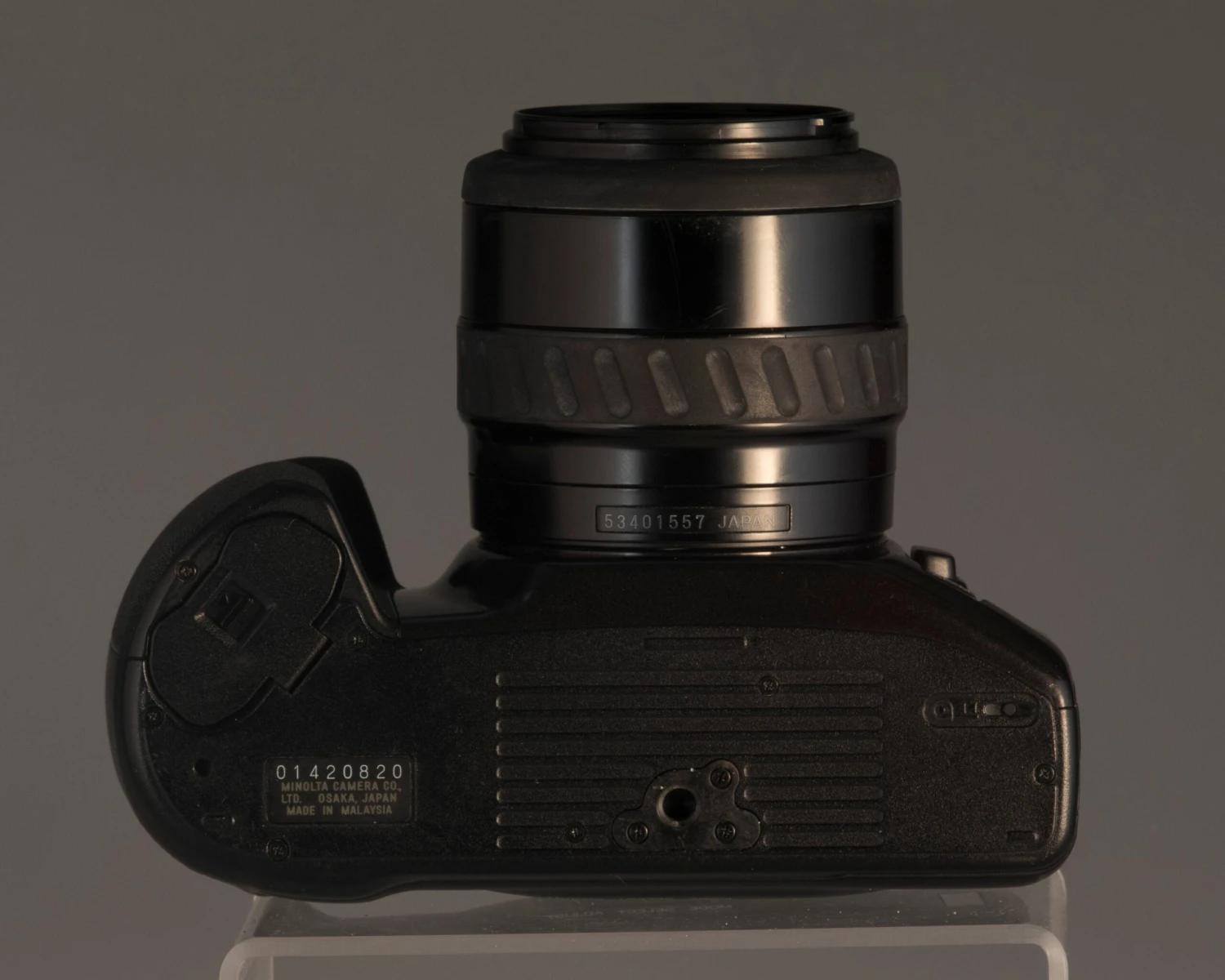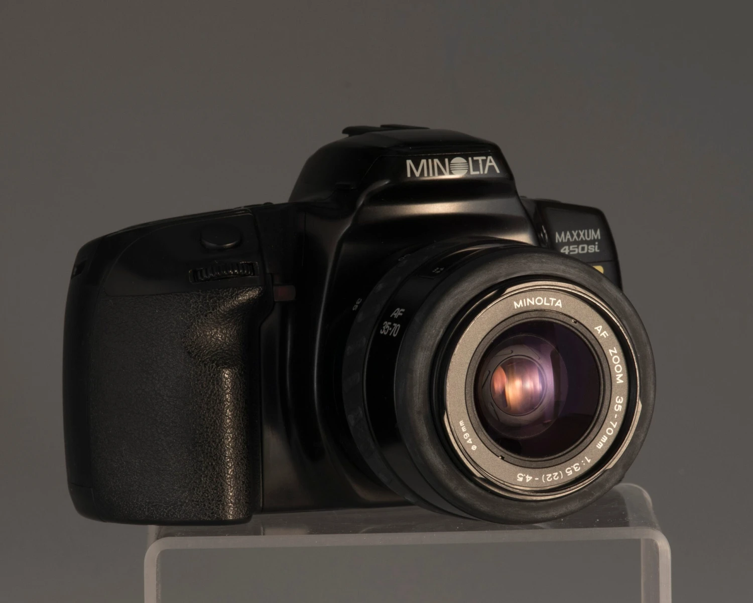 The Minolta Maxxum 450si is a sophisticated 35mm film SLR camera from the early 90s. It feature full manual, shutter priority, aperture priority, and program exposure modes. The included lens is a flexible 35-70mm f3.5-4.5 autofocus zoom. It also features a pop-up integrated flash.