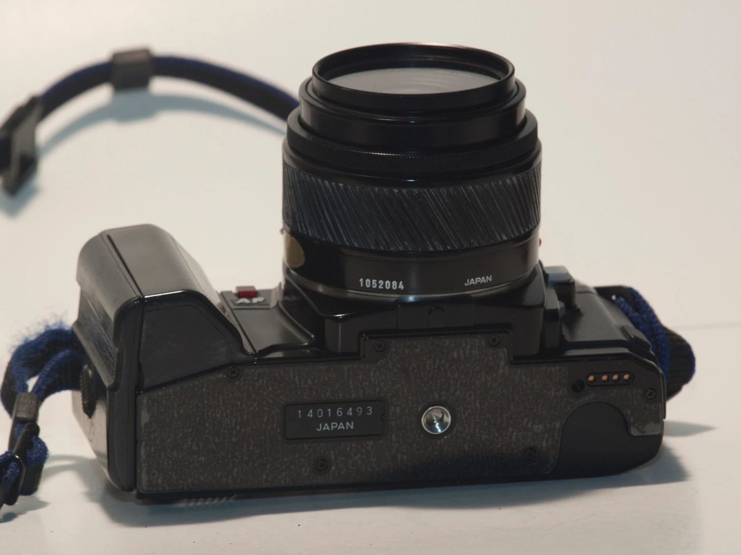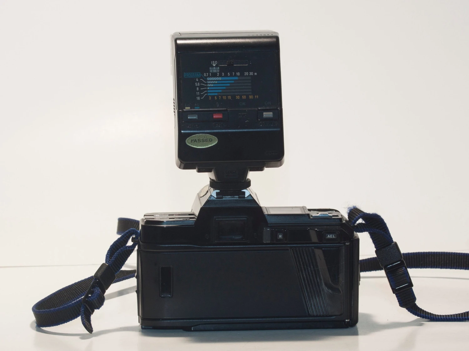 The camera takes Minolta A mount lenses which continue to be used in today’s Sony Alpha DSLRs (Sony ended up buying Minolta’s camera technology). This particular example (serial number 14016493) is one of the rarer ‘crossed x’ versions (Exxon sued Minolta over this). It comes with a powerful Minolta AF 2800 flash (guide number 92ft@ISO 100, supports TTL exposure, and provides low-light auto-focus assistance) with its case and a Minolta AF 28mm f2.8 lens (5 elements in 5 groups). This wide angle lens is ideal for street photography. The camera is powered by four AAA batteries (not included); the flash is powered by four AA batteries (also not included).
