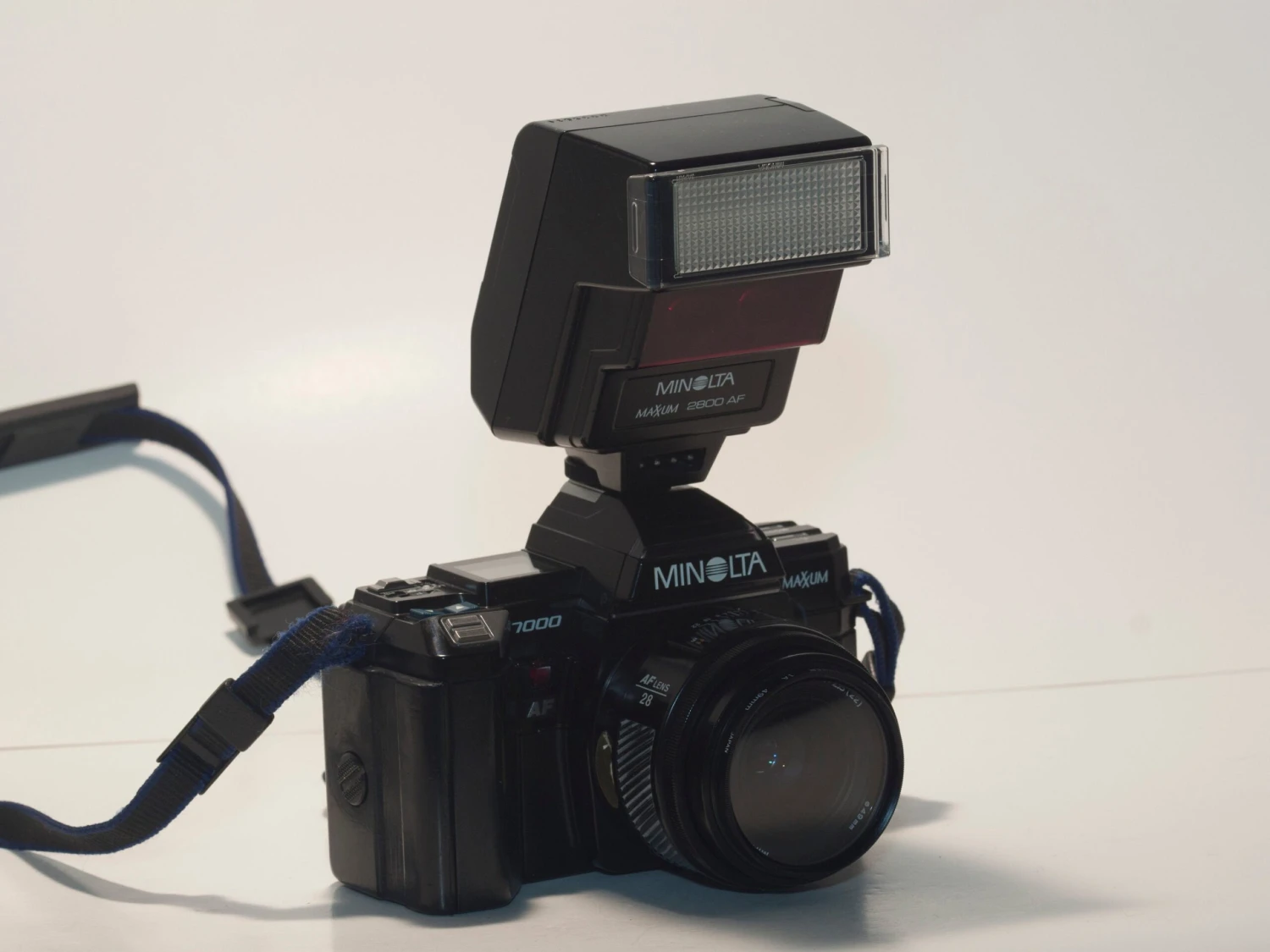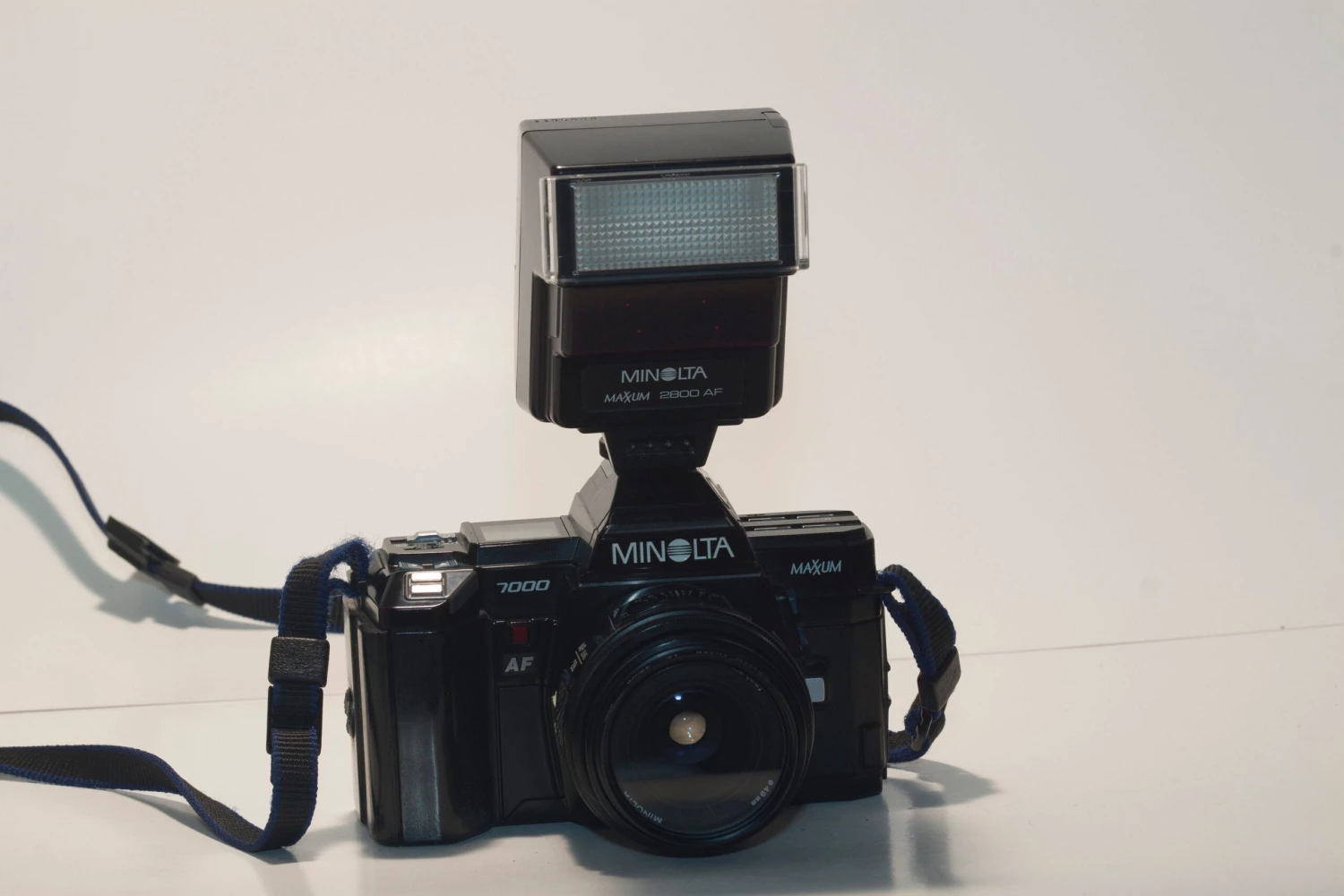 This Maxxum 7000 and the included lens and flash were tested with film and performed superbly. All shutter speeds are working with good accuracy. The camera’s LCD display has blackened along its borders (see photos, this is a very, very common occurrence with these cameras) but all the modes are still readable. The camera’s internal lithium battery was recently changed and should last for another 10 years. The included lens is in very good condition but the rubber trim has white discoloration (an almost universal aesthetic flaw with Minolta lenses of from this era).